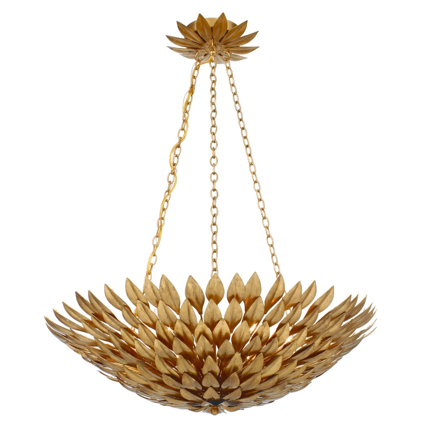 The Alysa Pendant showcases artistry and elegance with its handcrafted wrought iron leaves, forming a striking floral silhouette. Finished in warm antique gold, it adds sophistication while maintaining a light, airy presence. With a generous 24.5″ diameter, this pendant makes a statement in dining rooms, foyers, or living spaces while providing ample illumination. The included 72″ chains allow for adjustable hanging height, ensuring a perfect fit for your space.