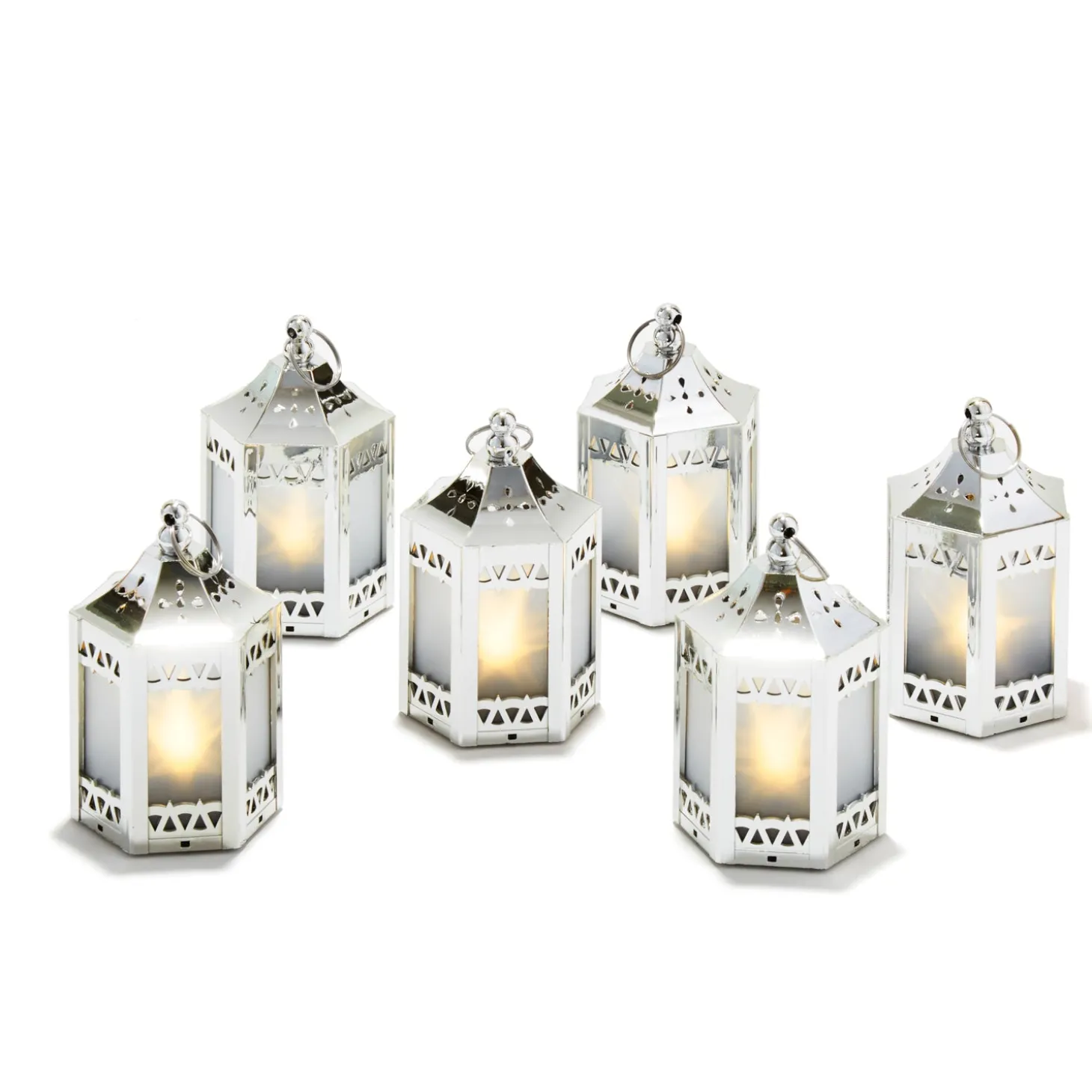 This set includes six intricate silver mini lanterns. Each petite lantern features translucent windowpanes, revealing a twinkling holographic star. A decorative, yet practical loop crowns the tapered top, and a fun keyhole pattern adorns each of the faceted sides. Hang as ornaments, use as part of a beautiful tablescape, or arrange along pathways and covered porches for a festive touch. Perfect for home, weddings, churches, restaurants, and events.