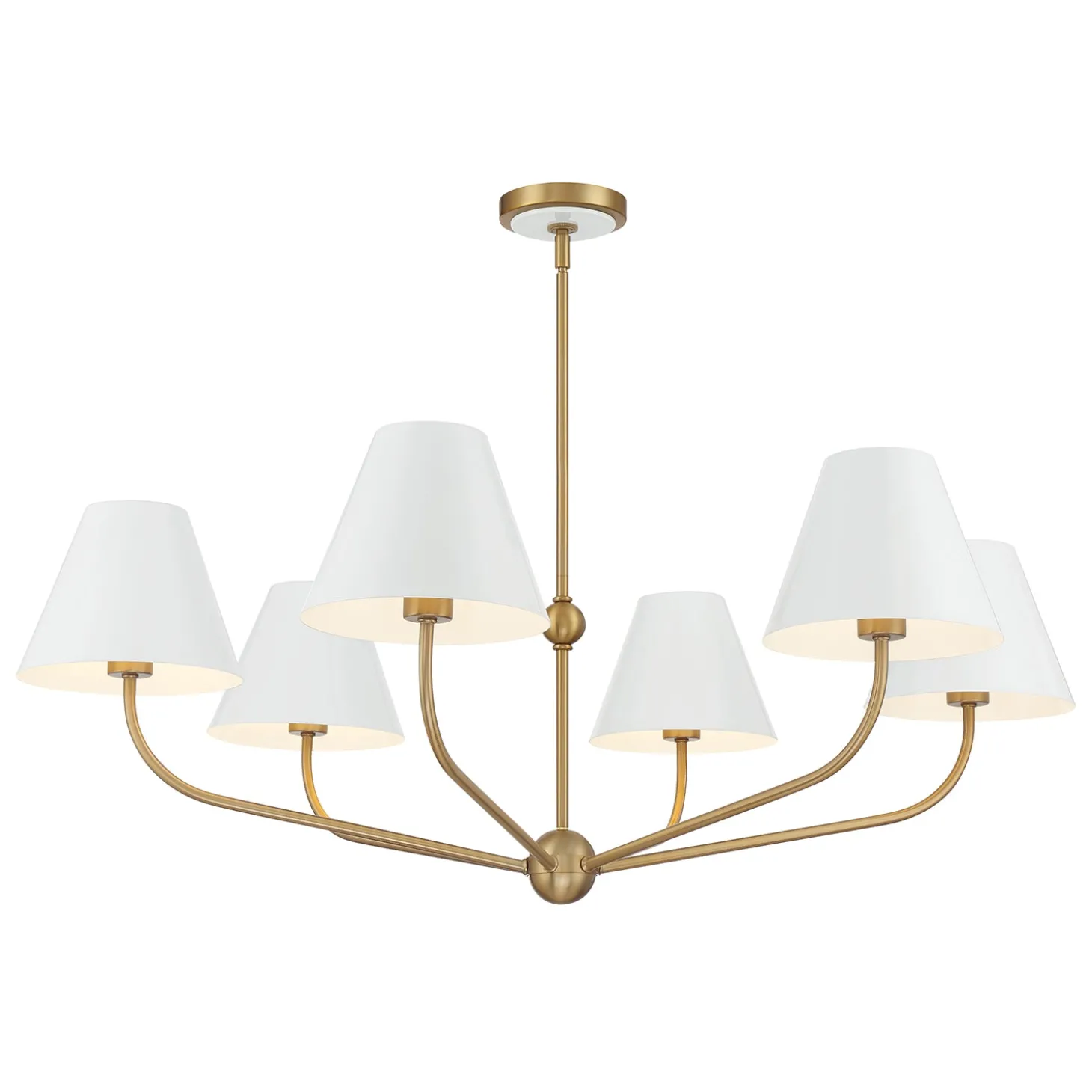 The Banks 6 Light Chandelier brings refined sophistication to dining rooms, entryways, or open living spaces. Featuring six white conical metal shades, this 40″ fixture offers soft, even illumination, while warm brass accents add a touch of timeless luxury. Its elegant proportions and balanced scale make it a perfect focal point, adding character and style to any room without overwhelming the space. This chandelier combines classic color with premium materials, creating a statement piece that complements a variety of interior styles.