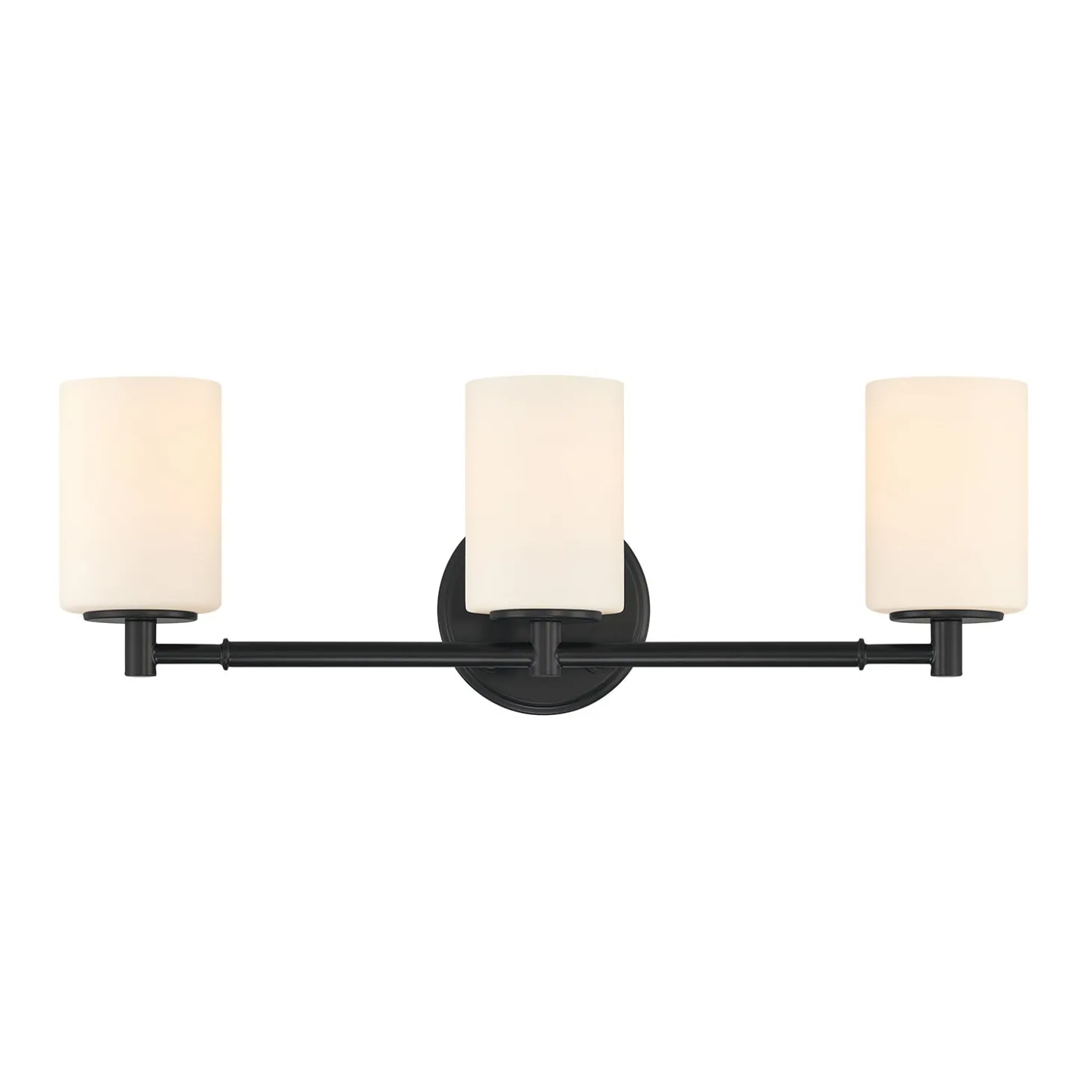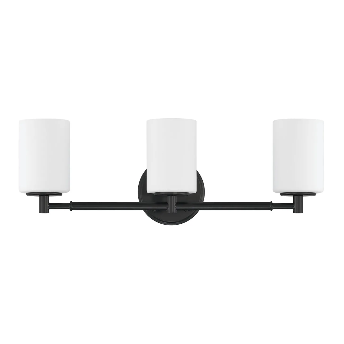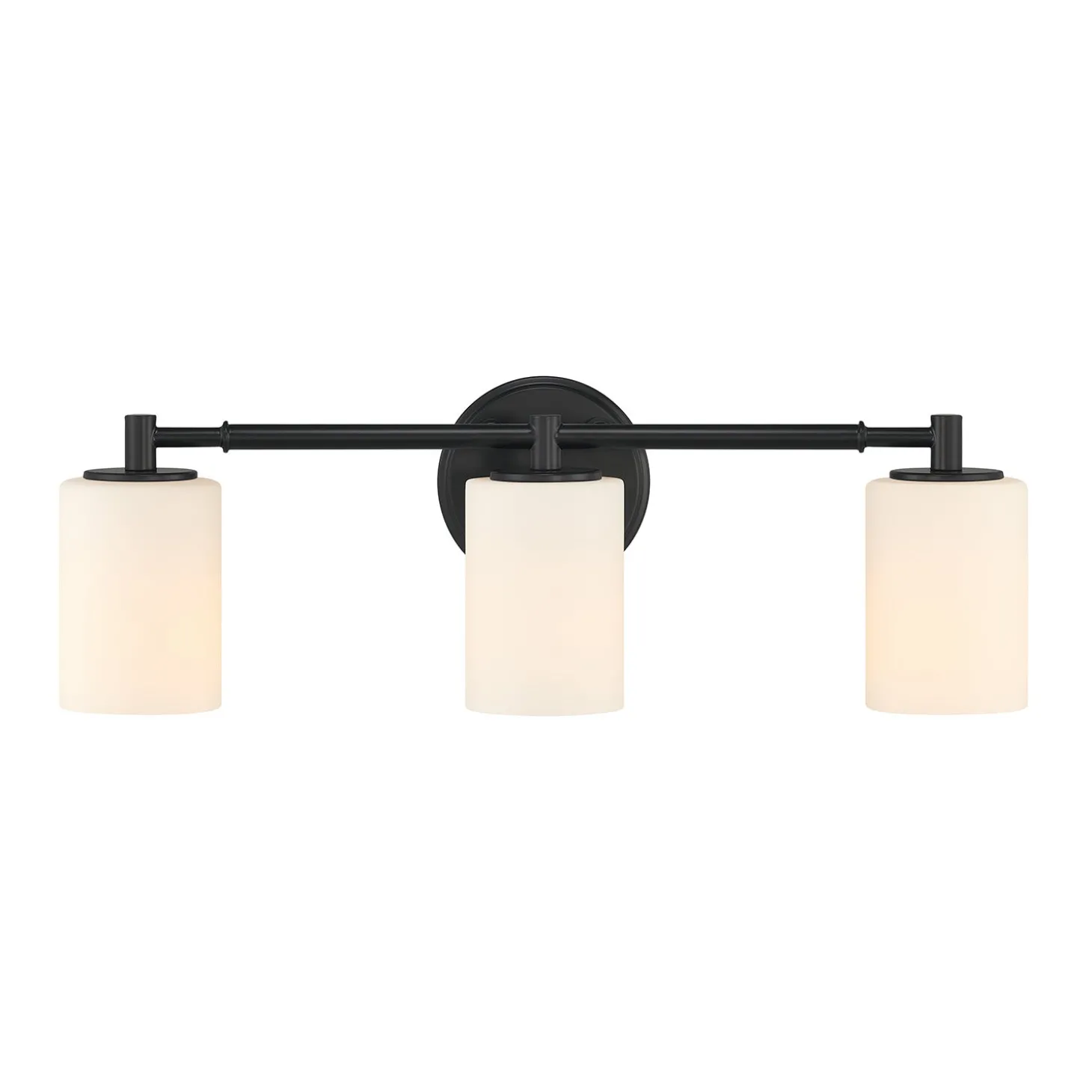 The Becca Vanity light references a classic silhouette paired with a modern, sleek finish in distinctive matte black. Versatile and stylish, this transitional bath light with three opal glass shades makes a wonderful addition to your primary bathroom vanity and adds sophistication to your guest powder room. Featuring a tubular crossbar and round backplate with refined, subtle detailing, this 24” wide vanity light provides substantial illumination for your space.