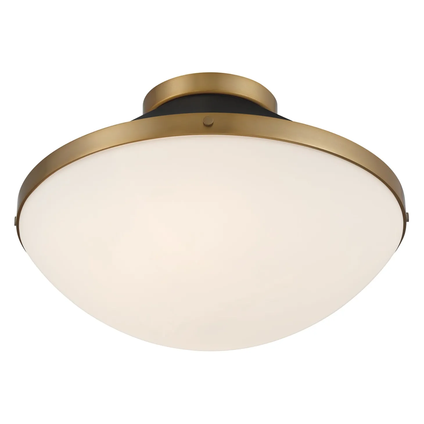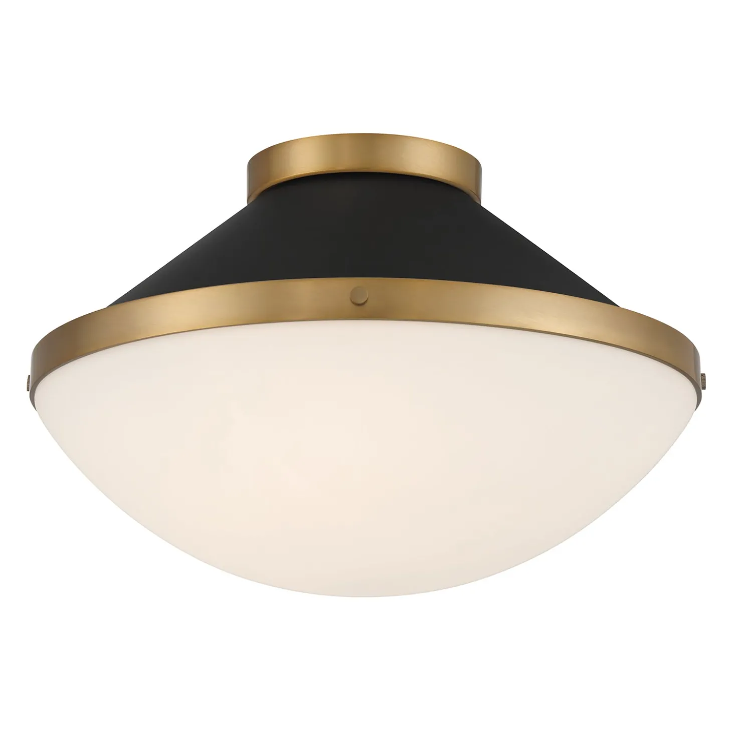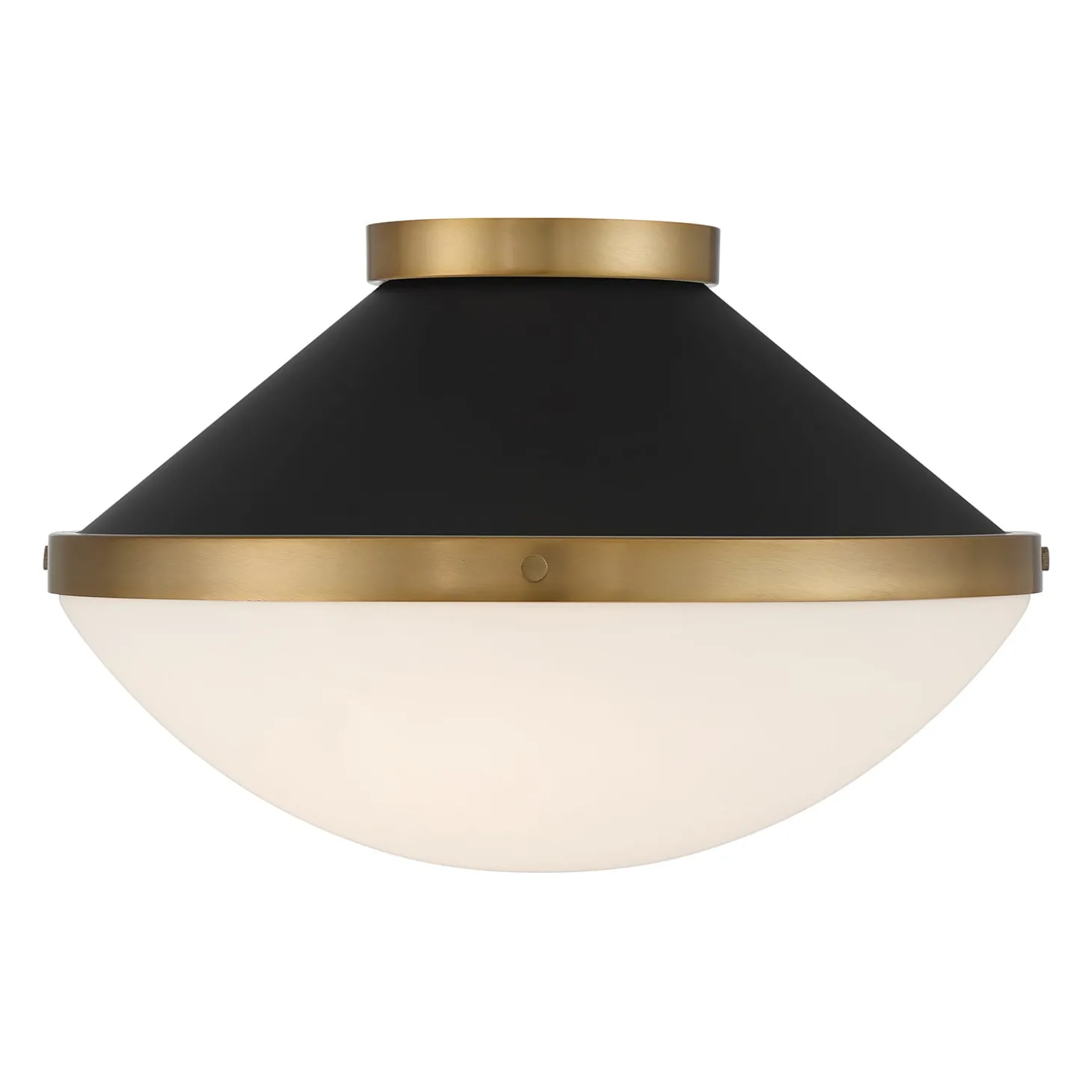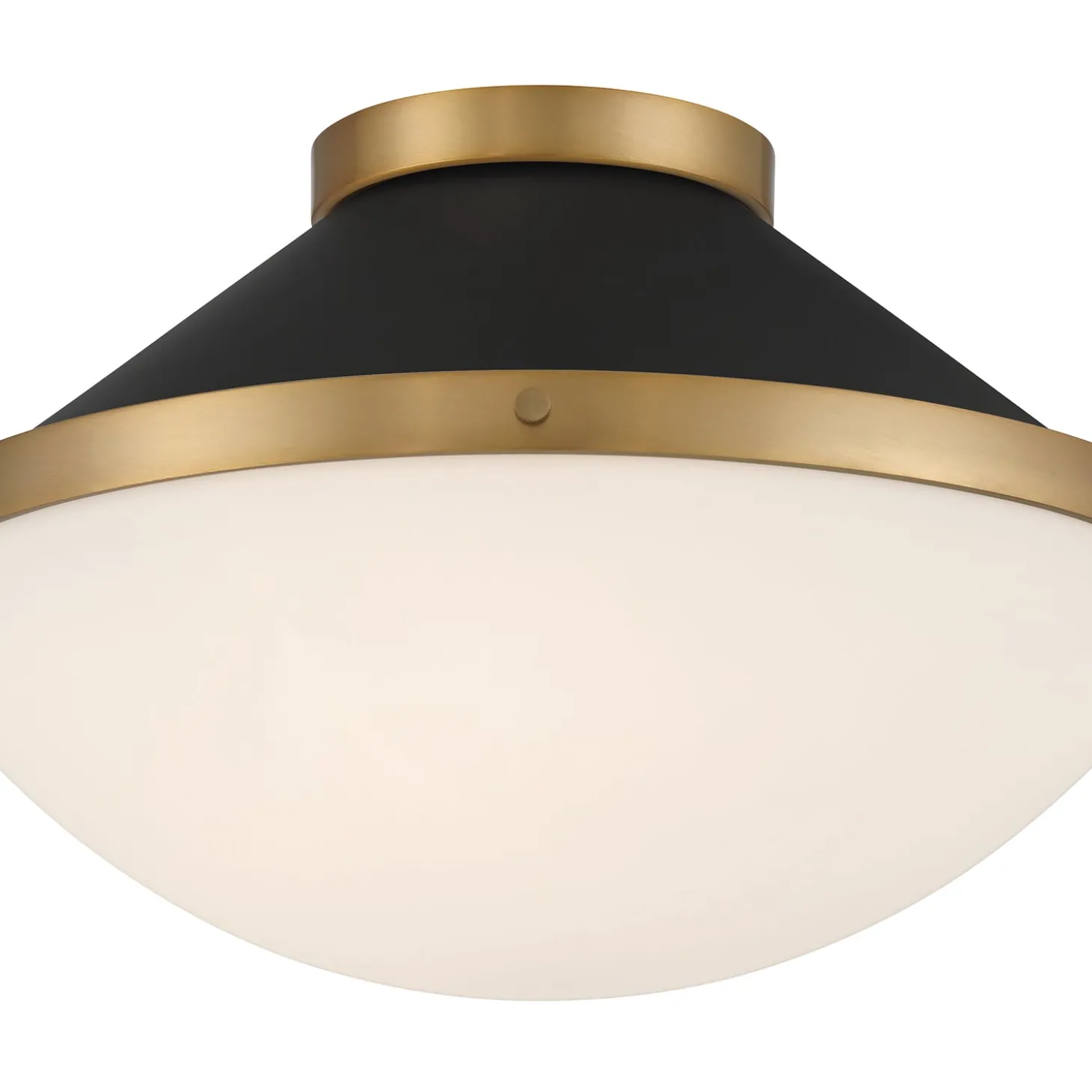 • The Blair Flush Mount features a mid-century inspired design with a matte black frame, white opal glass diffuser, and brass accents