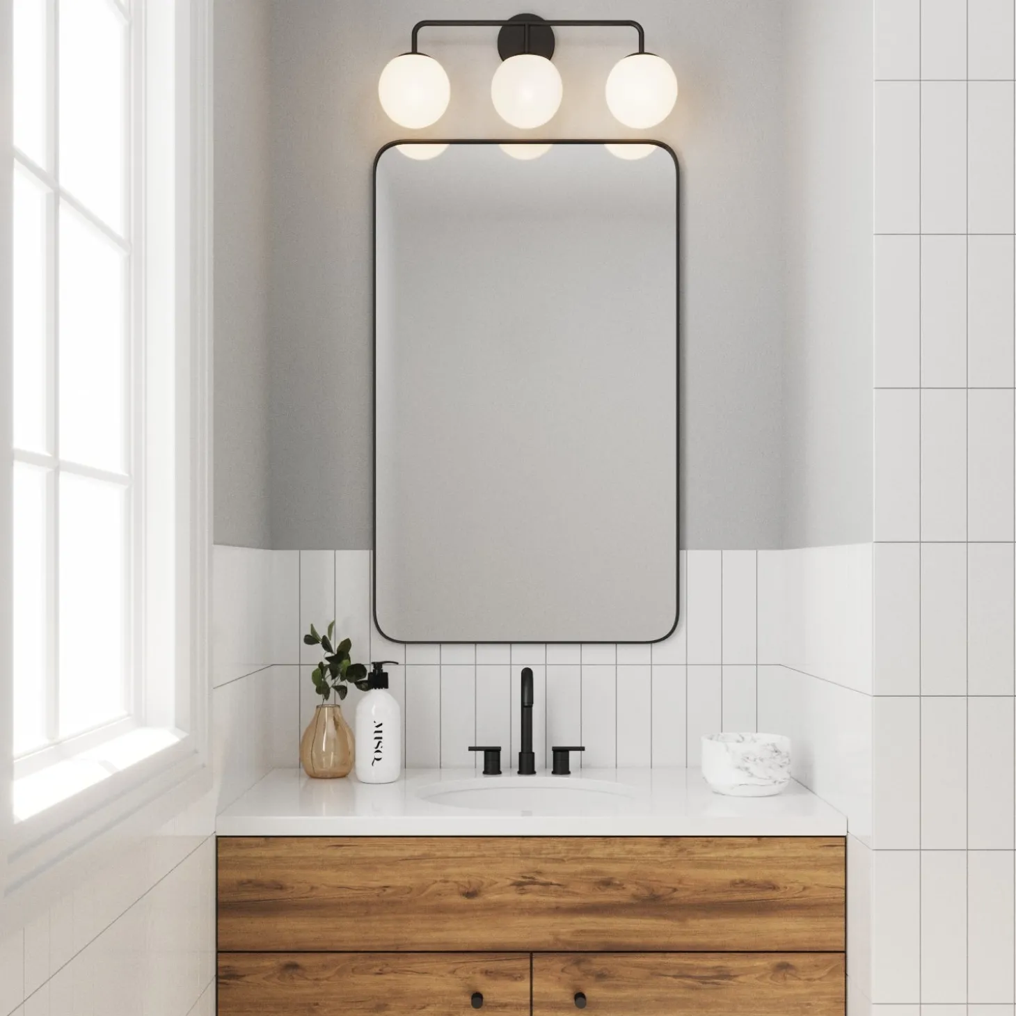 The Castell Vanity Collection references a classic mid-century silhouette paired with a modern, updated finish in distinctive matte black. Versatile and distinct, this contemporary 26″ wide vanity light makes a strong statement on style, perfect for a modern bathroom or vanity. Featuring a stunning profile, this 3-light vanity displays natural symmetry in three beautiful frosted globes and its gently arched arms. Glamorous and distinct, the Castell Collection fixtures are ideal for chic urban spaces but fit in beautifully in design schemes that evoke vintage romance.