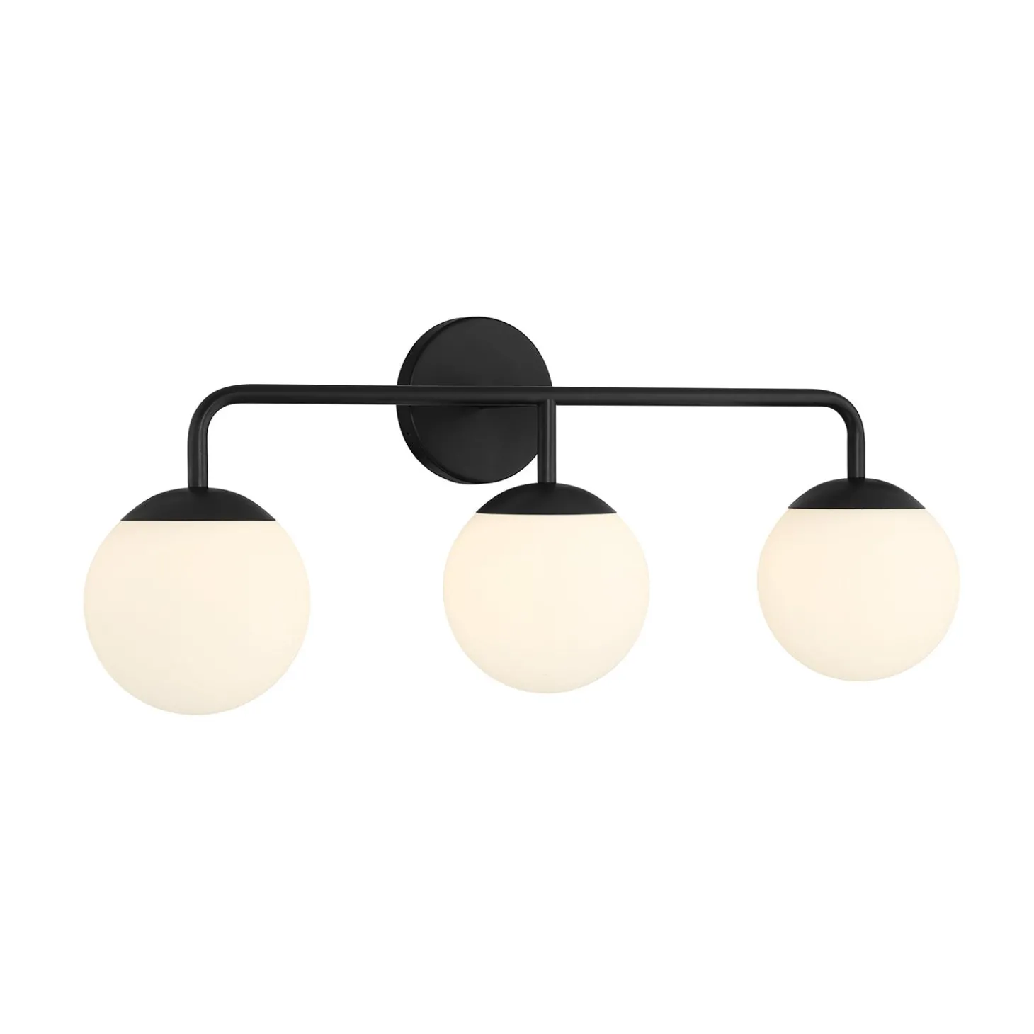 • Elegant three light, 26″ vanity featuring frosted white glass orbs crowned with an elegant cap of spun-metal in matte black