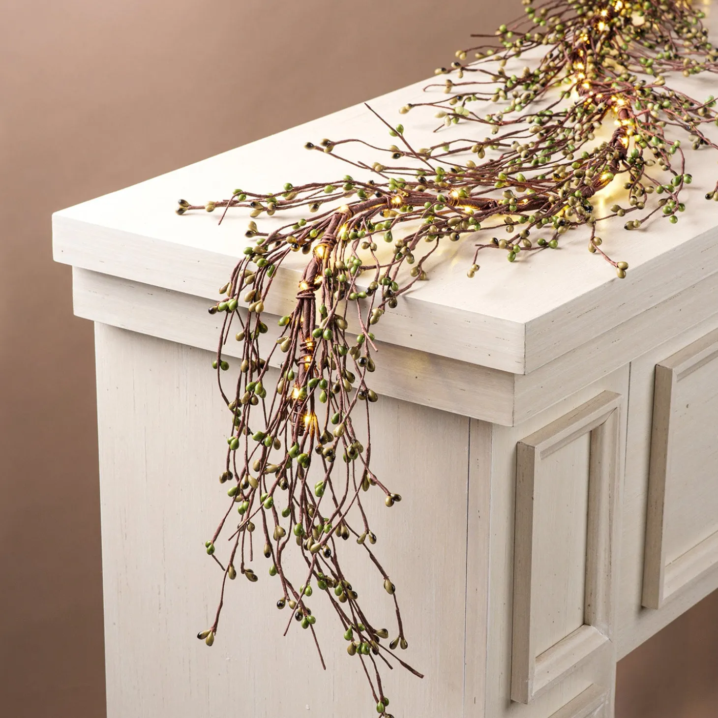 • 6 ft. branch garland with festive green berries and neutral, bright LED lights