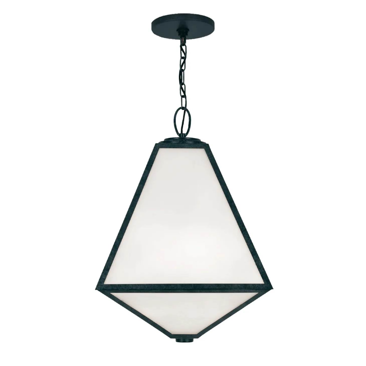 The Emmett Outdoor Hanging Light features a distinctive geometric design with a Black Charcoal finish. The unique diamond-shaped fixture is complemented by white opal glass panels that provide soft, even illumination. This contemporary outdoor pendant measures 21″ tall and 14″ wide, making it perfect for covered porches, pergolas, or entryways with high ceilings. The modern silhouette creates an architectural statement that enhances both traditional and contemporary exteriors. The included 72″ chain allows for versatile installation heights, while the weather-resistant, wet-rated construction ensures this fixture will withstand the elements while adding sophisticated style to your outdoor living space.