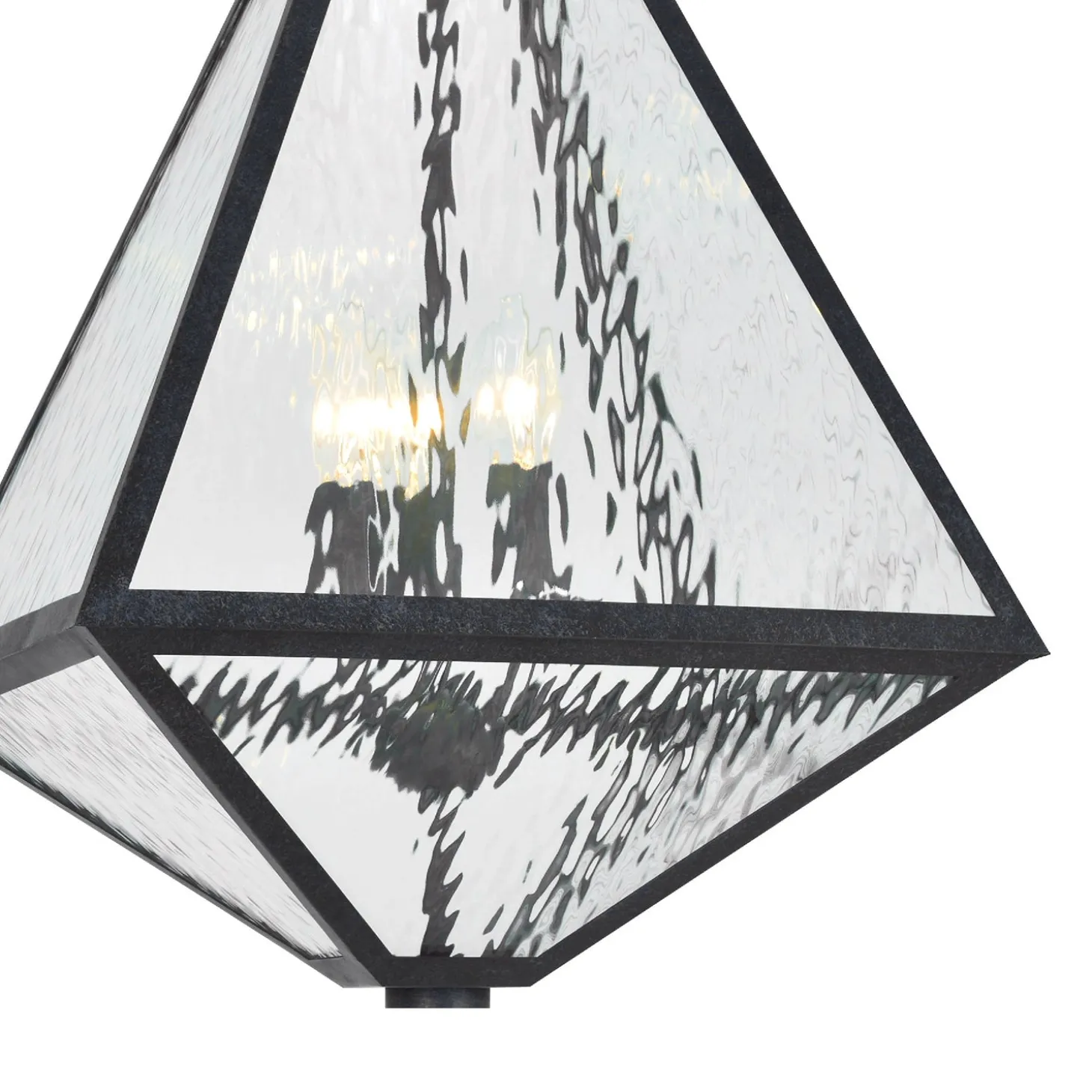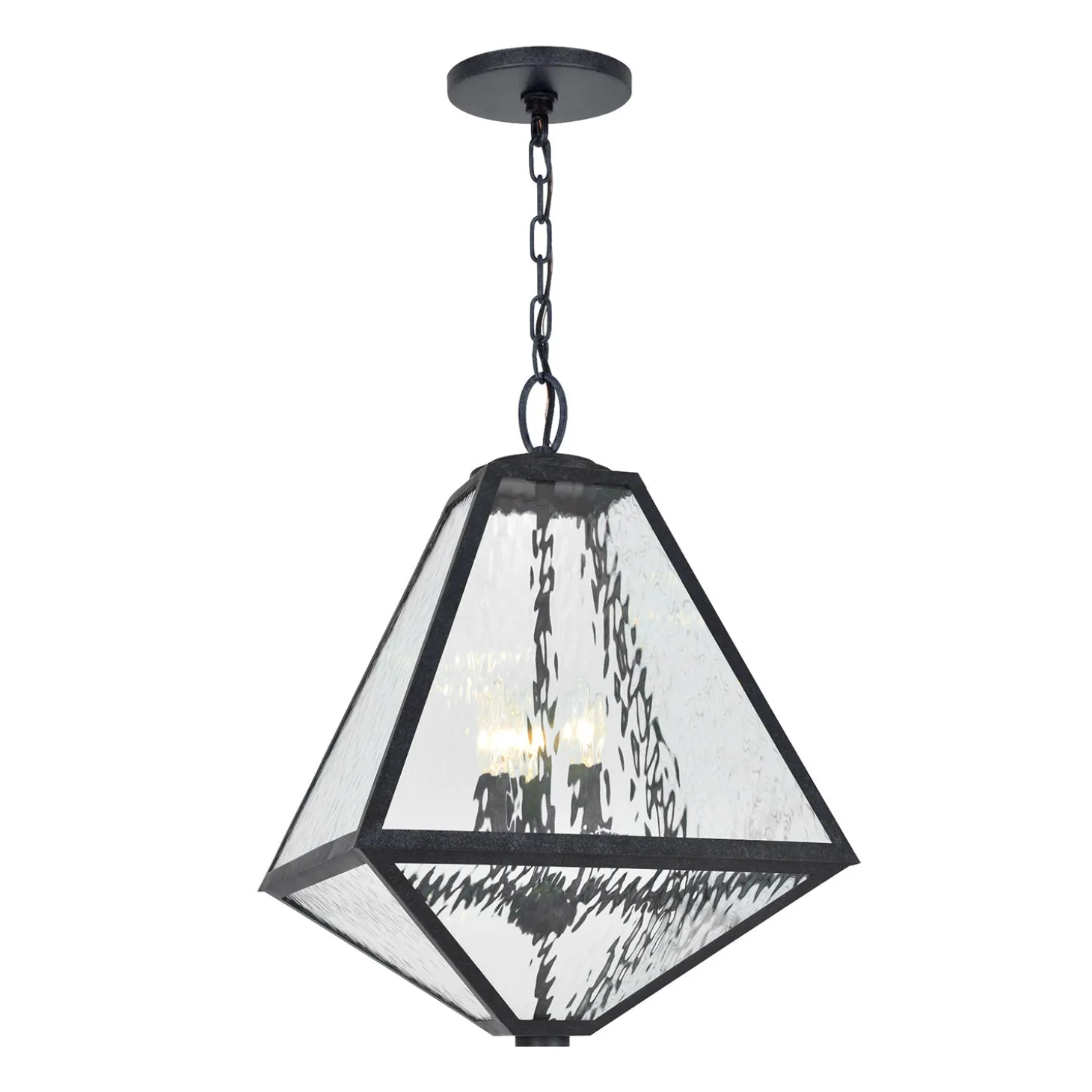 The Emmett Outdoor Hanging Light features a distinctive geometric design with a Black Charcoal finish. The unique diamond-shaped fixture is complemented by clear, water glass panels that diffuse light beautifully while creating visual interest. This contemporary outdoor pendant measures 21″ tall and 14″ wide, making it perfect for covered porches, pergolas, or entryways with high ceilings. The modern silhouette creates an architectural statement that enhances both traditional and contemporary exteriors. The included 72″ chain allows for versatile installation heights, while the weather-resistant, wet-rated construction ensures this fixture will withstand the elements while adding sophisticated style to your outdoor living space.