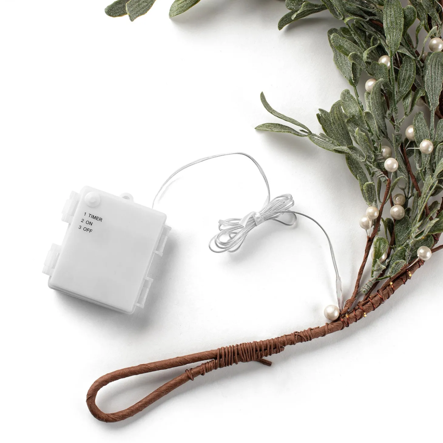 This cheerful, wintery garland features leafy braches dotted with white pearly decorative berries. Each delicate leaf shimmers with a touch of glitter, set to sparkle by 100 bright white LED fairy lights wrapped along the length of the garland. A looped end and five feet of clear lead wire are great for easy installation and versatile arrangements. Arrange along a dining table as a centerpiece or drape across a fireplace mantel for a festive holiday touch.