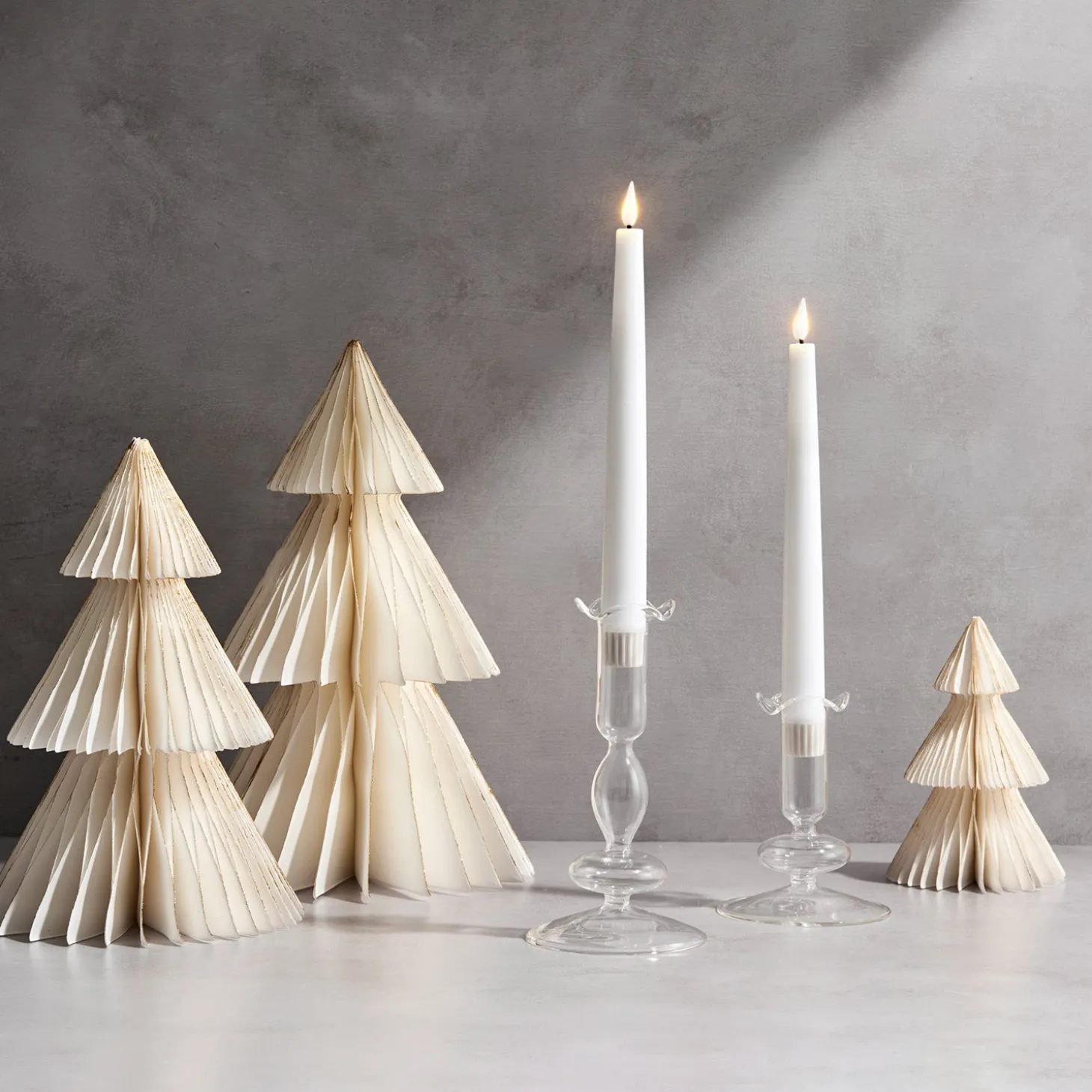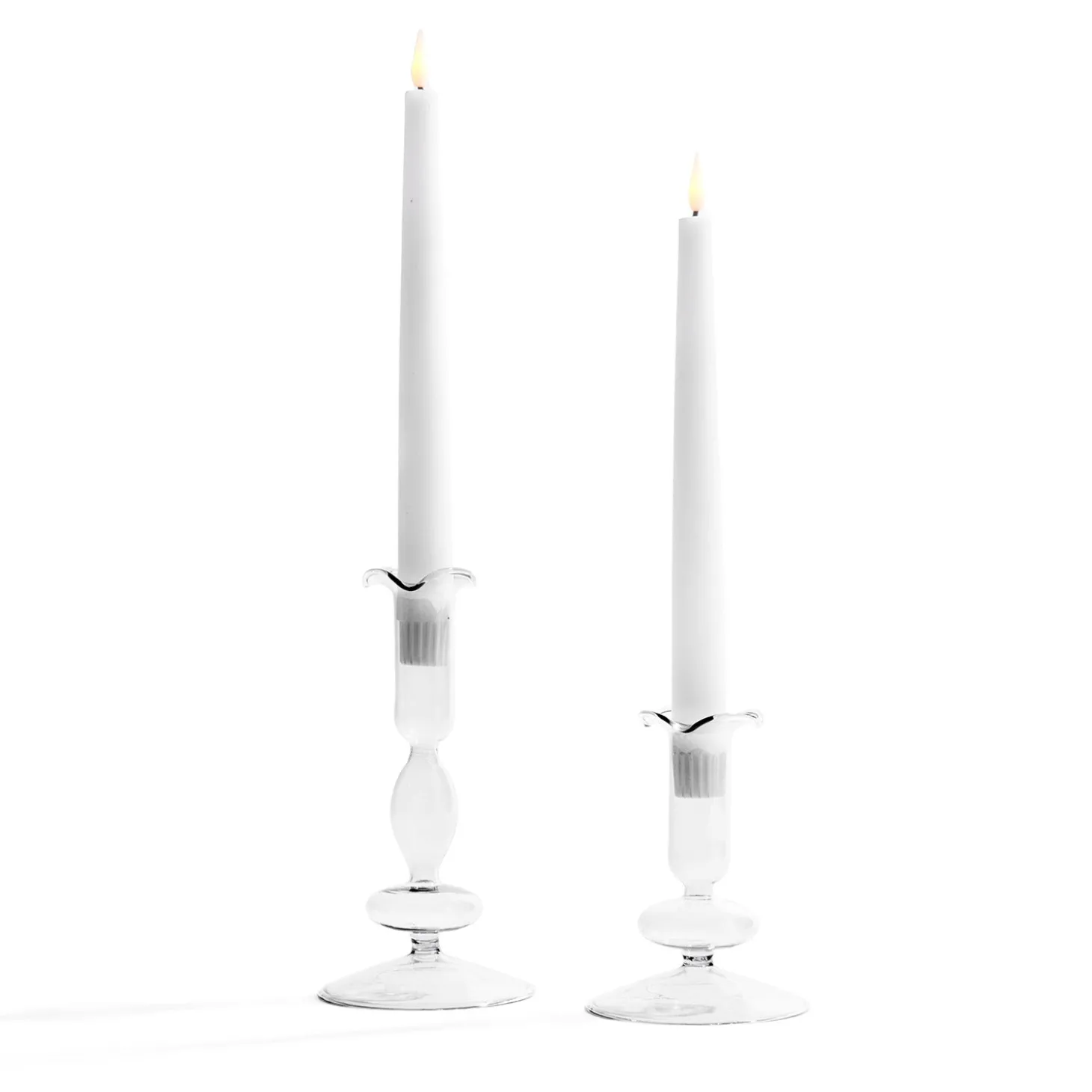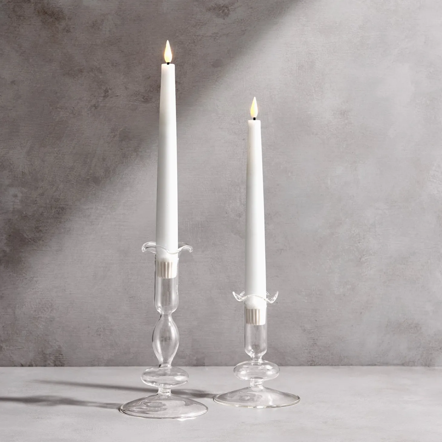 Elevate your interior decor with our Lily Taper Candle Holders, featuring two heights — 4.5 inches and 6.5 inches — adding a touch of sophistication to any setting. Handcrafted from resilient borosilicate blown glass, these candle holders feature a delicate appearance. Inspired by the elegance of lilies, their design captures the essence of blooming petals while adding a timeless touch to your home. Make a statement at your next gathering with these unique candle holders, perfect for weddings, parties, or intimate dinners.