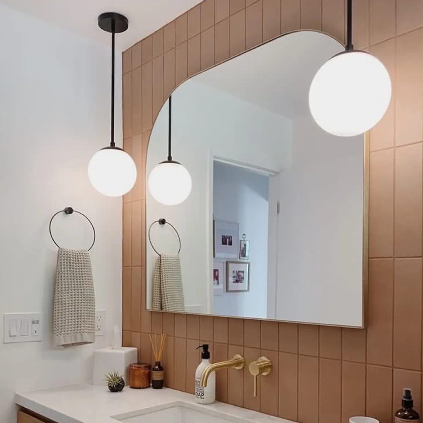 • Single pendant light features an 8″ frosted white glass orb capped with a spun metal, matte black hood