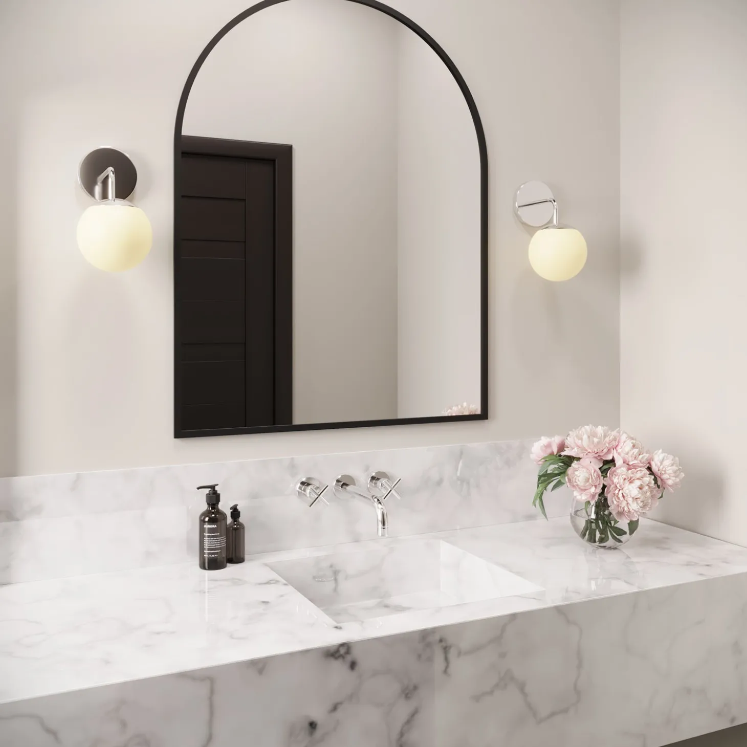 • Features a frosted white glass orb crowned with an elegant cap of spun metal, beautifully suspended from a gently curved arm and backplate