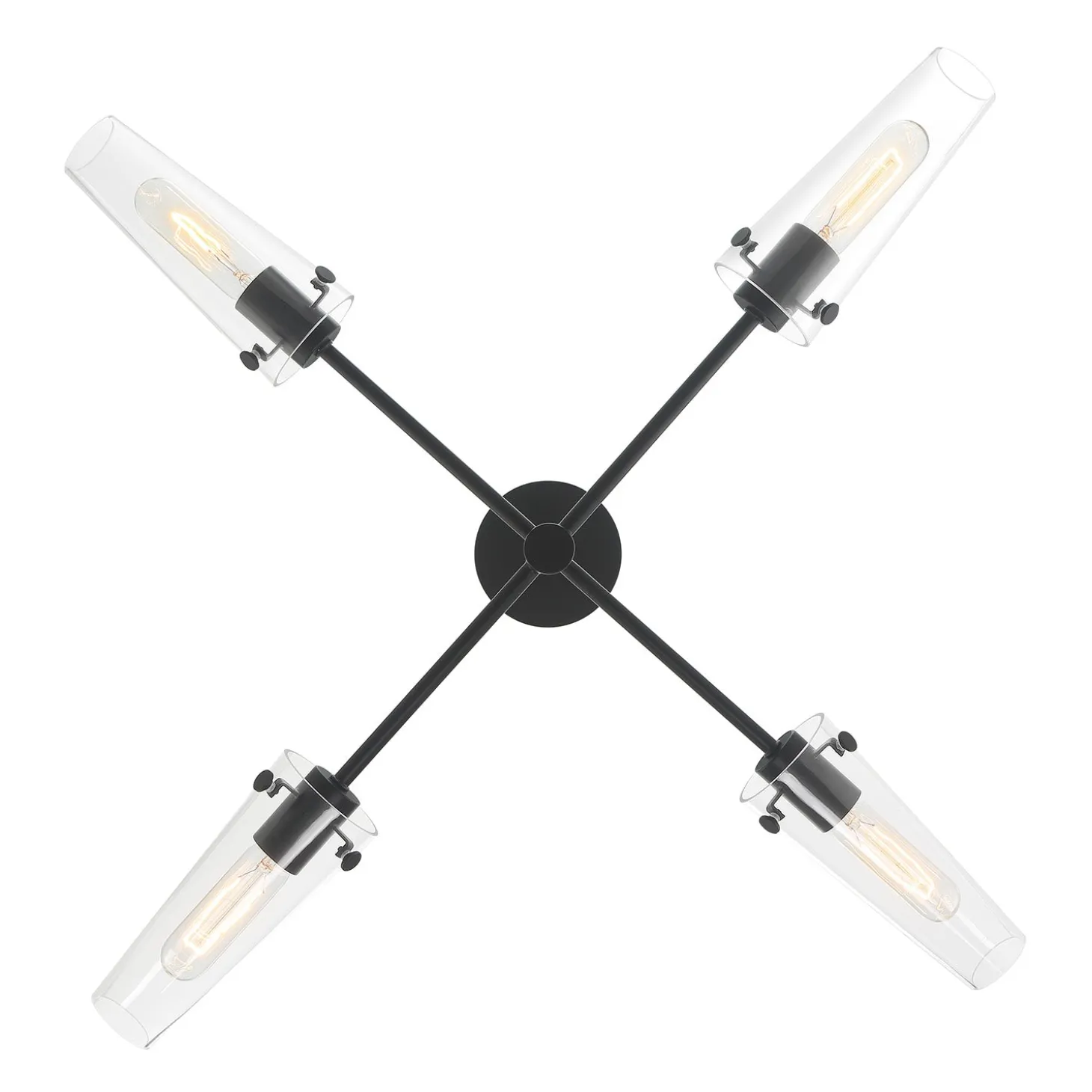• Ceiling mounted fixture inspired by modern industrial design features four tapered glass lights set on the ends of two horizontal arms in a trendy matte black finish