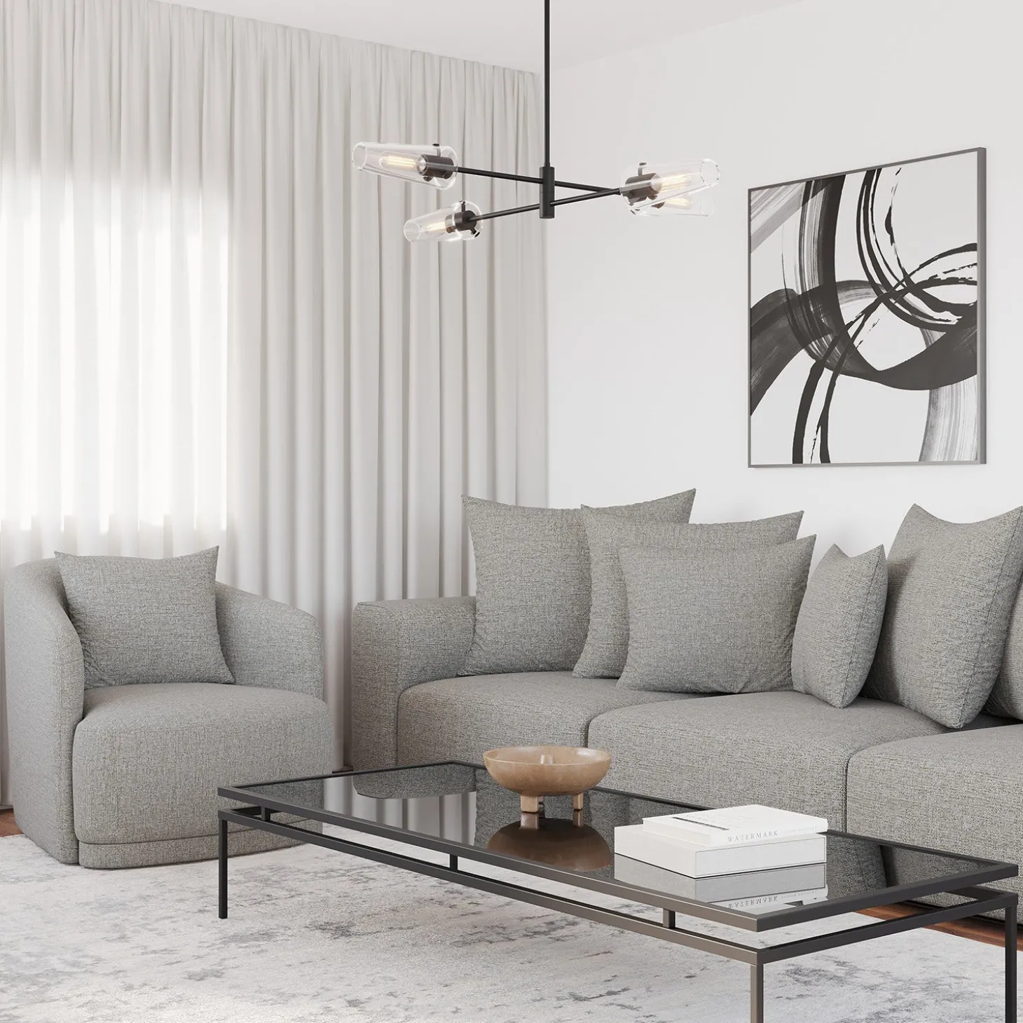 Boasting a trendy modern industrial design, our Mason 4-Light Chandelier is a perfect blend of form and function. Tapered glass shades are set on the ends of horizontal arms suspended from a single downrod and disc-shaped canopy. This ceiling light incorporates adjustable arms that rotate horizontally to create the perfect shape for your design needs – create a narrow shape down to 13″ wide, or open up the arms to a symmetrical shape at 32″ wide. The Mason 4-Light Chandelier is available in a gorgeous matte black finish that draws on the industrial design of the ceiling fixture.