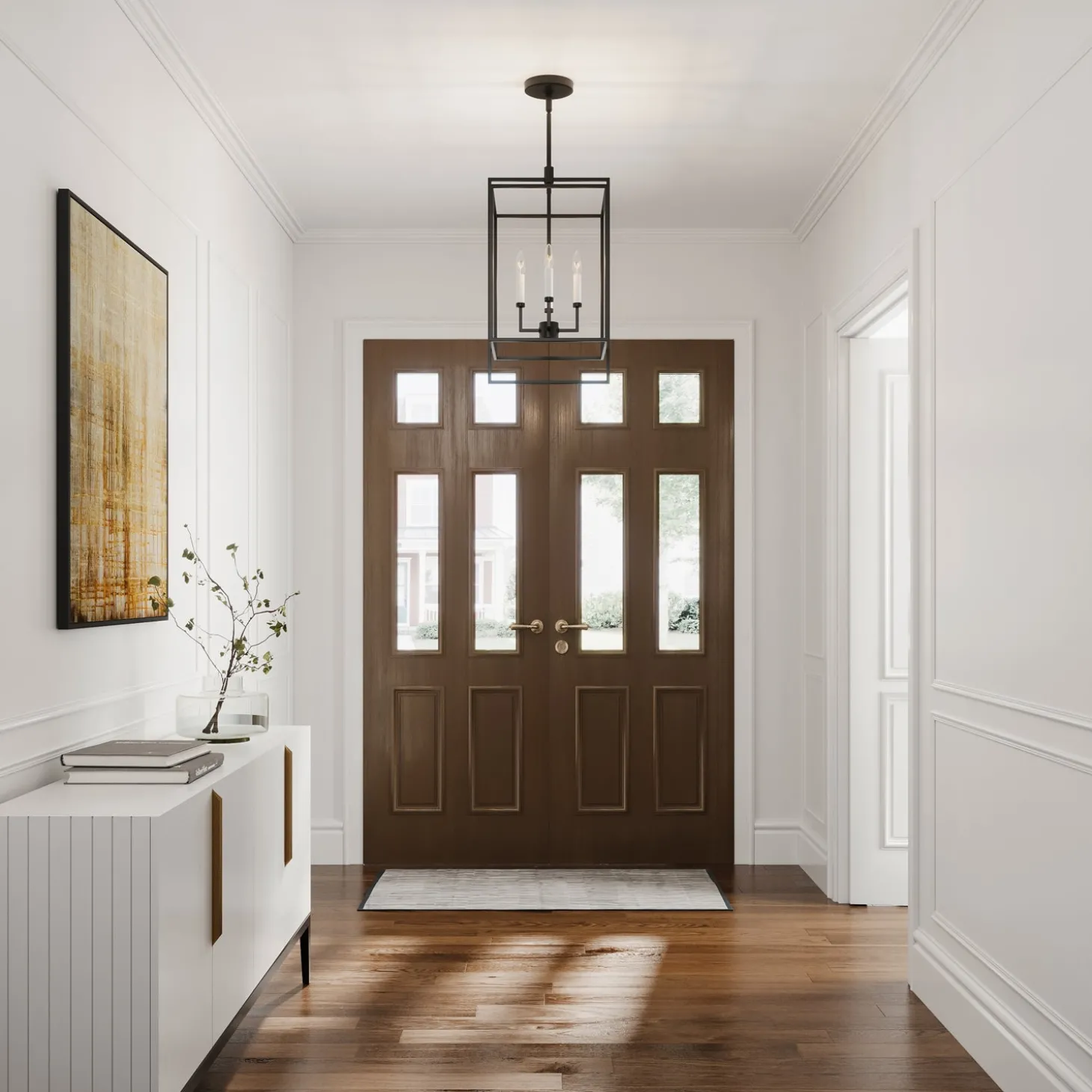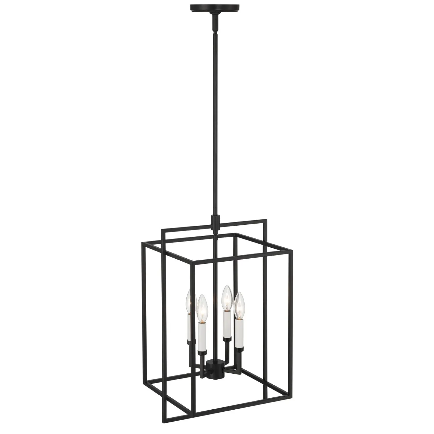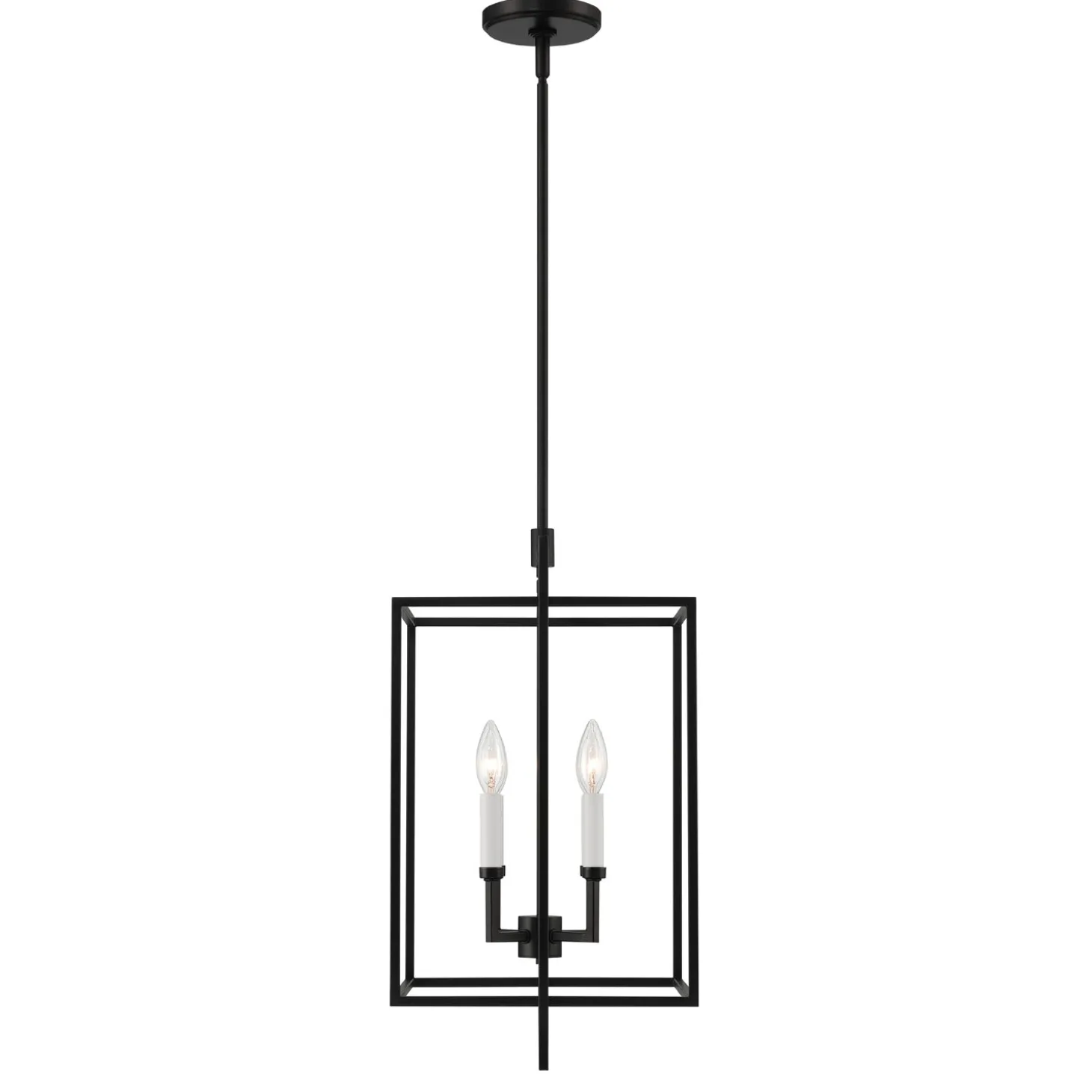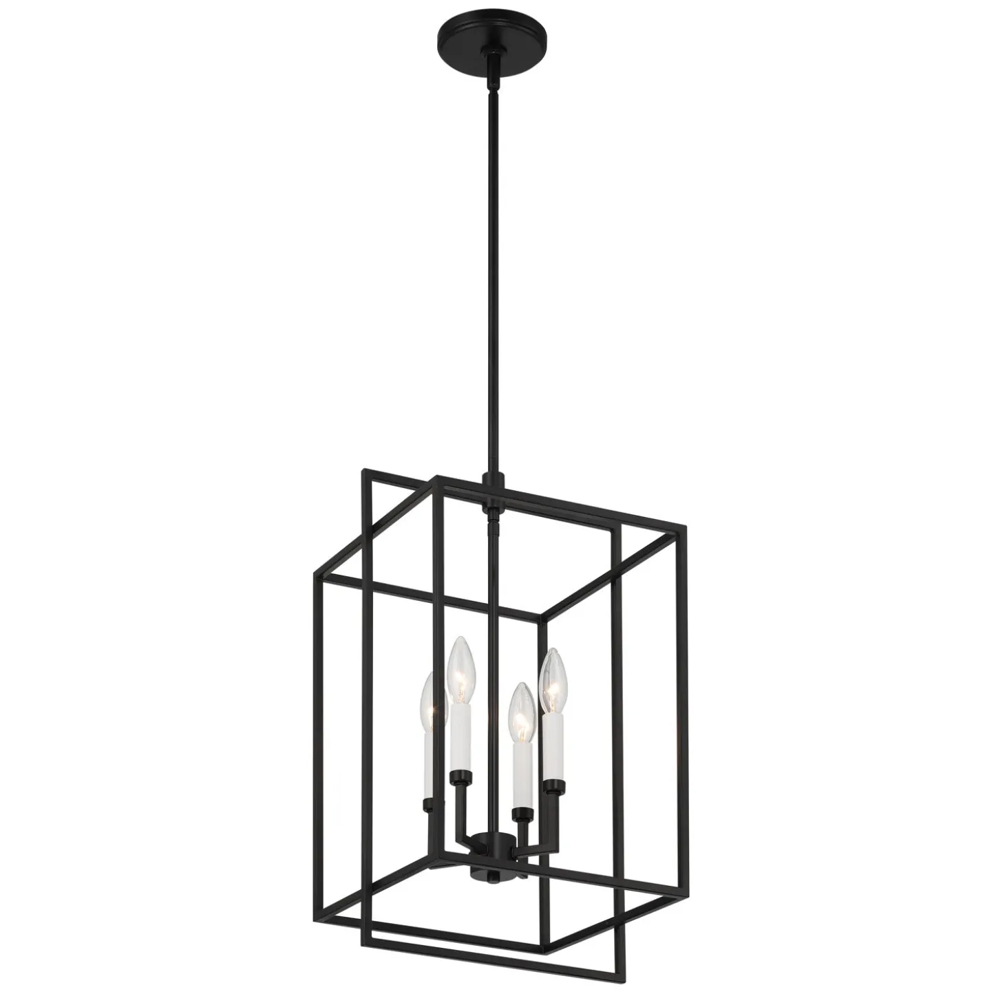 • Matte Black hanging pendant features four candelabra bulbs in an updated open frame lantern design, suspended by matching down rods