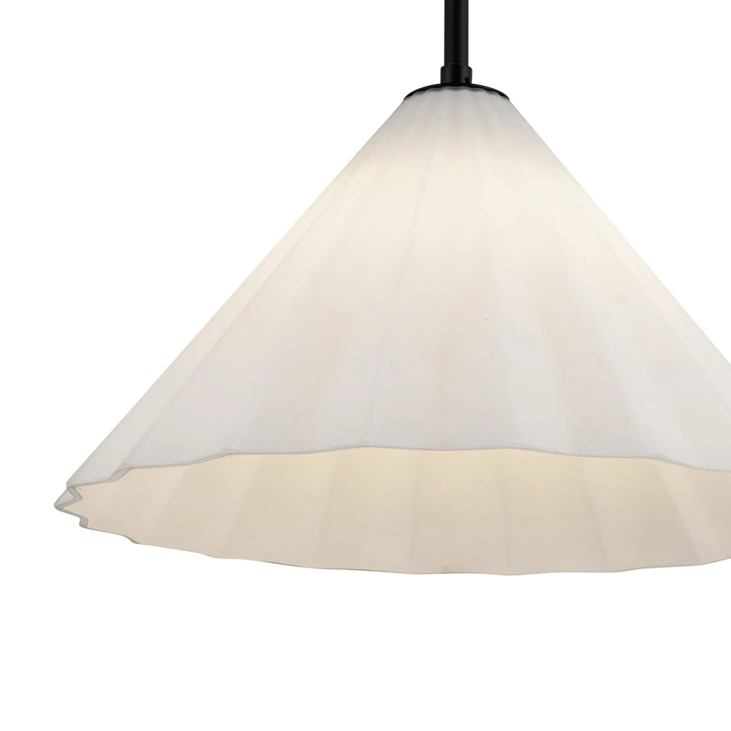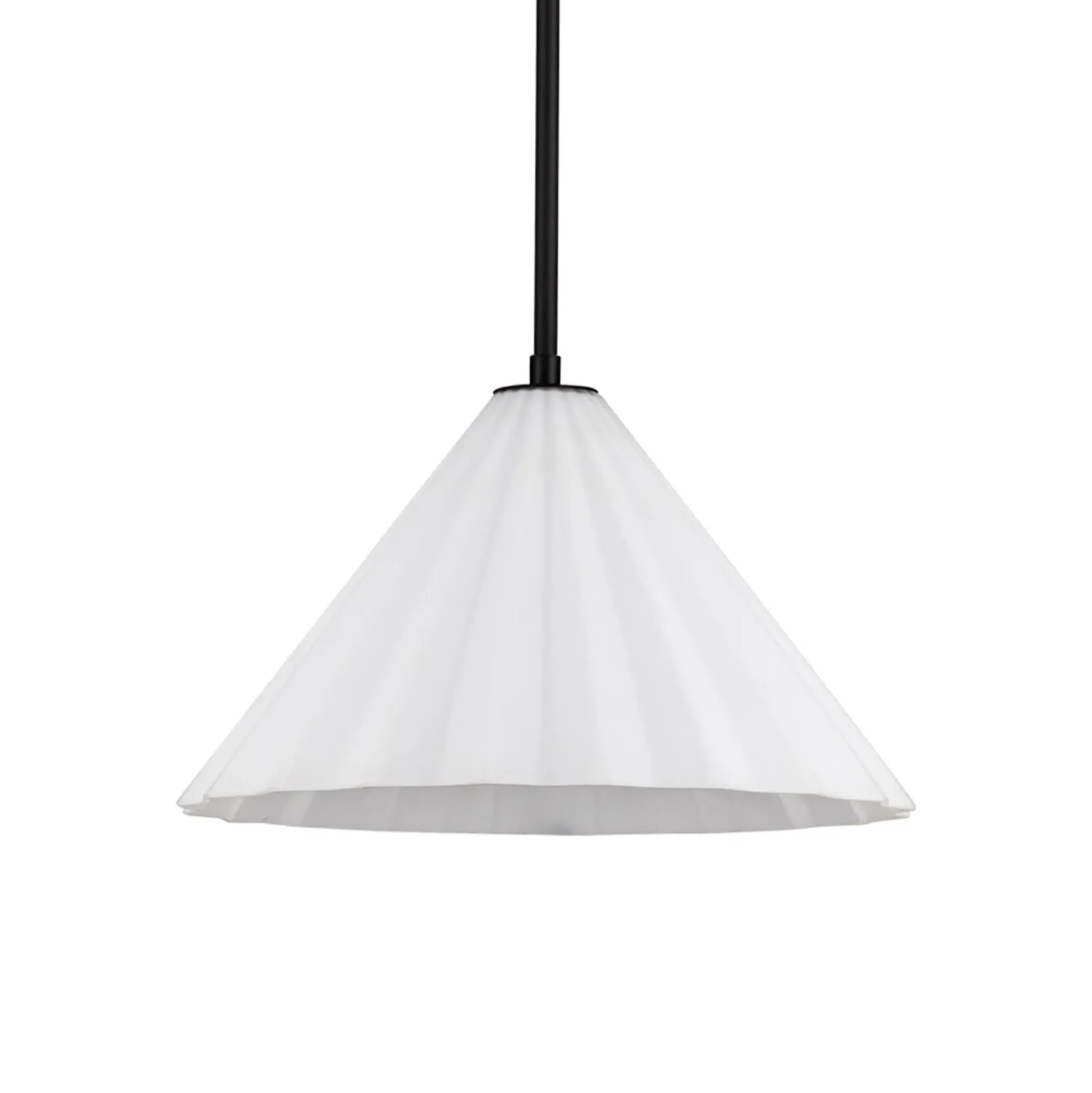 The Reese Pendant features a minimalist design with a sleek matte black rod supporting a gracefully pleated conical shade of opal glass. This elegant ceiling light combines simplicity and sophistication through its clean lines and warm metallic finish. Measuring 14″ in diameter, the Reese creates soft, diffused illumination that is ideal for dining areas, kitchen islands, or entryways. The classic cone-shaped shade brings a timeless quality to the fixture, while the gentle texture of the opal glass adds depth and visual interest when illuminated.