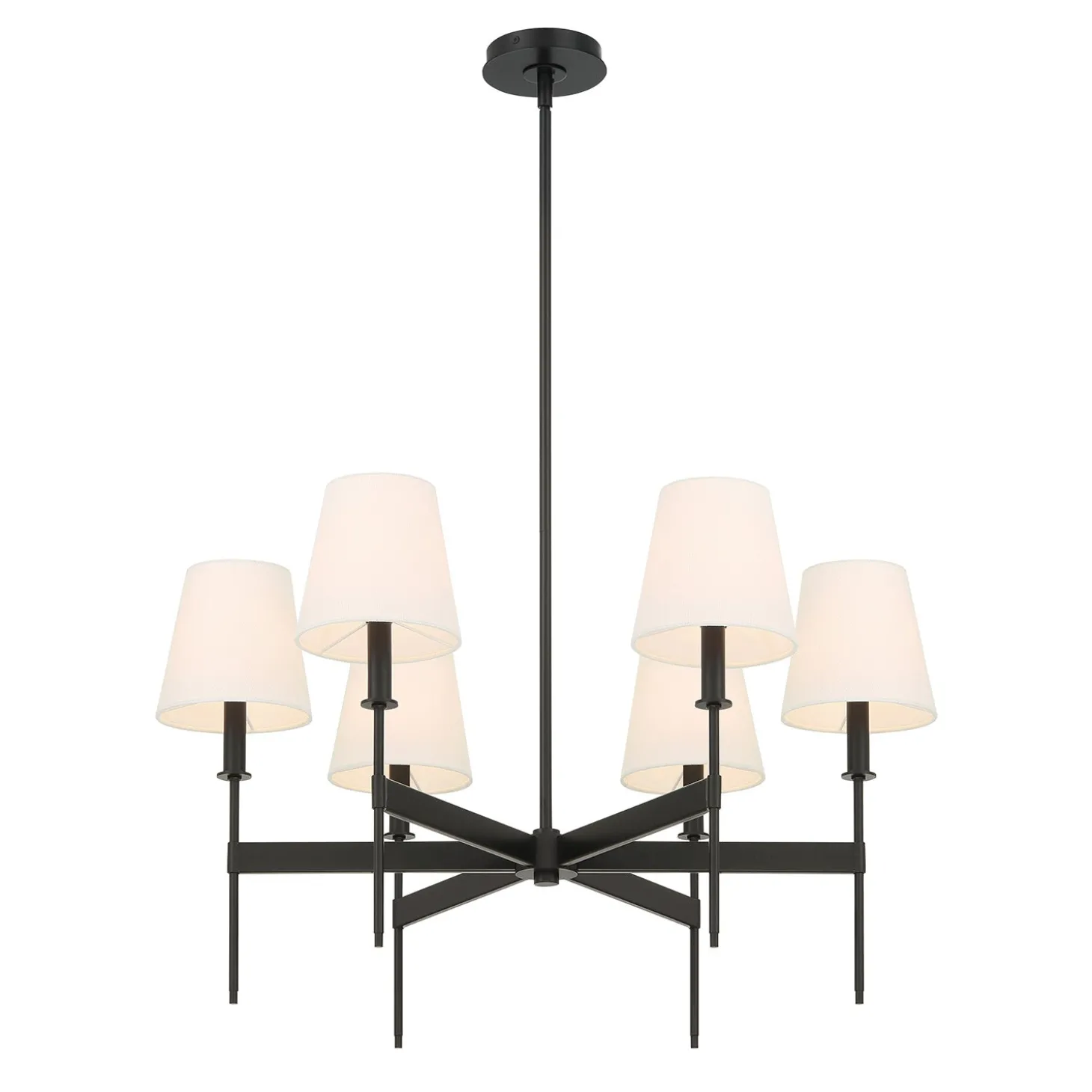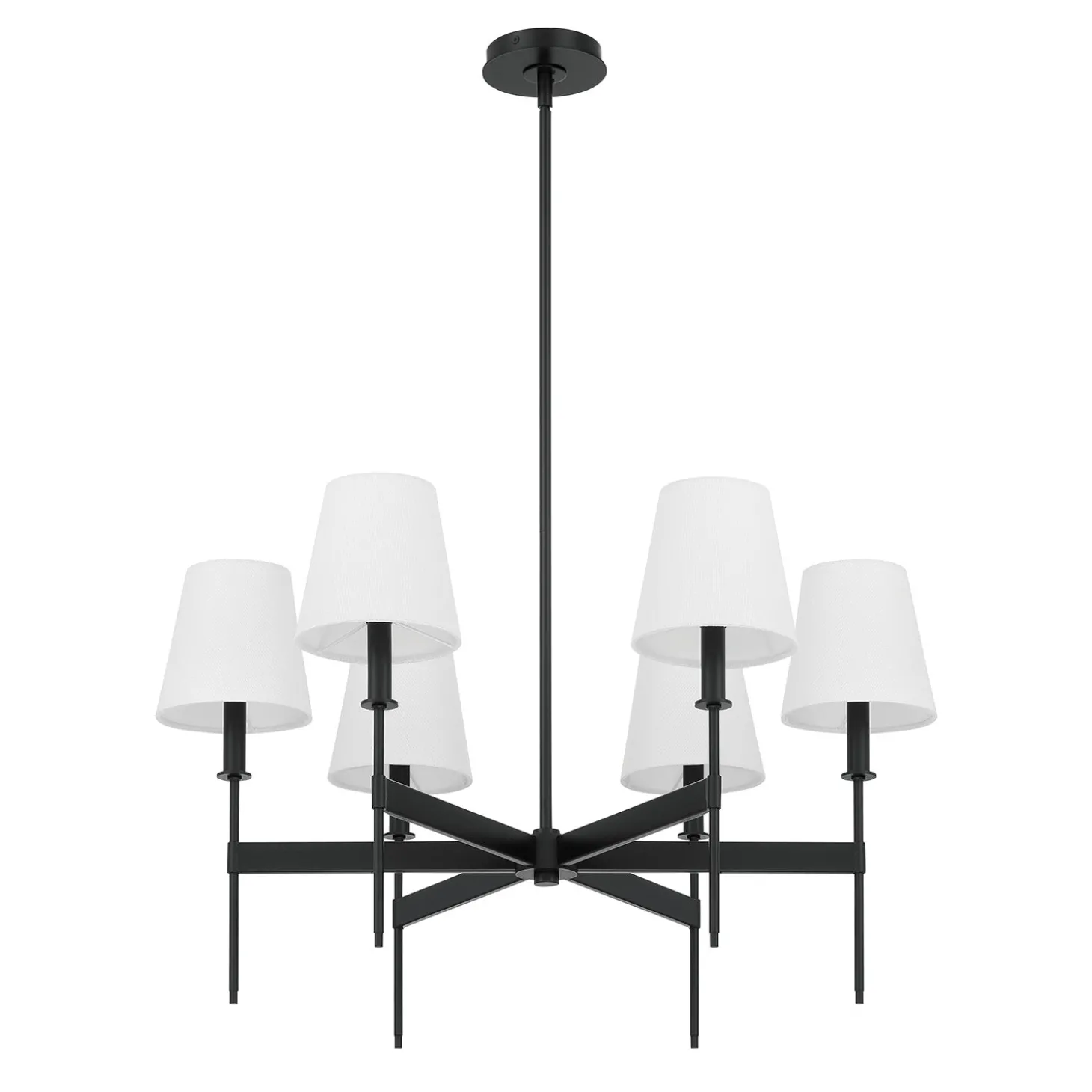 The Taylor 6 Light Chandelier brings a touch of classic elegance to any space. Six rectangular arms radiate from a central hub, each ending with a beautifully refined stem holding a white fabric shade. This beautiful ceiling light is suspended from a round canopy and adjustable metal down rods and features a swivel adaptor built in for easy installation in any home. The matte black finish beautifully contrasts with the white fabric shades, embodying a sophisticated and timeless design aesthetic. The Taylor chandelier is 30” in diameter and dimmable, perfect for creating a cozy dining room, bedroom, or welcoming entryway. With two finish options and a matching wall sconce style, the Taylor Collection makes a wonderful impression in any home.