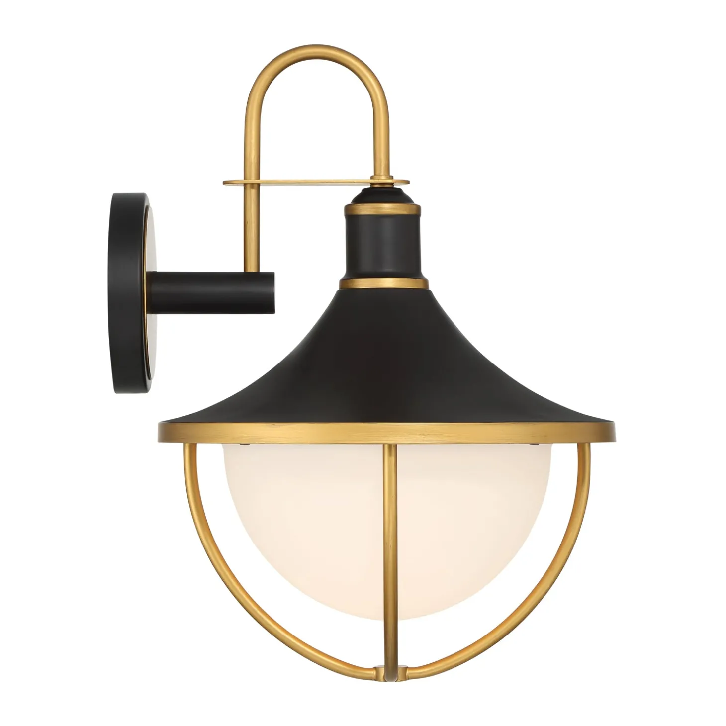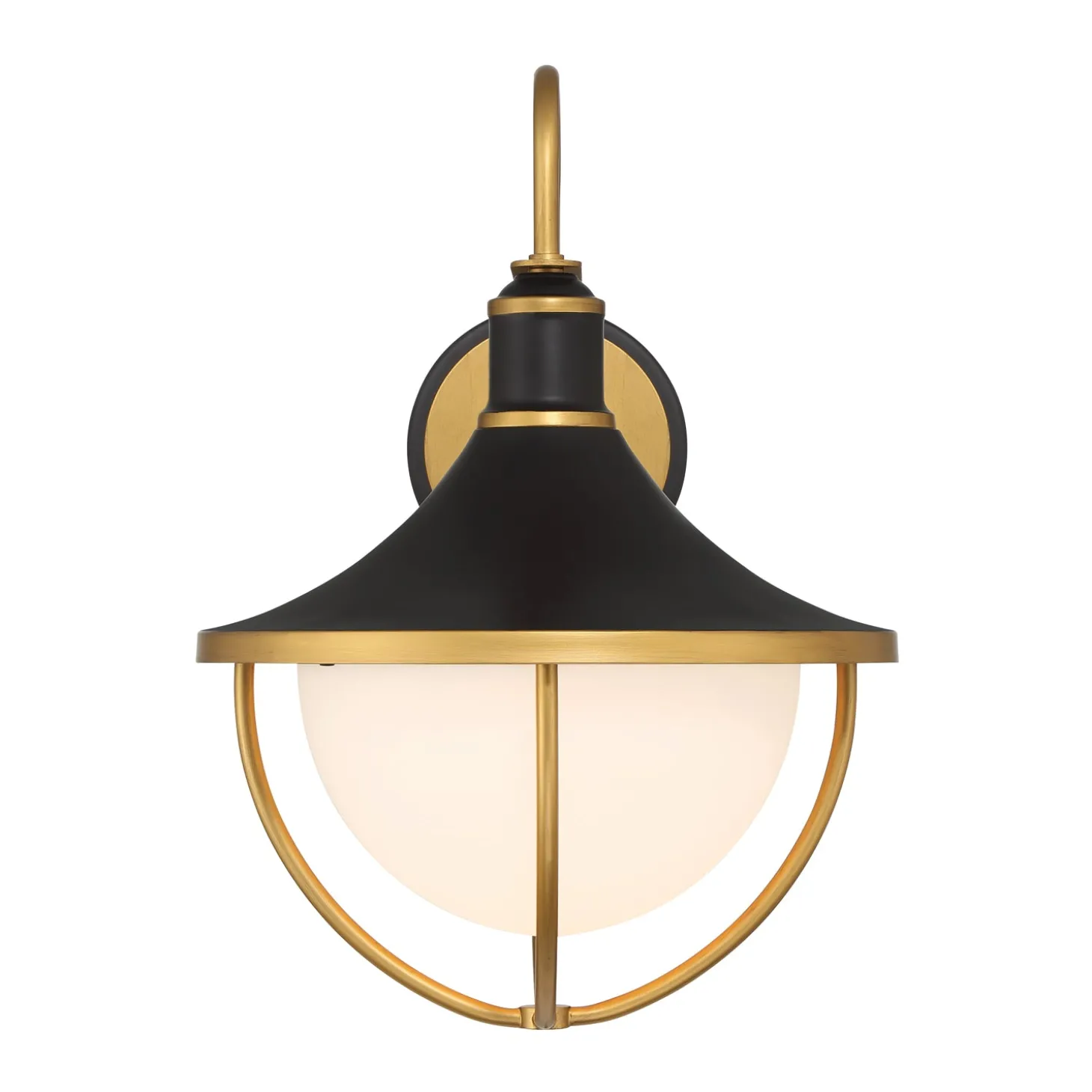 The Tobin Outdoor Wall Light features a modern design with a two-tone finish of Matte Black and Textured Gold. The distinctive silhouette showcases elegant gold arcs that gracefully frame an opal glass bowl, creating a sophisticated lighting element for your home’s exterior. This medium wall light measures 18.75″ tall, making it ideal for entryways, patios, or alongside garage doors. The combination of sleek metal and smooth glass creates a contemporary aesthetic that complements various architectural styles. Weather-resistant and wet-rated for outdoor use, the Tobin provides both functional illumination and decorative appeal.