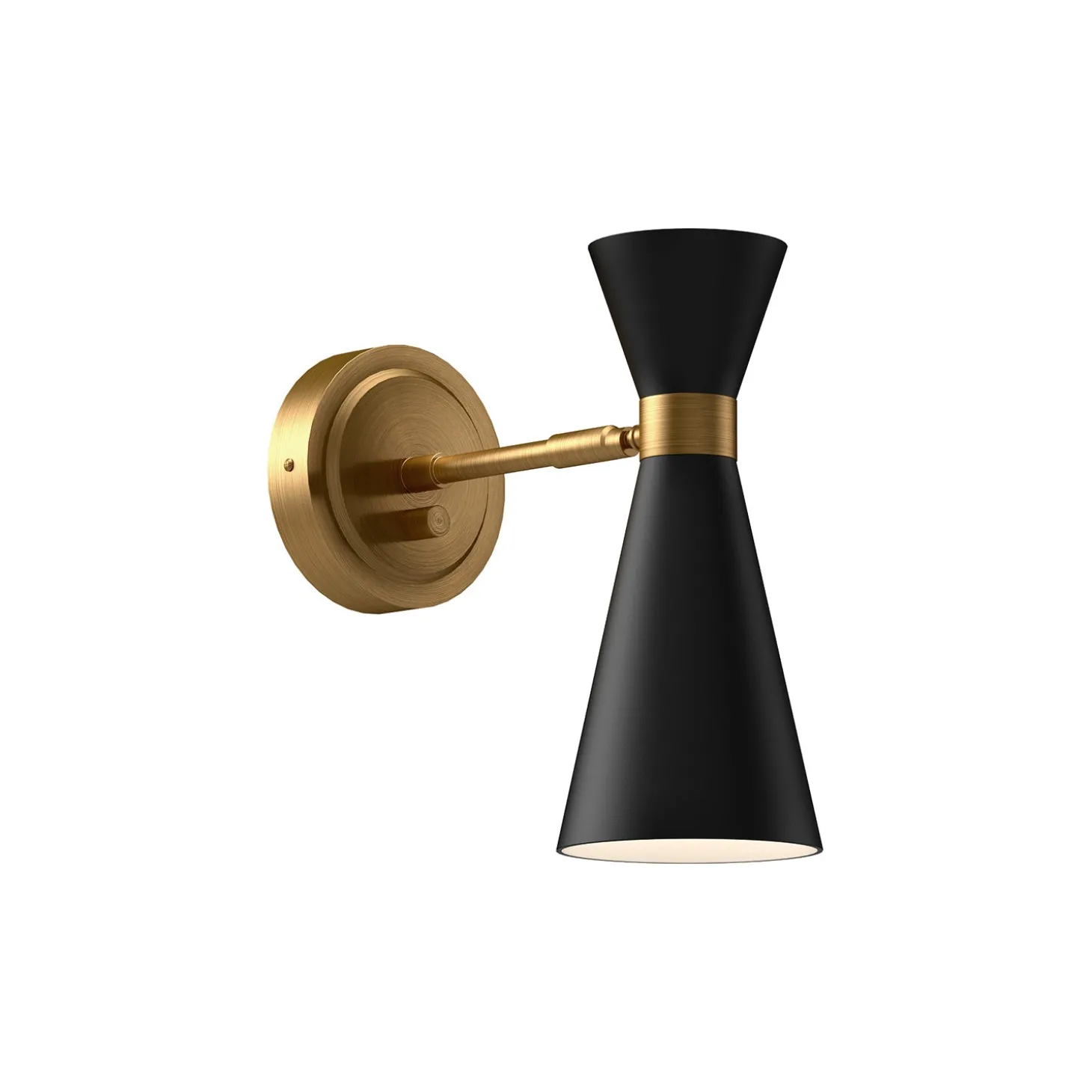 The Aiden Pivot Wall Sconce brings mid-century-modern design to your home with a distinctive geometric flair. This stylish wall light features a pivoting, double-flared conical shade with a metallic center band, creating an elegant hourglass silhouette. The matte black metal shade is elegantly cinched with an antique brass band at the center, offering beautiful contrast and visual interest. The warm metallic tones continue through the arm and round backplate, adding refined elegance to the bold geometric form. This sconce provides ambient illumination with a decorative touch, making it perfect for hallways, living rooms, or flanking mirrors and artwork, blending retro-inspired elements with modern sophistication.