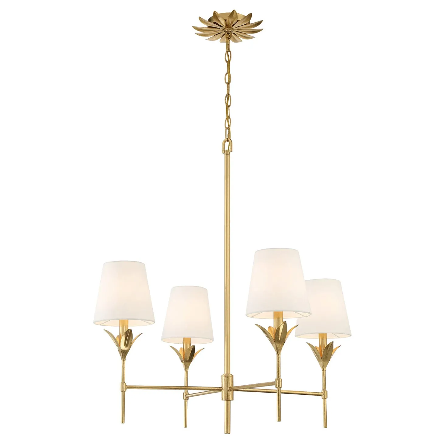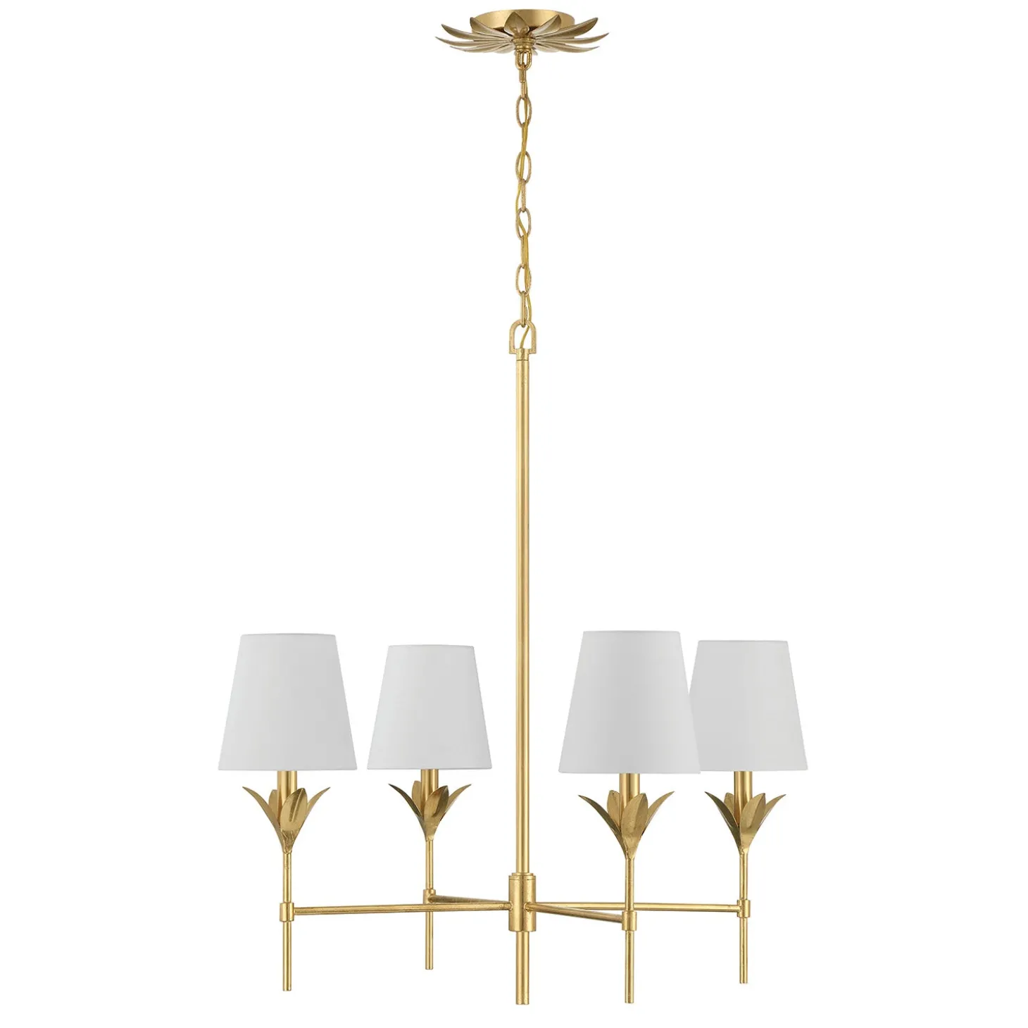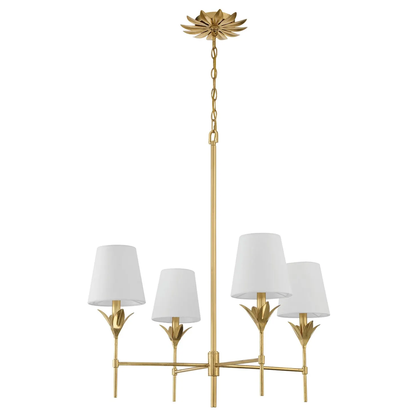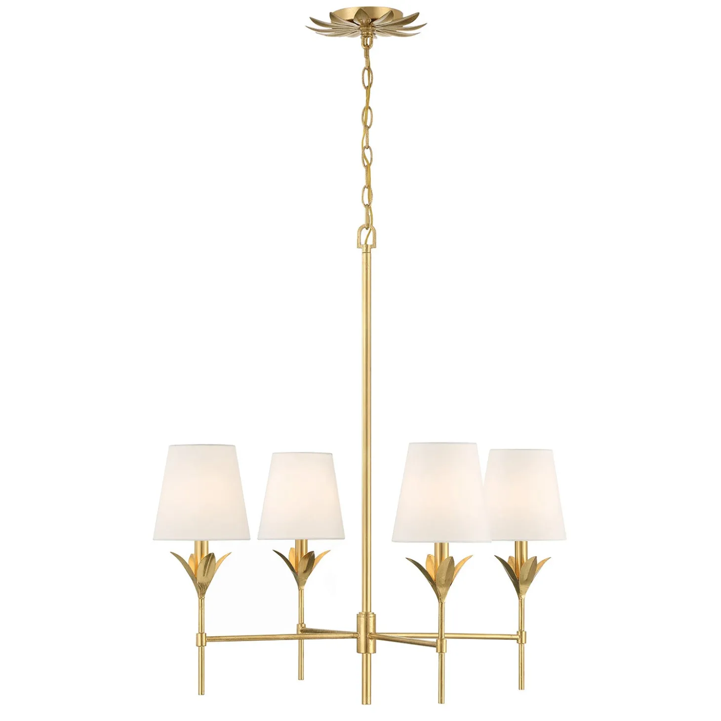 The Alice 4 Light Chandelier brings refined elegance to your space with sculptural leaf details and tailored fabric shades. Finished in warm antique gold, this fixture offers timeless appeal with a touch of vintage charm. The crisp white shades diffuse light beautifully, casting a warm, inviting glow. With a balanced 28″ diameter, it makes a statement while maintaining graceful proportions, perfect for dining rooms, living areas, or entryways. The included 72″ chain and rod allow for adjustable hanging height, ensuring a seamless fit for your space.