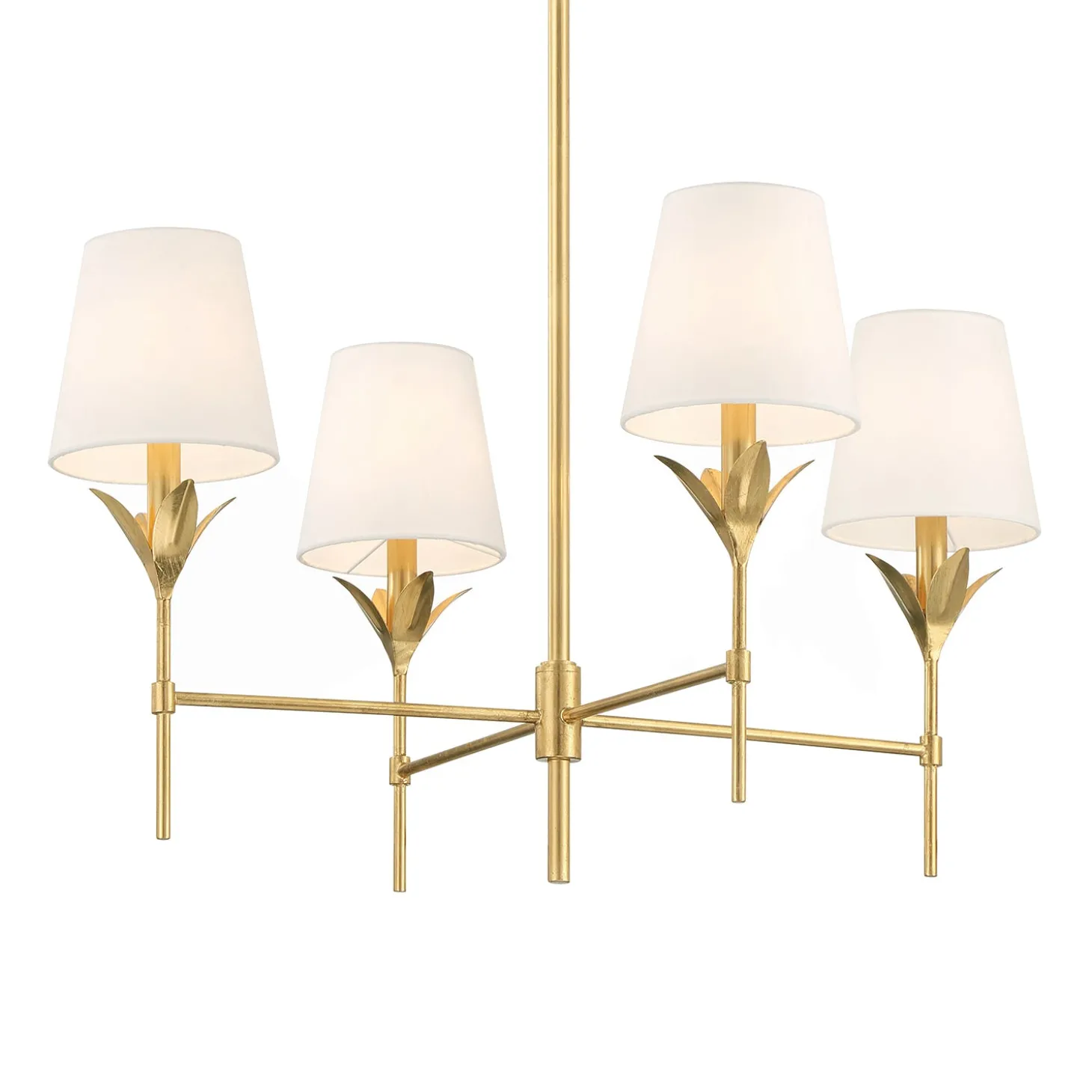 • Elegant four-arm chandelier featuring sculptural leaf details and four tailored silk fabric shades