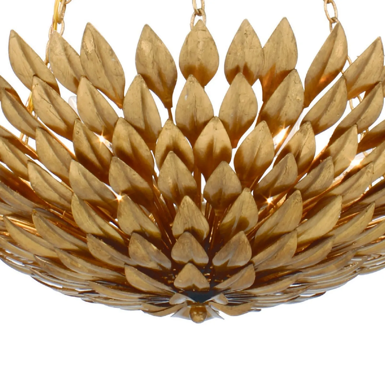The Alysa Pendant showcases artistry and elegance with its handcrafted wrought iron leaves, forming a striking floral silhouette. Finished in warm antique gold, it adds sophistication while maintaining a light, airy presence. With a generous 24.5″ diameter, this pendant makes a statement in dining rooms, foyers, or living spaces while providing ample illumination. The included 72″ chains allow for adjustable hanging height, ensuring a perfect fit for your space.