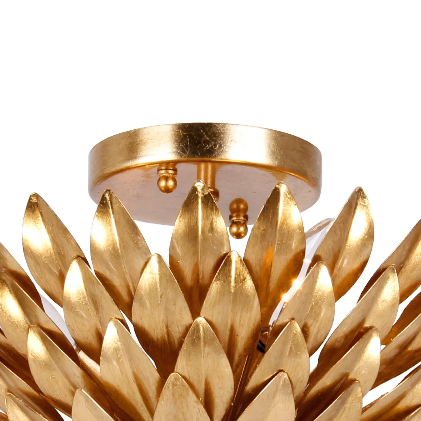 The Alysa Semi Flush showcases intricate craftsmanship with its handcrafted wrought iron leaves, forming a striking floral silhouette. Finished in warm antique gold, it brings sophistication while maintaining a light, airy presence. With a 16″ diameter, this fixture makes a statement in bathrooms, living spaces, or bedrooms, providing ample illumination. Its semi-flush design strikes a perfect balance between elegance and practicality, adding decorative artistry to any ceiling.
