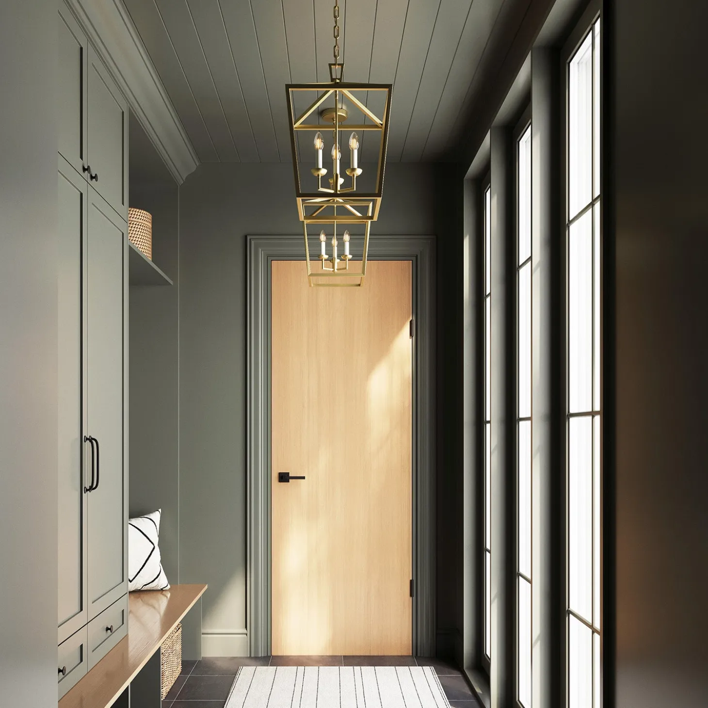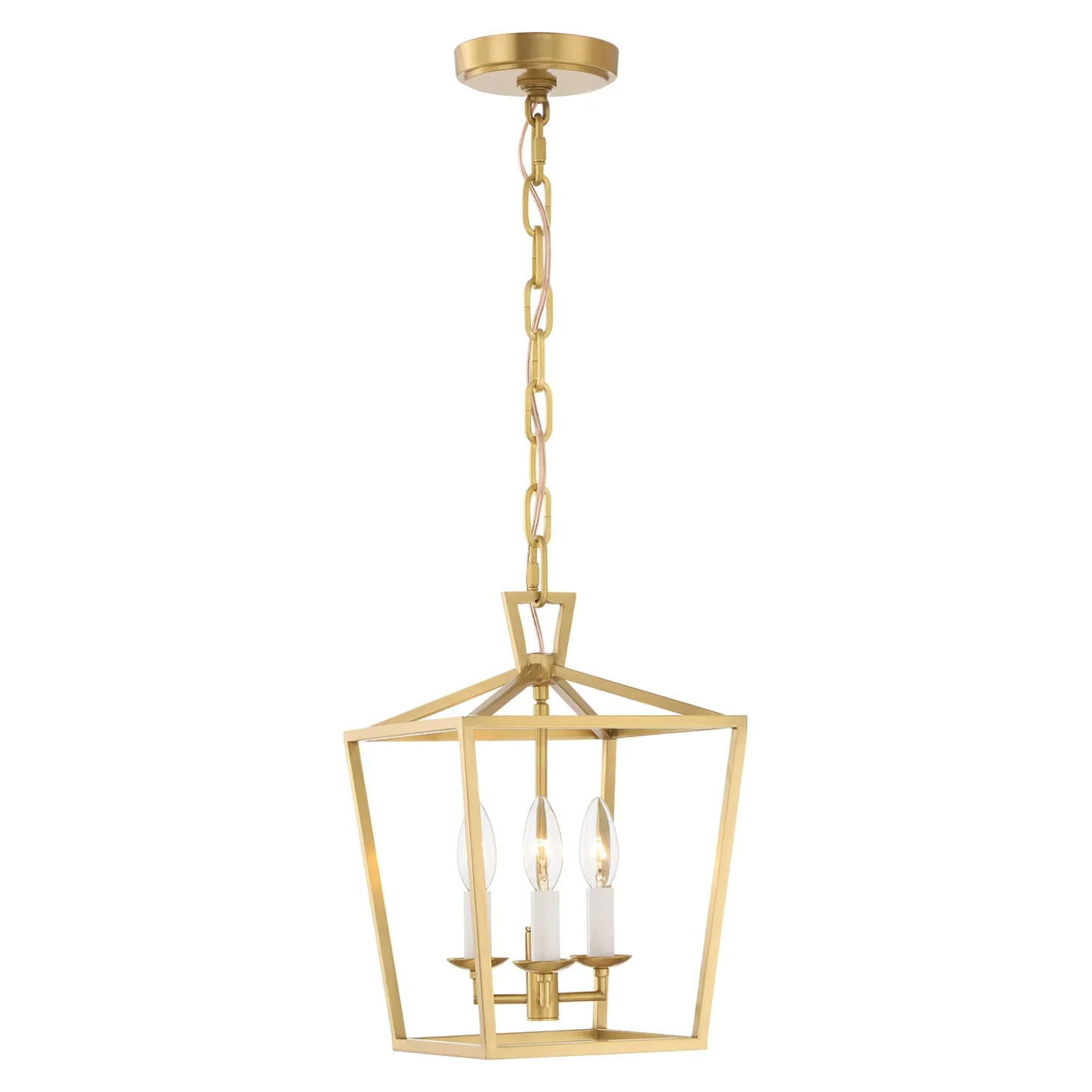 The Anover Collection of dramatic, open frame pendant lights is inspired by a classic silhouette and enhanced with modern detailing and finishes. The Anover 10″ wide Lantern Pendant features three candelabra lights set in a timeless open metal frame, finished in warm satin brass. The entire structure is suspended by a beautiful, adjustable matching chain and circular canopy. Each component has been thoughtfully styled and produced; including a delicately tiered canopy, seamless body welds punctuated with rivets, stunning top loop, and flawless chain links. This beautiful fixture is dimmable with compatible bulbs and dimmer. Perfect for an entryway, hallway, or above a small dining table.