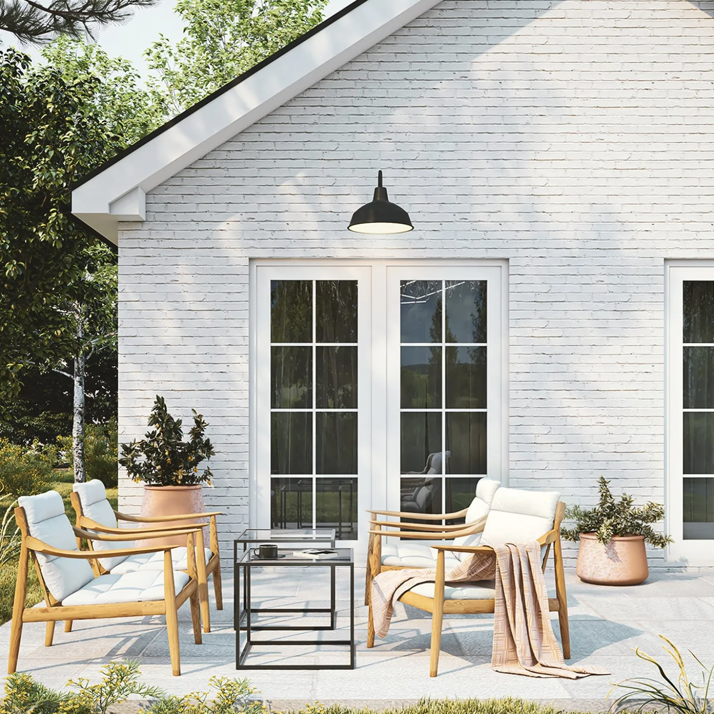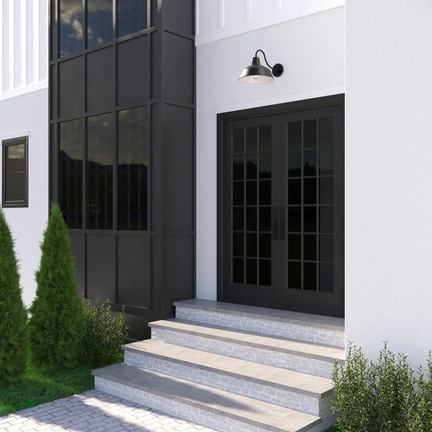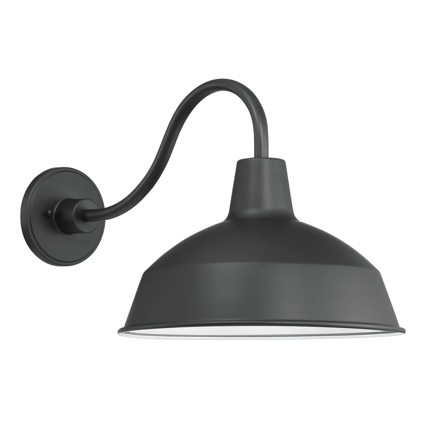 Inspired by turn-of-the-century industrial lighting, our Asher collection brings a modern farmhouse flair to your home or commercial space. The Asher Large Outdoor Wall Light is rich in vintage styling and features a curved, gooseneck arm with a 12.5″ round shade, suspended from a sturdy, tiered metal backplate. The matte black finish with white interior adds a refined note to this updated barn light. This light can be used outdoors or indoors and looks as great on a patio as it does in a kitchen or bathroom. The Asher Large Outdoor Wall Light is part of a larger collection of fixtures to complete your lighting needs.