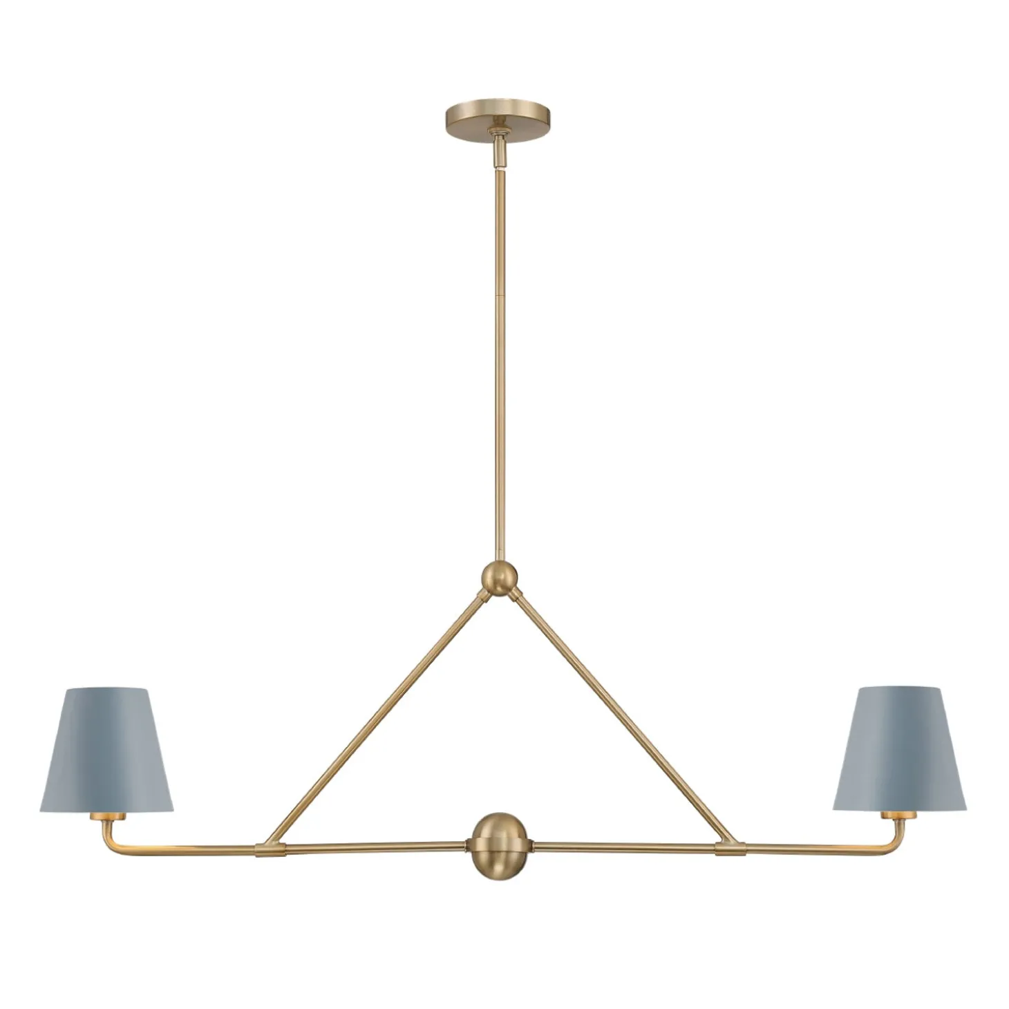 The Banks 2 Shade Linear Pendant blends modern sophistication with a refined touch of color. Featuring two French blue conical shades with white interiors and a brass body, this 42″ wide pendant directs focused light where it’s needed, creating both ambiance and functionality. The combination of French blue and brass adds warmth and contemporary style, effortlessly complementing both industrial and modern interiors. Its sleek, minimal profile and linear design emphasize horizontal space while maintaining a clean, uncluttered aesthetic—perfect for enhancing dining areas, kitchen islands, or long tables.