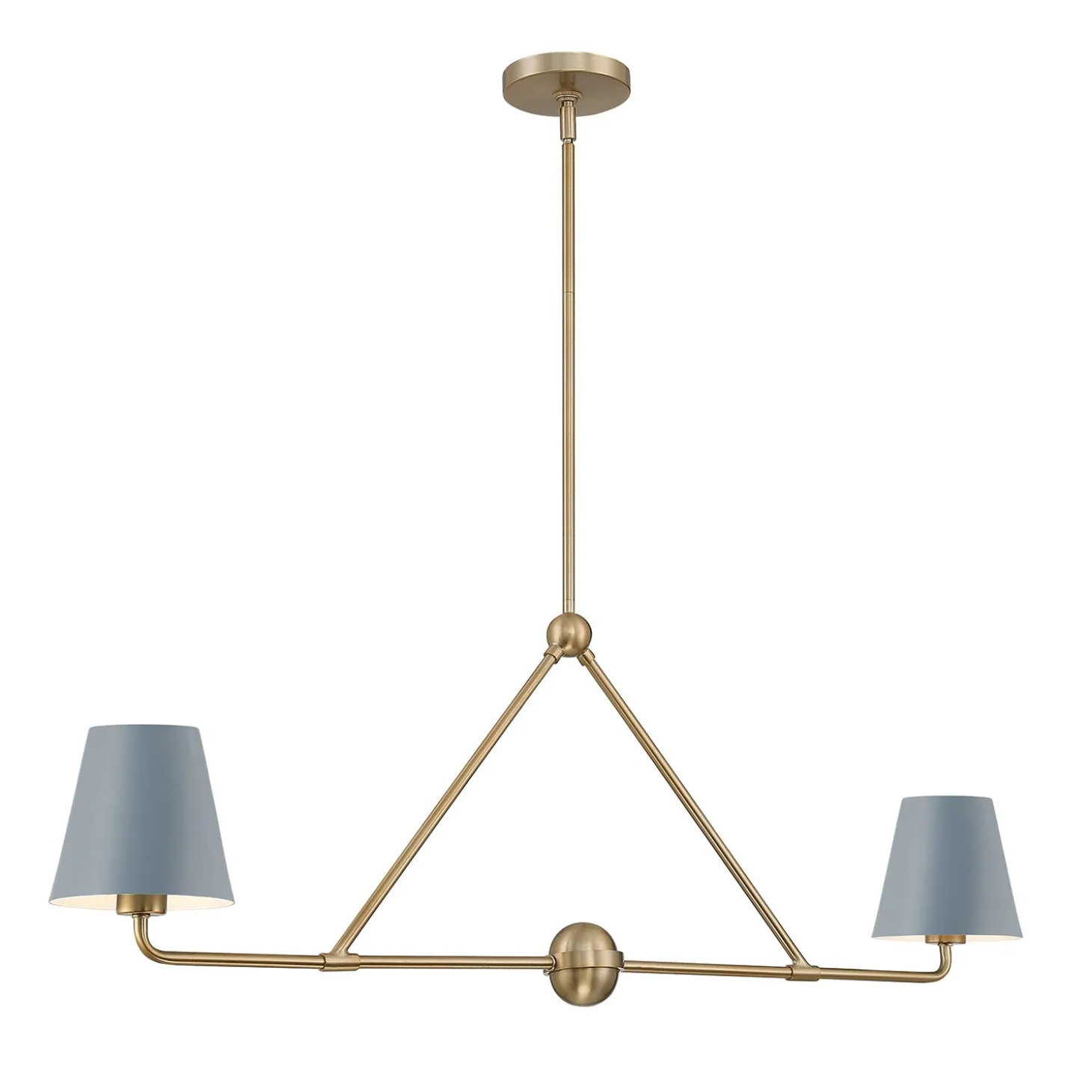 • A modern linear 42″ wide pendant finished in brass, with two French blue conical shades, with crisp white interiors for enhanced illumination