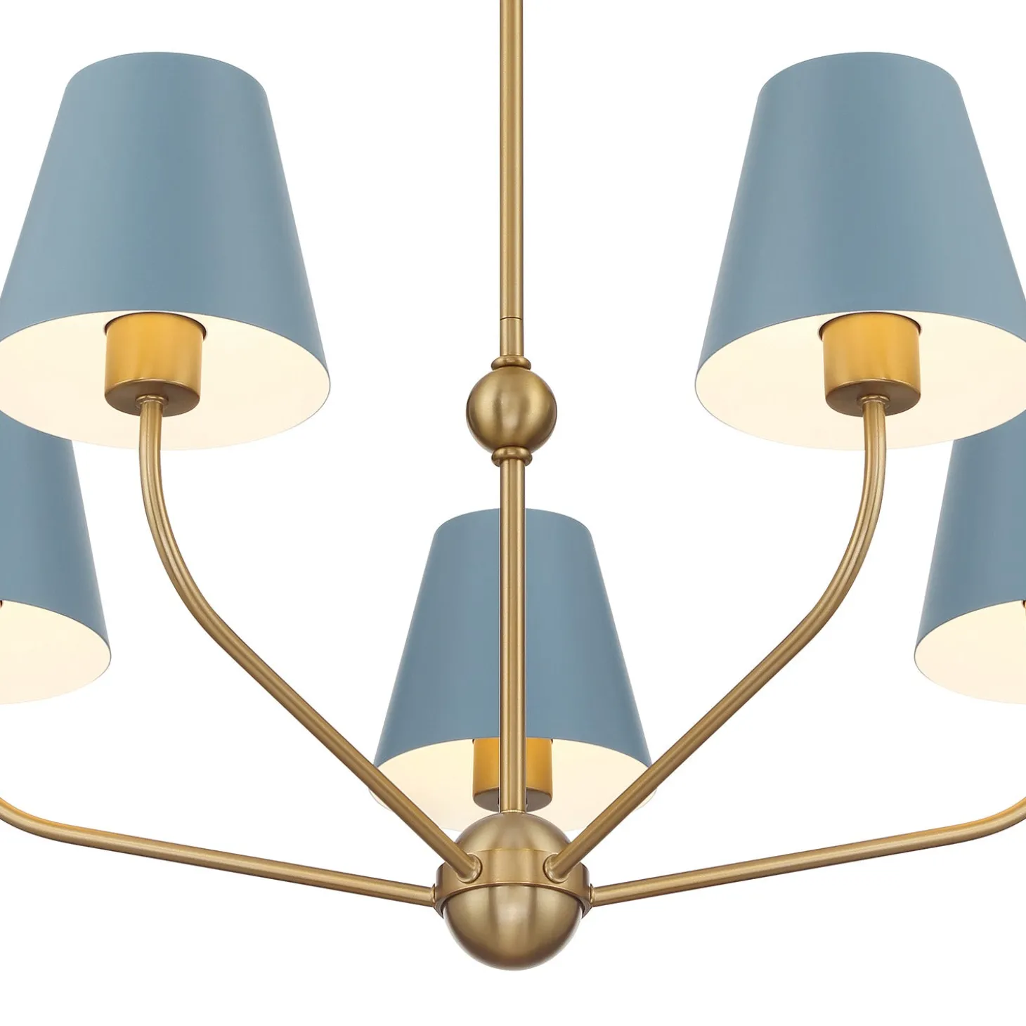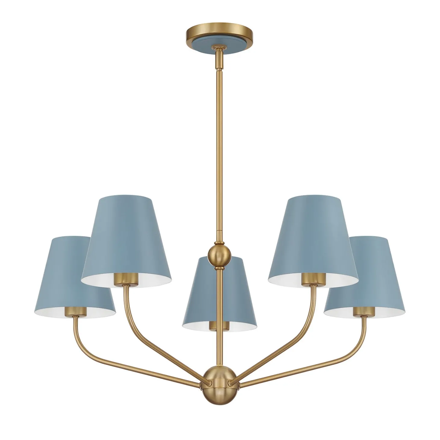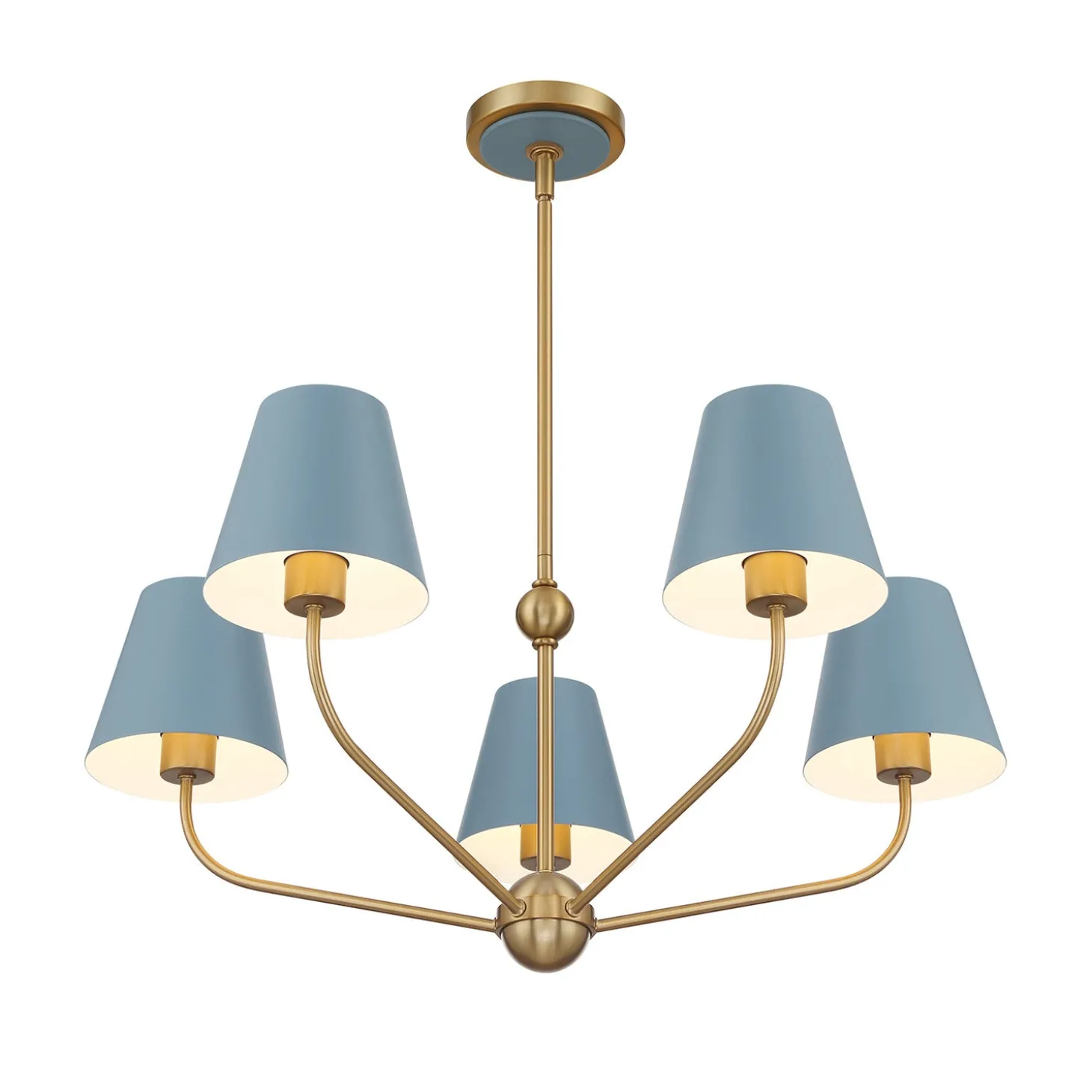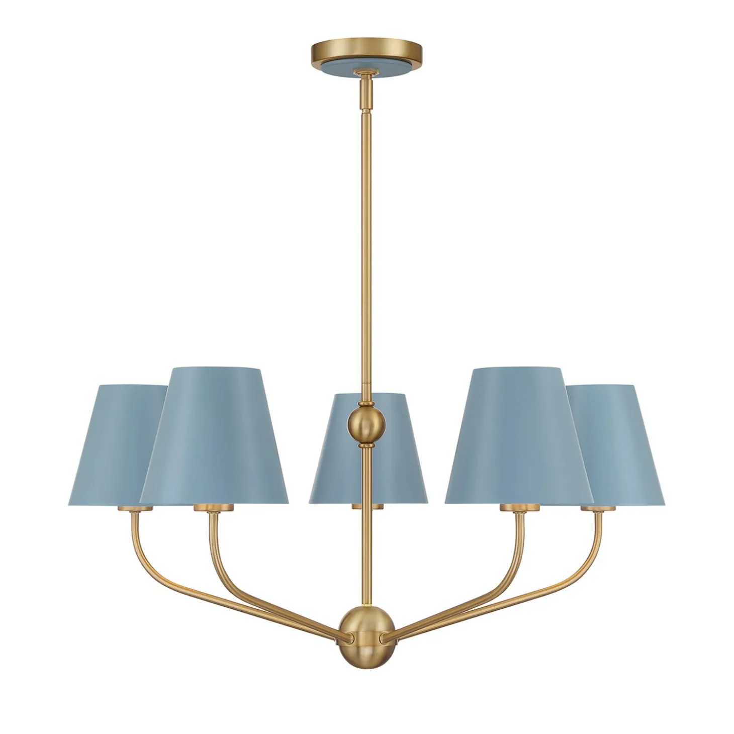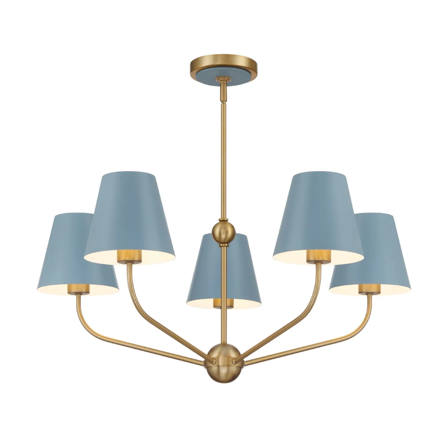 • A striking chandelier featuring five conical French blue shades with a brass body for a refined, vibrant look