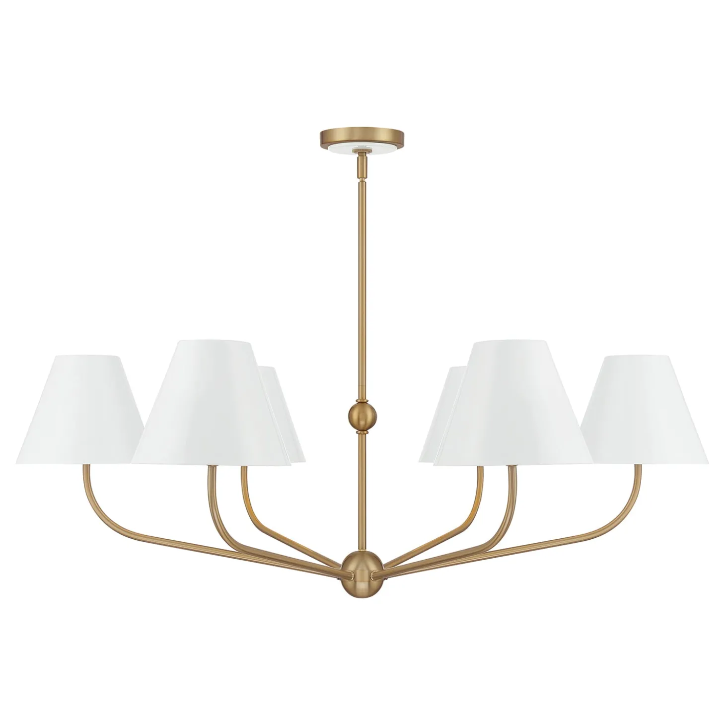 The Banks 6 Light Chandelier brings refined sophistication to dining rooms, entryways, or open living spaces. Featuring six white conical metal shades, this 40″ fixture offers soft, even illumination, while warm brass accents add a touch of timeless luxury. Its elegant proportions and balanced scale make it a perfect focal point, adding character and style to any room without overwhelming the space. This chandelier combines classic color with premium materials, creating a statement piece that complements a variety of interior styles.