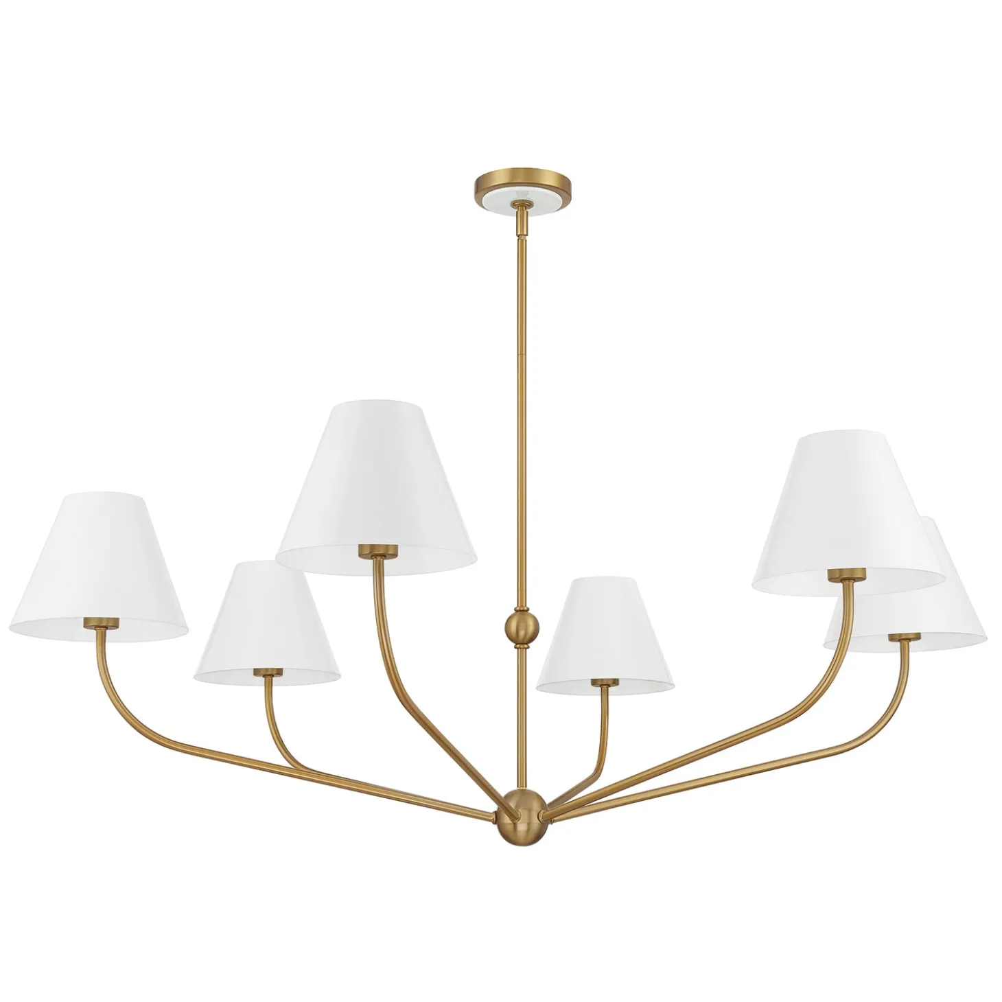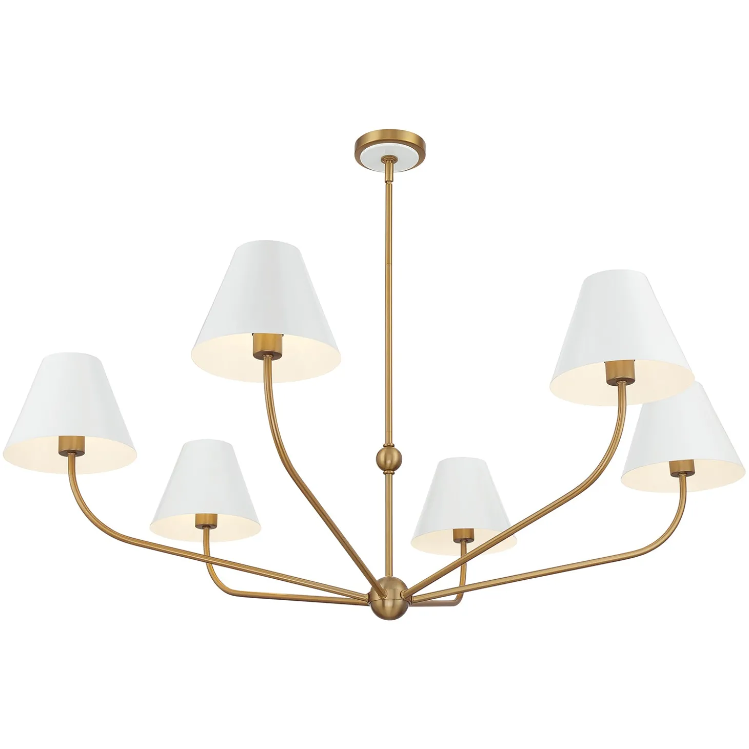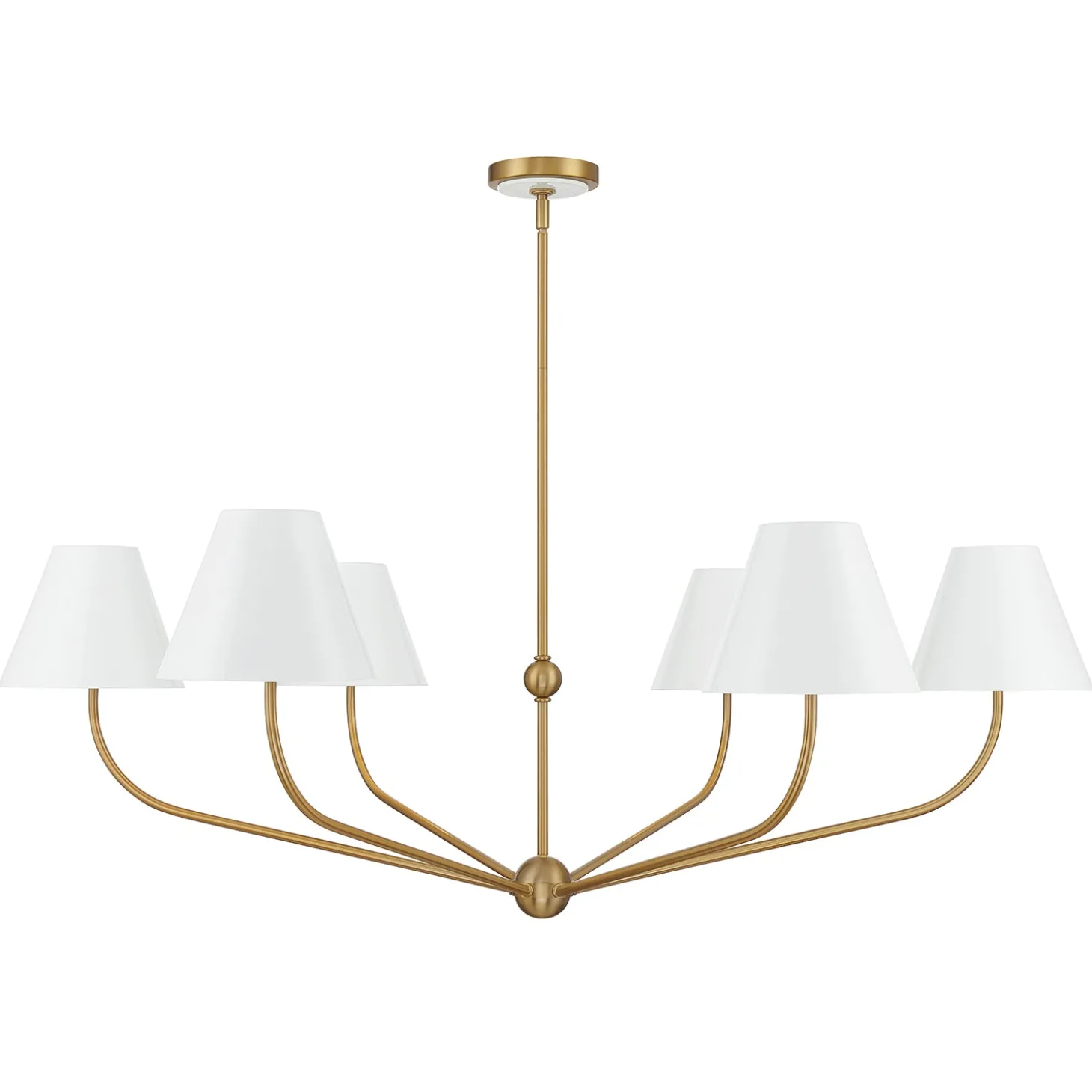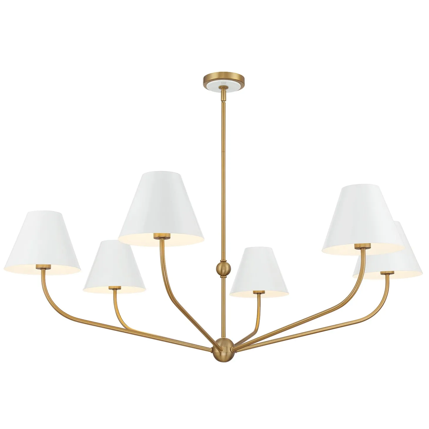 The Banks 6 Light Chandelier brings refined sophistication to dining rooms, entryways, or open living spaces. Featuring six white conical metal shades, this 48″ fixture offers soft, even illumination, while warm brass accents add a touch of timeless luxury. Its elegant proportions and balanced scale make it a perfect focal point, adding character and style to any room without overwhelming the space. This chandelier combines classic color with premium materials, creating a statement piece that complements a variety of interior styles.