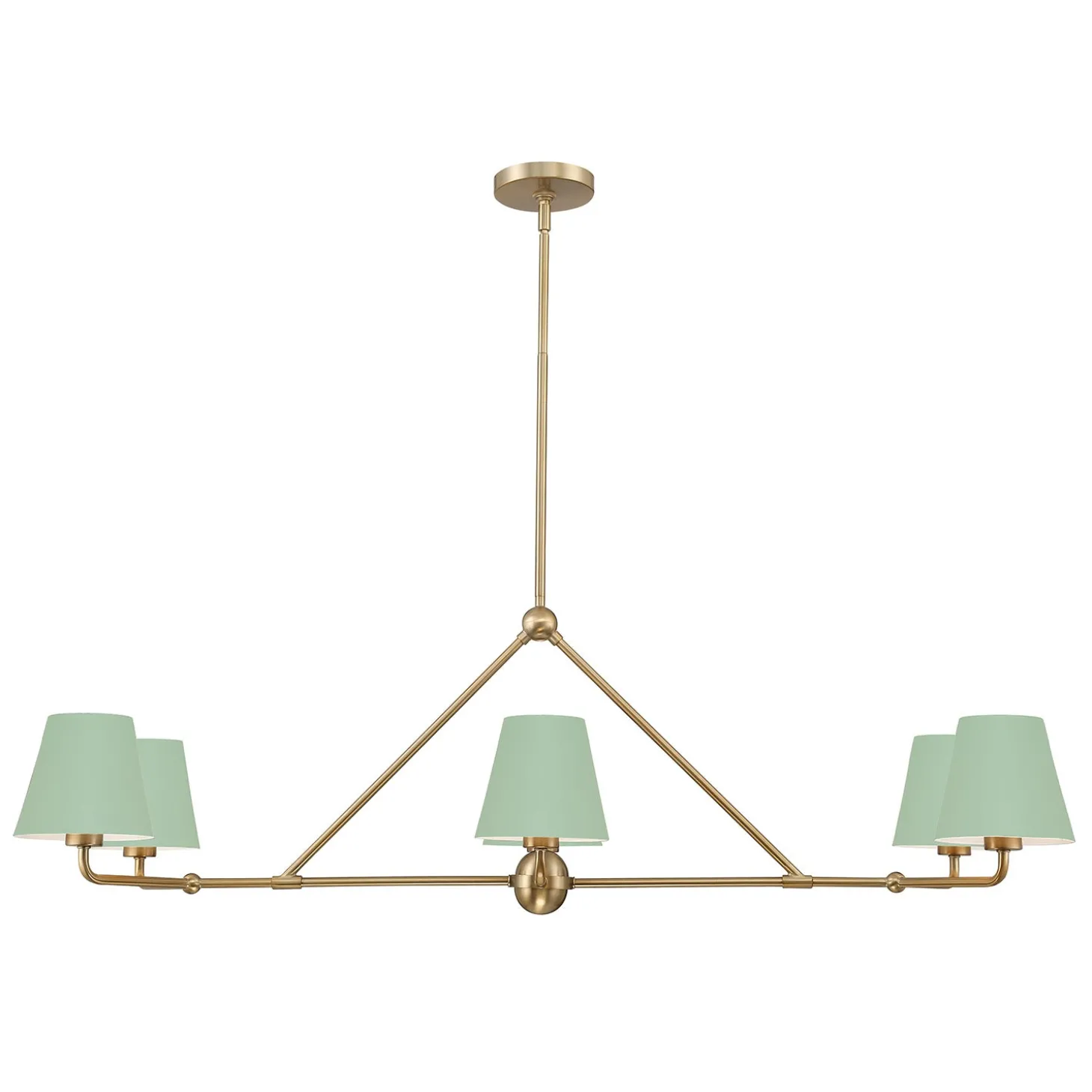 The Banks 6 Light Linear Chandelier makes a striking statement with its streamlined silhouette and refined contrast. Featuring six sage green conical shades with white interiors and a brass body, this fixture provides focused illumination, perfect for long dining tables, kitchen islands, or statement entryways. The combination of vibrant color and warm brass adds a sophisticated touch while effortlessly complementing a range of interior styles. Thoughtfully designed with clean lines and balanced proportions, this chandelier commands attention without overwhelming the space—an ideal fusion of presence and refinement for the modern home.