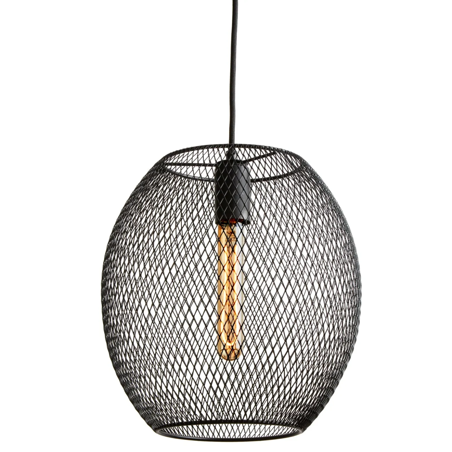 • This modern, industrial pendant light features a metal mesh shade, shaped in an oval silhouette, and finished in striking matte black