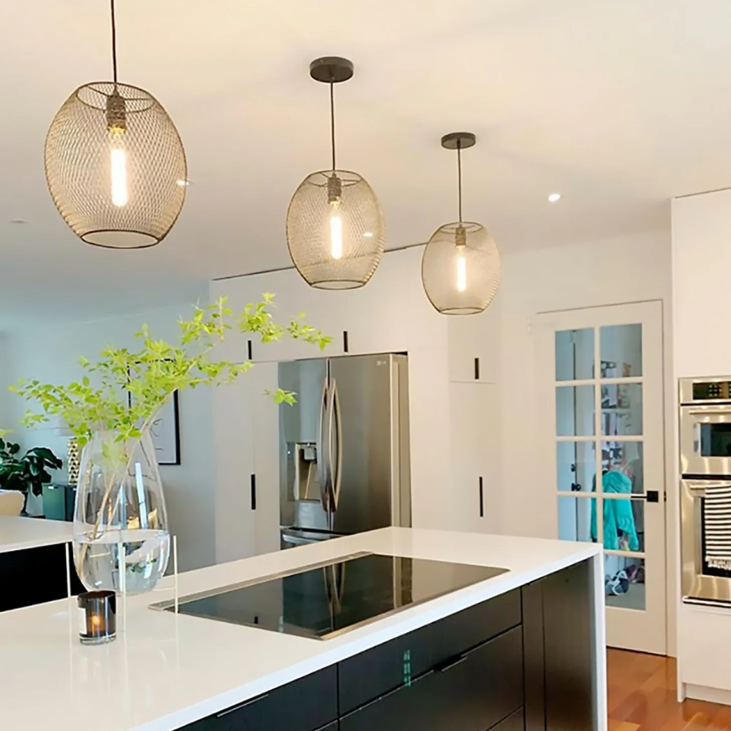 Modern, minimalistic, and versatile, the Bergen collection is both edgy and timeless. This oval mesh cage pendant light is our contemporary take on a classic, industrial fixture. Features a sleek, black metal cage frame that reveals the warm glow of a vintage-inspired Edison bulb of your choice. The large oval pendant light is suspended by an adjustable length black cord from a matching ceiling canopy. Striking in an office, a hallway, or in multiples over a kitchen island.