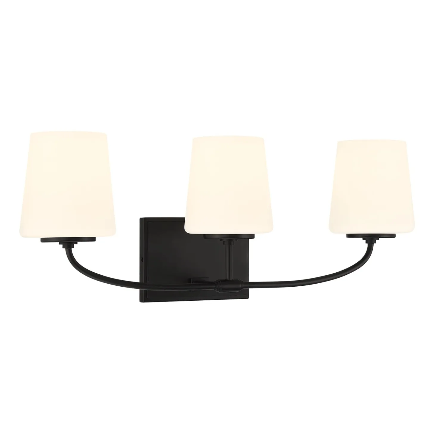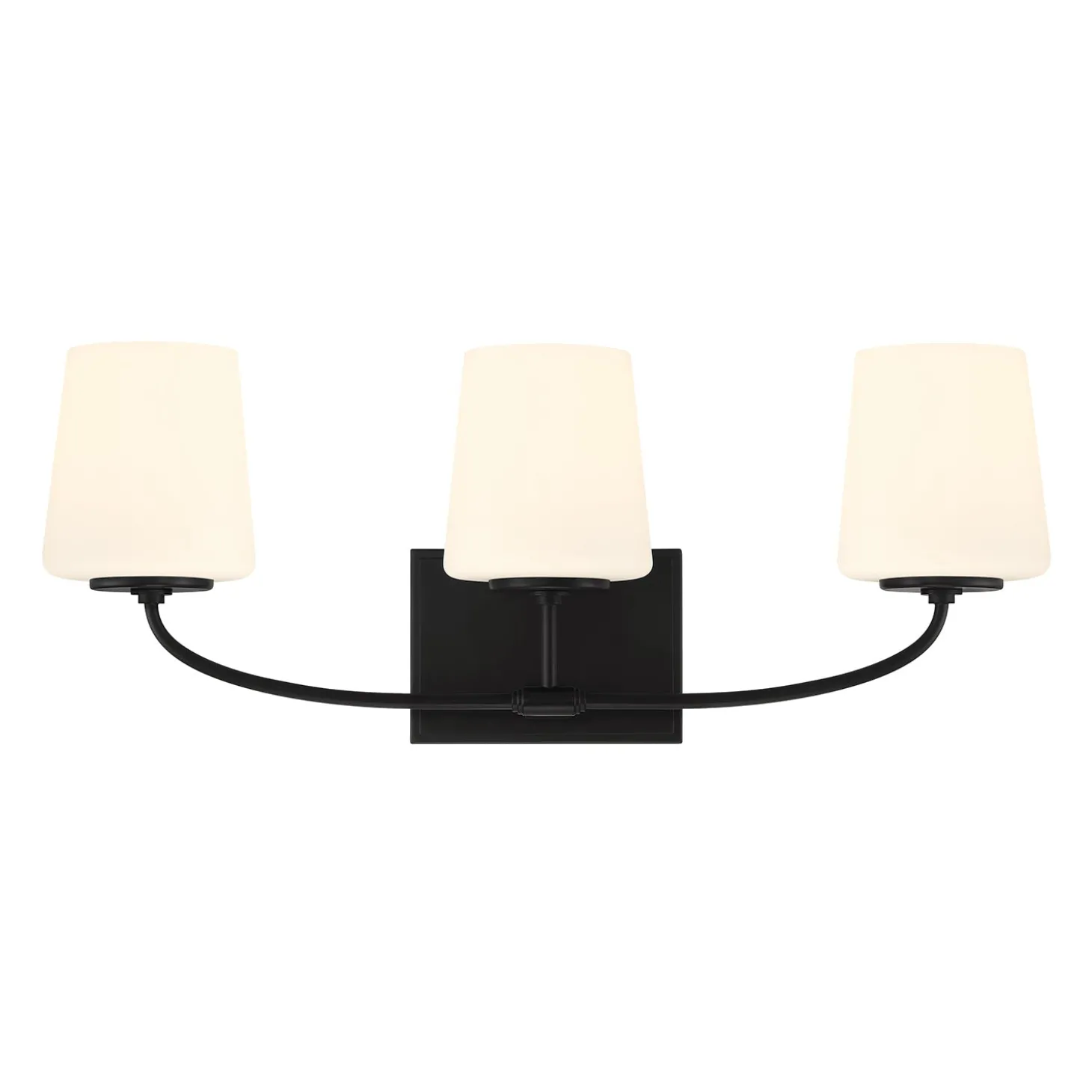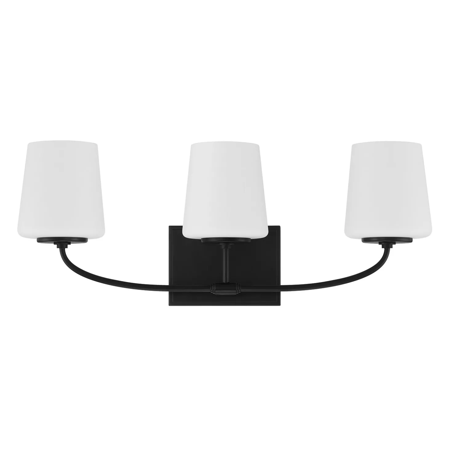 The Blake Vanity references a classic silhouette paired with a modern, sleek finish in distinctive matte black. Versatile and stylish, this transitional bath light makes a wonderful addition to your primary bathroom vanity and adds sophistication to your powder room. Featuring a slim, curved arm, mounted to a rectangular backplate, supporting three beautiful frosted glass shades, this 24” vanity light provides substantial illumination for your room.
