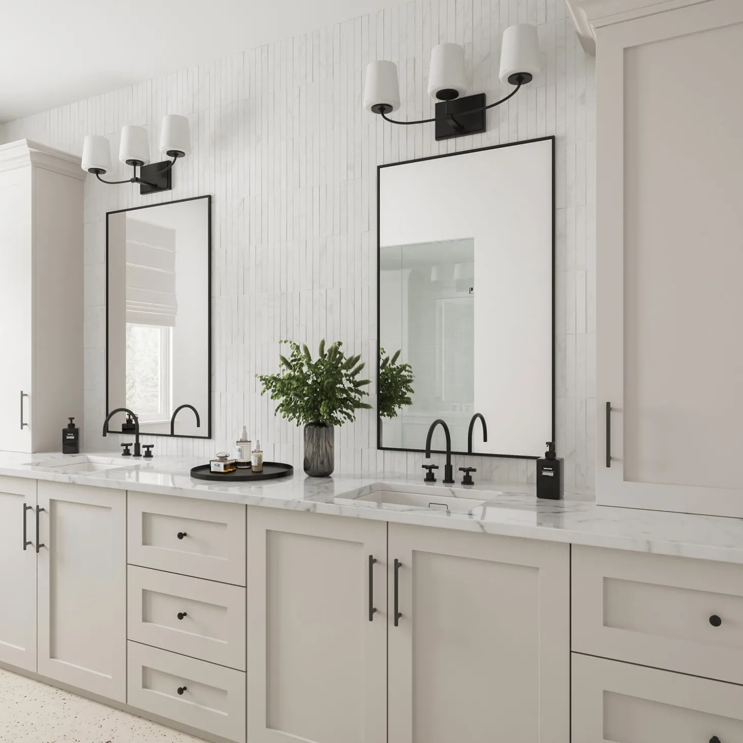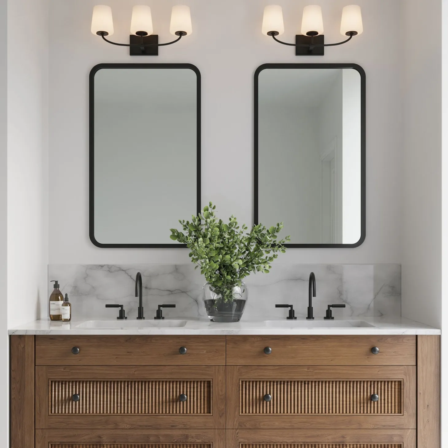 • Three tapered, frosted glass shades create a soft, diffused light for daily grooming tasks