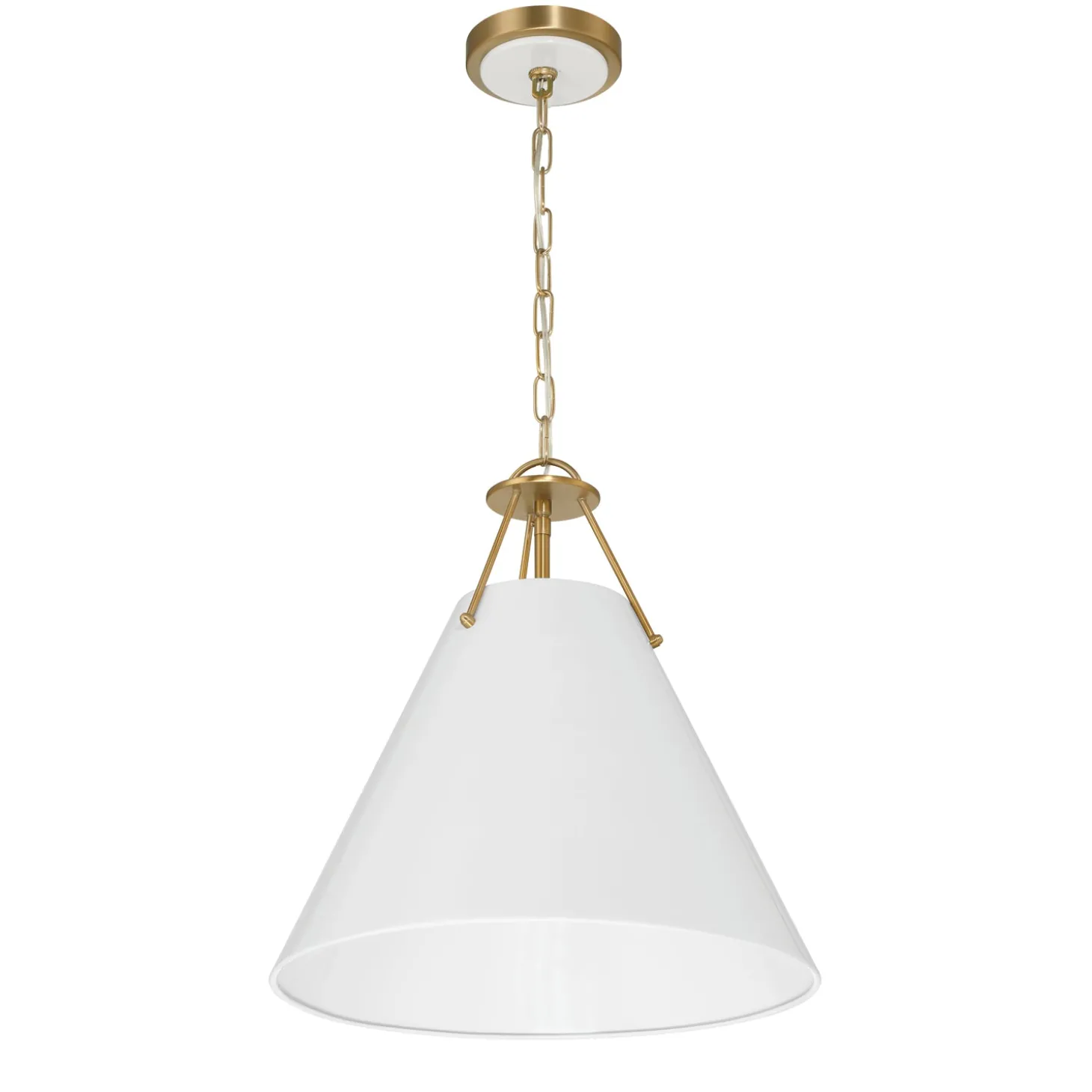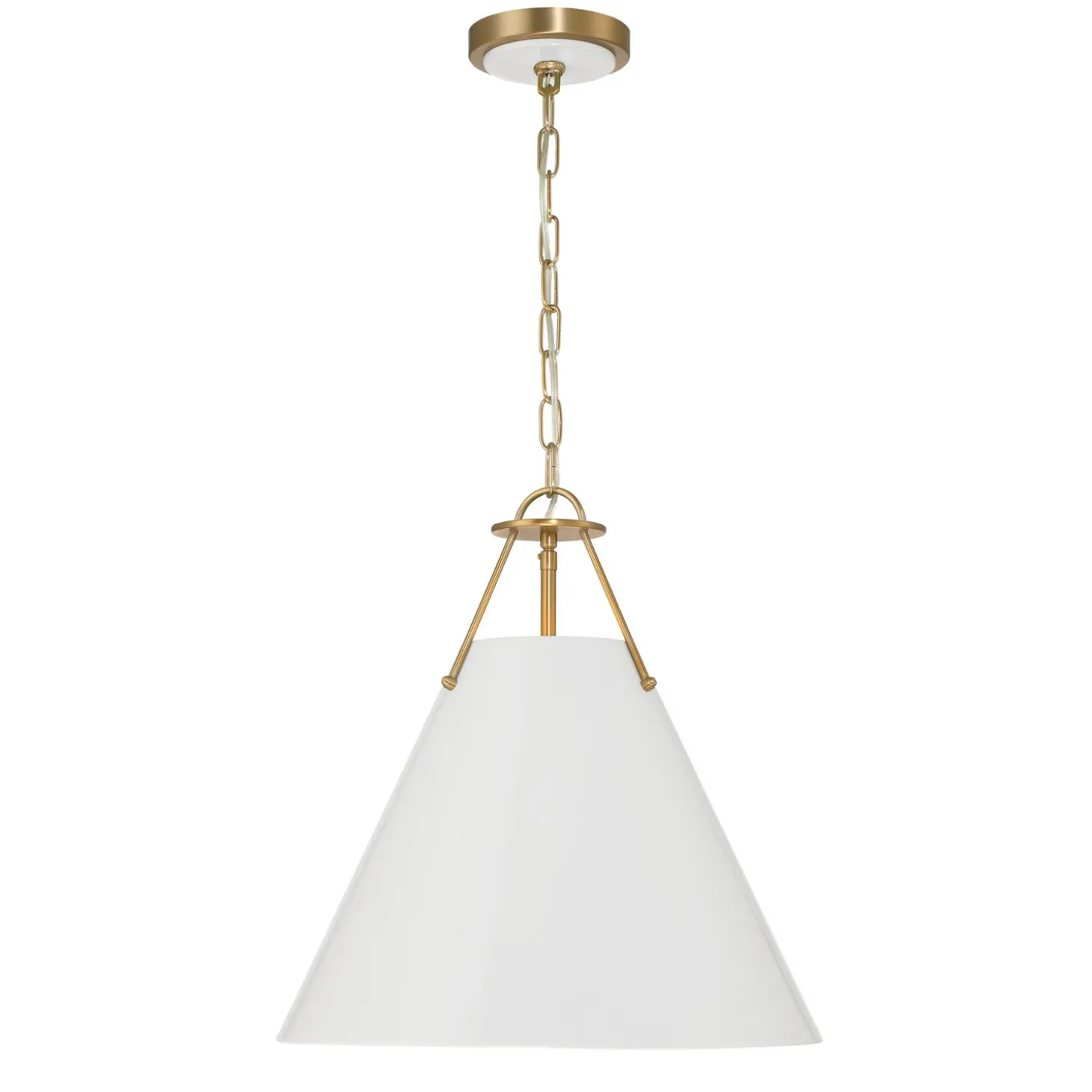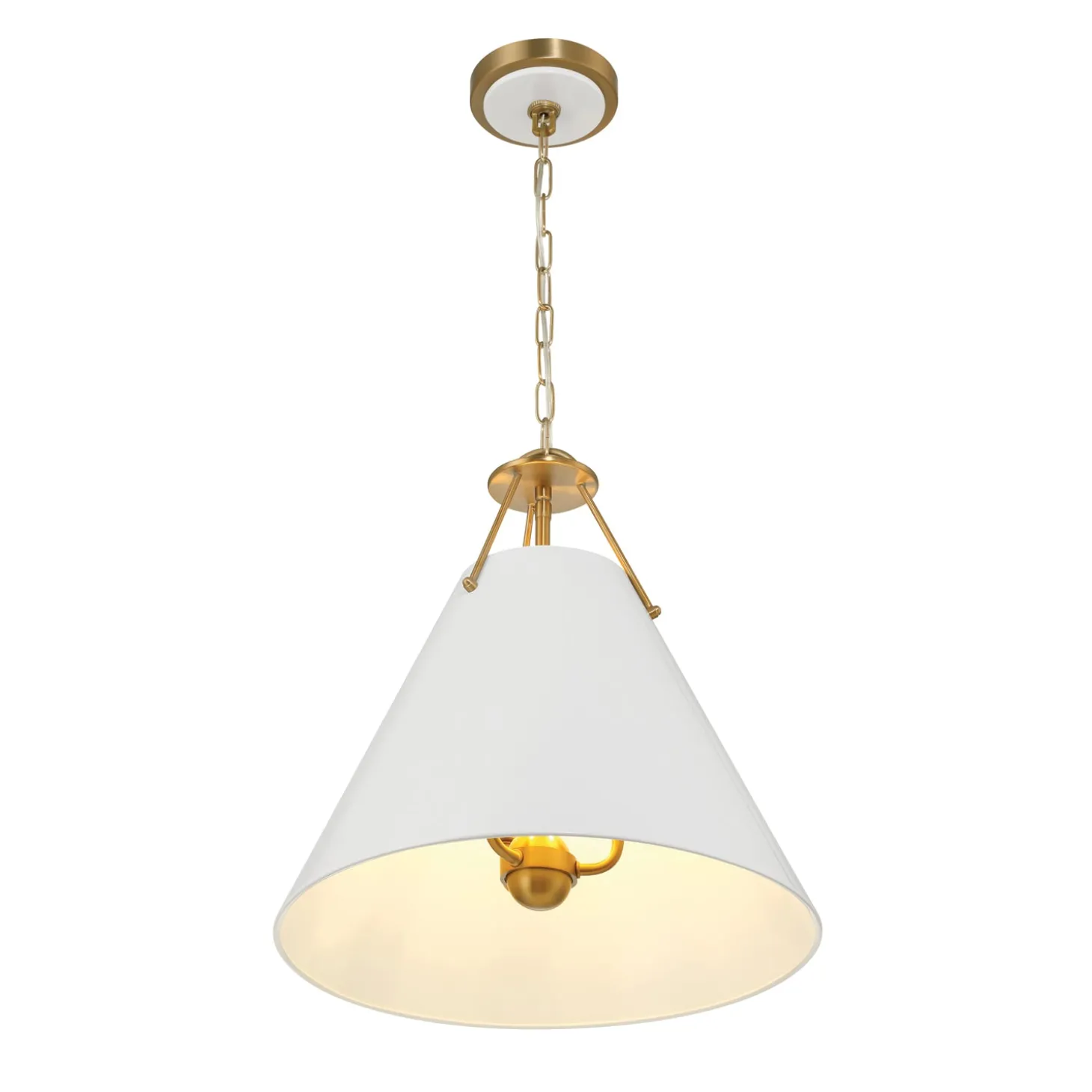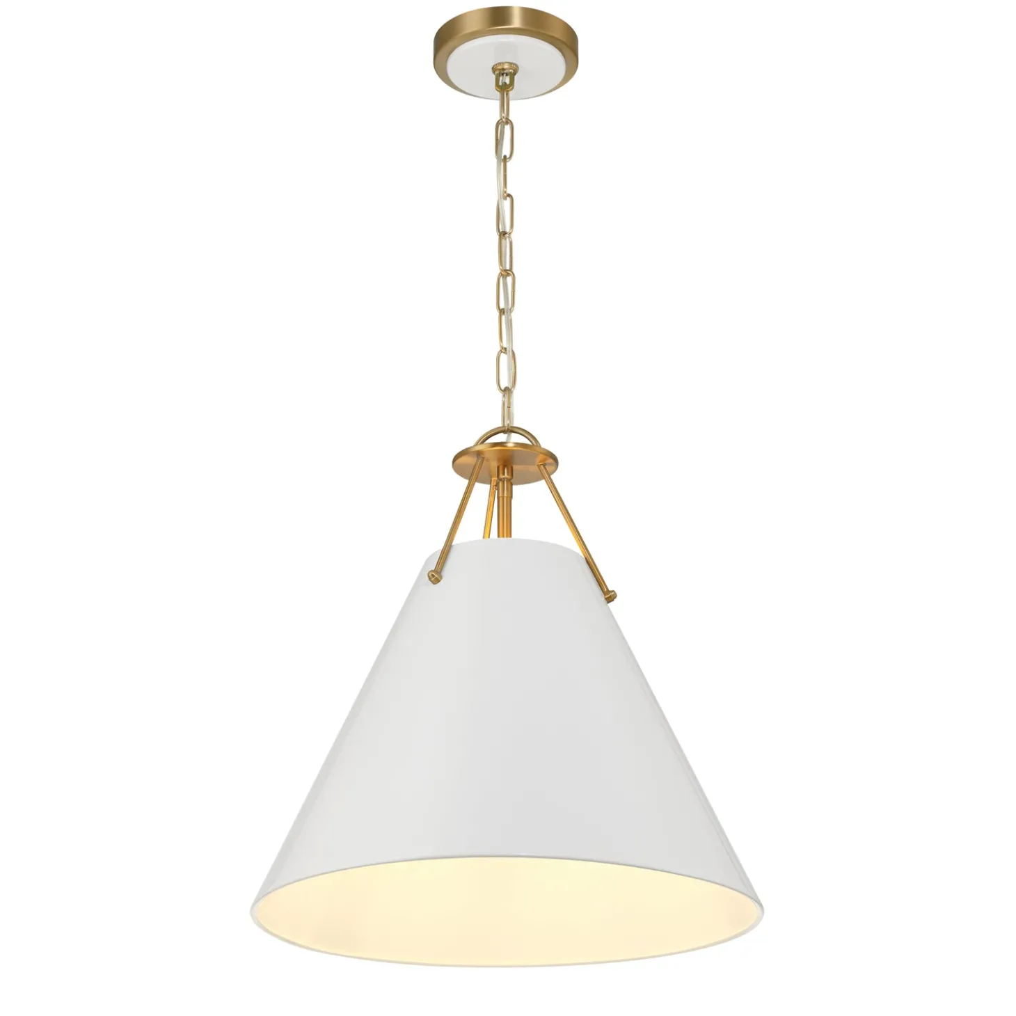 The Bowie Medium 16″ Metal Pendant blends modern simplicity with timeless appeal, featuring a sleek conical metal shade in white. The crisp white interior enhances illumination, providing ambient light that enhances any room. Perfectly proportioned for medium to larger spaces, this pendant makes a striking statement on its own or in multiples over kitchen islands, dining tables, or entryways. Designed for versatility, it offers an adjustable hanging height, allowing for a tailored fit in any space. With its sophisticated white finish, the Bowie seamlessly integrates into a variety of interiors, offering a refined balance of form and function.