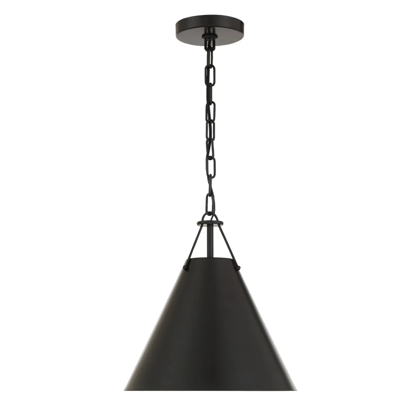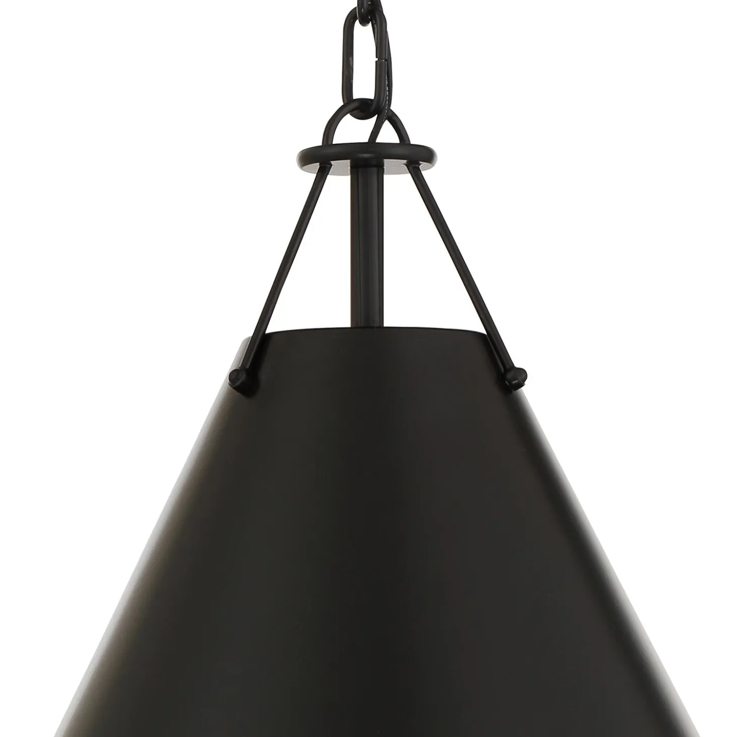 The Bowie Small 12″ Metal Pendant blends modern simplicity with timeless appeal, featuring a sleek conical metal shade in a matte black finish. The crisp white interior enhances illumination, casting a focused downward light ideal for task lighting. Perfectly proportioned for smaller spaces, this pendant makes a striking statement on its own or in multiples over kitchen islands, breakfast bars, or dining tables. Designed for versatility, it offers an adjustable hanging height, allowing for a tailored fit in any space. With its sophisticated monochrome finish, the Bowie seamlessly integrates into a variety of interiors, offering a refined balance of form and function.
