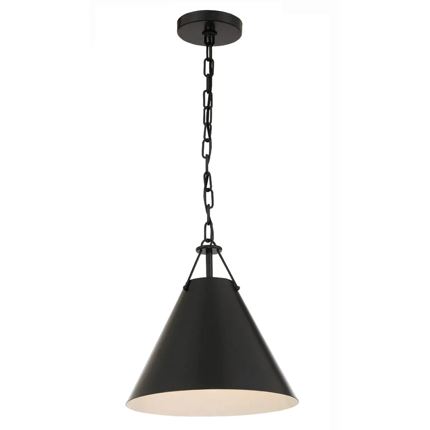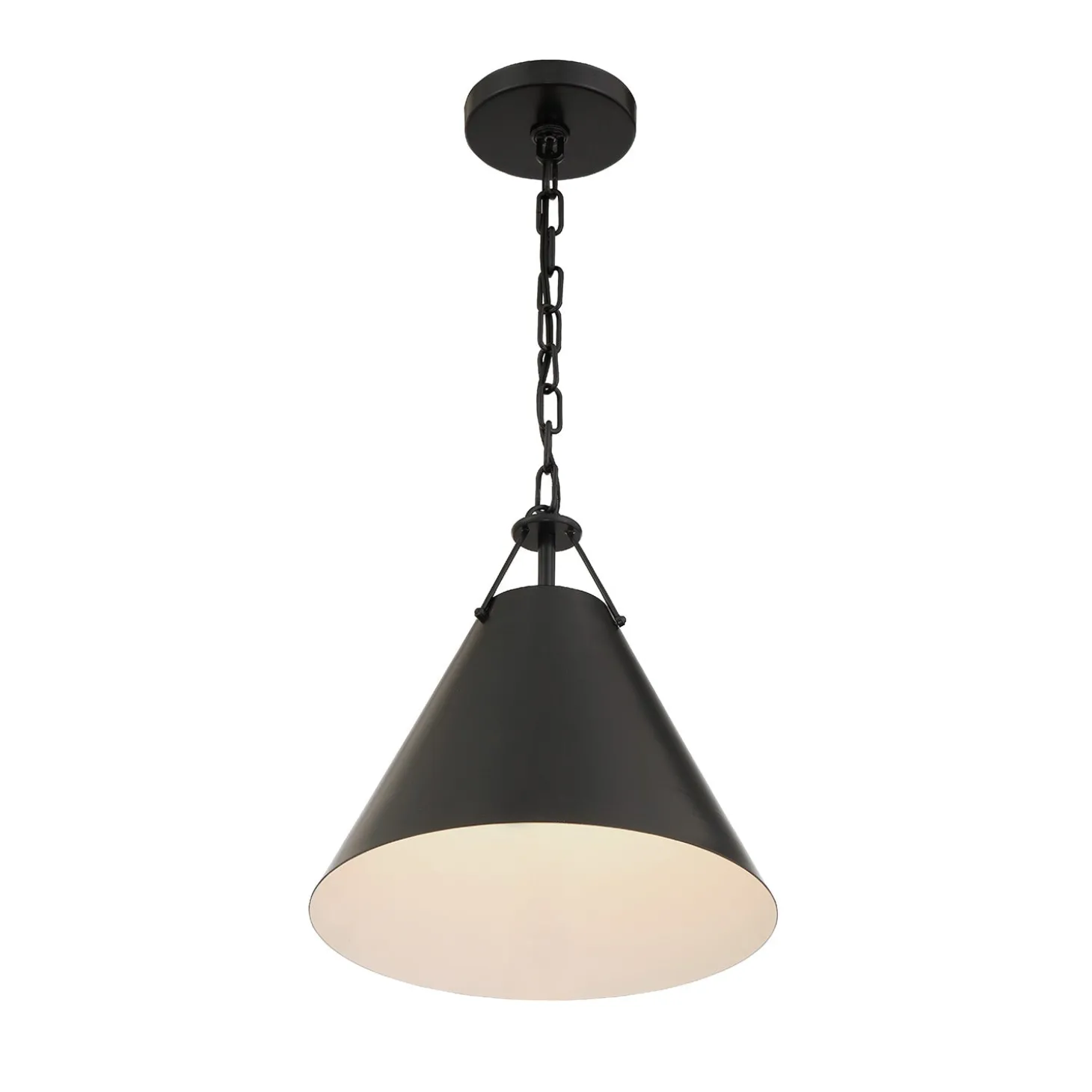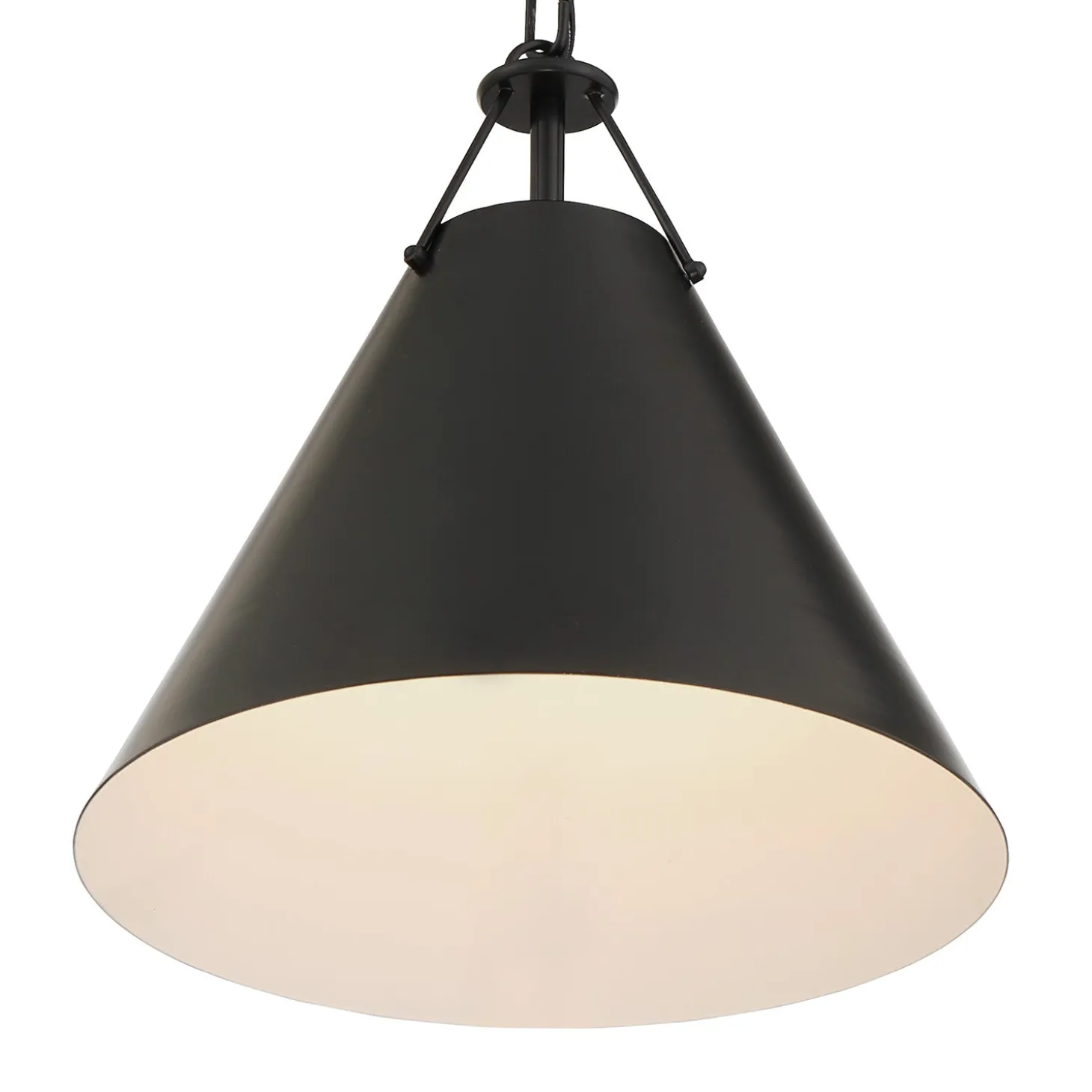 • A single-bulb pendant light with a conical metal shade, finished in matte black with a crisp white interior for enhanced illumination