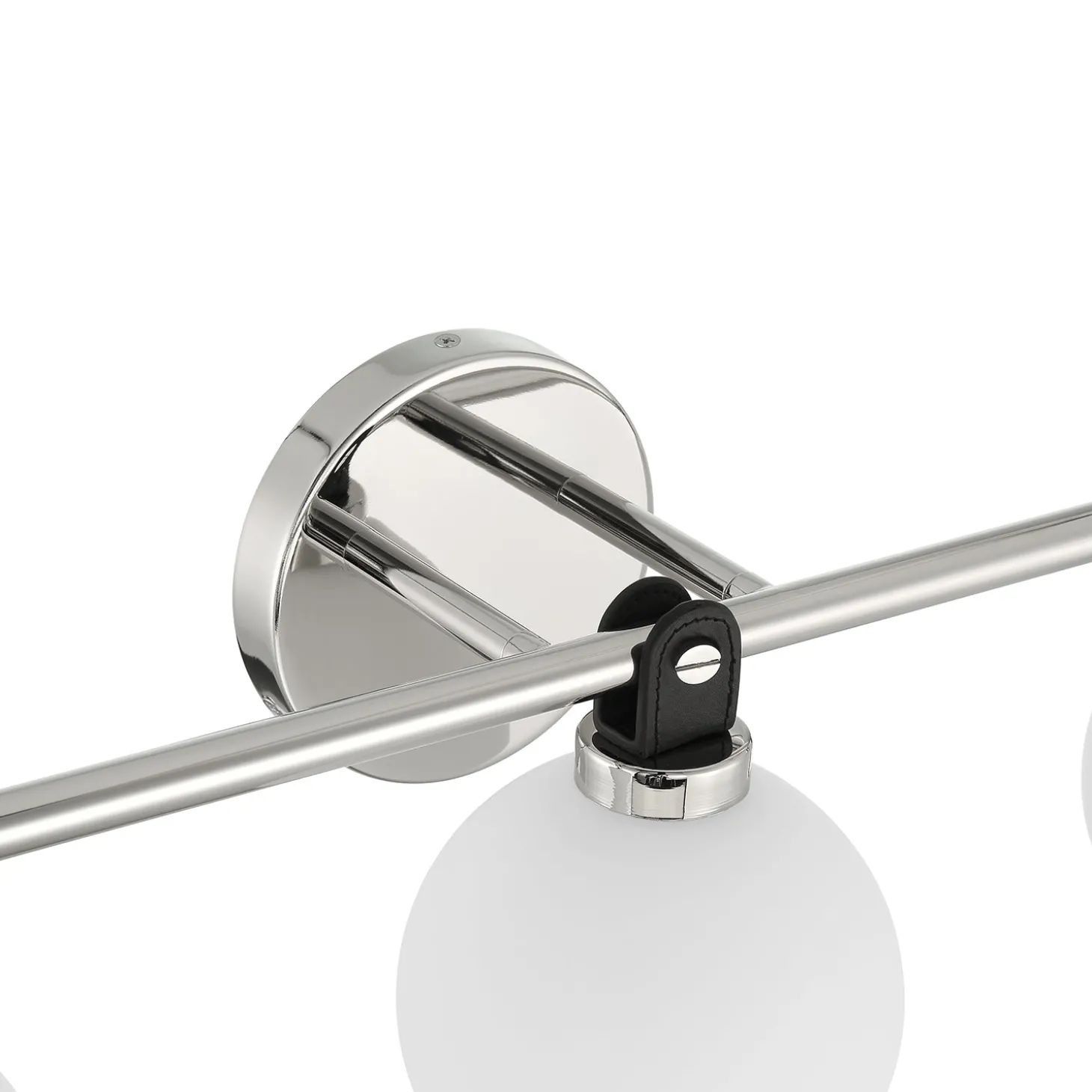 Elevate your bathroom decor with the Bryce 3 Globe LED Vanity. This stylish and modern wall light makes extraordinary use of mixed materials and features a polished nickel metal crossbar frame mounted onto a matched round backplate. Authentic black leather detailing on the shade holder suspends three opal glass globes and gives this contemporary bathroom vanity light a rich and warm quality. The Bryce 3 Globe Vanity is an LED wall light that is fully dimmable, creating the ideal mood for your bathroom. It utilizes three bright G9 LED bulbs, included in the box, for long-lasting quality vanity lighting. This luxurious fixture is also available in a matching wall sconce.