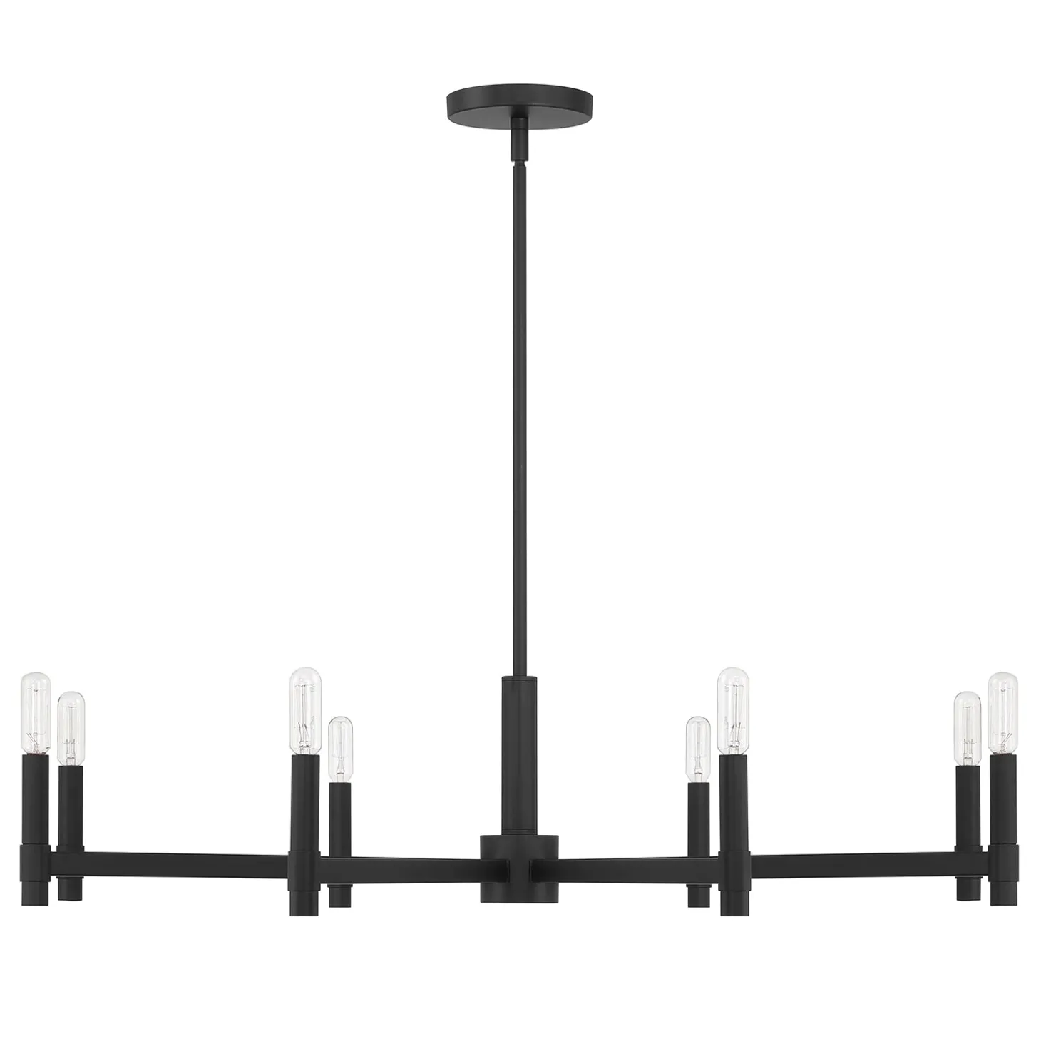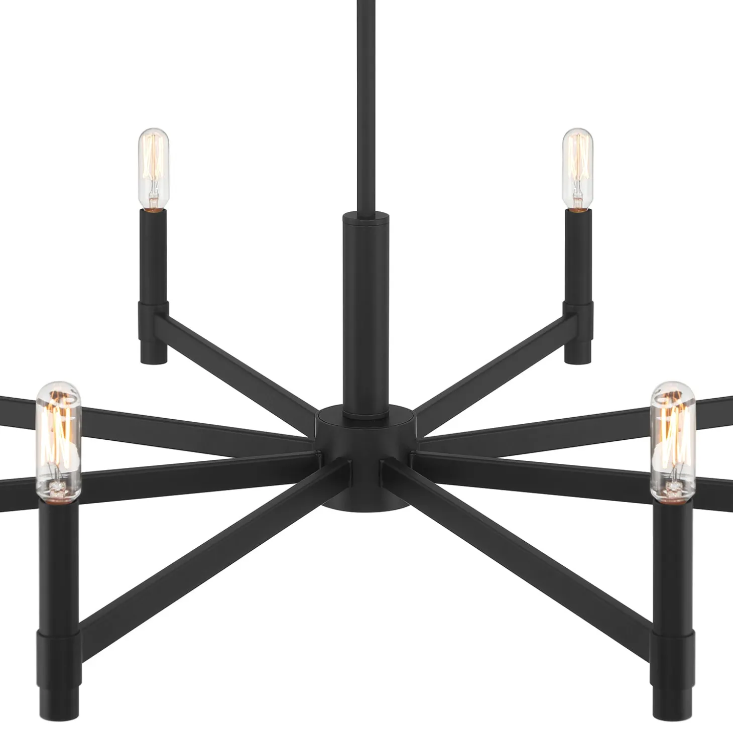 The Carson 8 Light Chandelier features our minimal, industrial approach to a traditional chandelier shape. Eight slender, matte black arms radiate from a central hub, each ending with a simple vertical pipe housing an E12 socket. This beautiful ceiling light works well in traditional, modern, or transitional spaces. The 8 light Carson is 36″ in diameter and is suitable for sloped-ceiling applications. Ideal as the focal point in entryways and bedrooms, or as complimentary statement lighting over a dining table.
