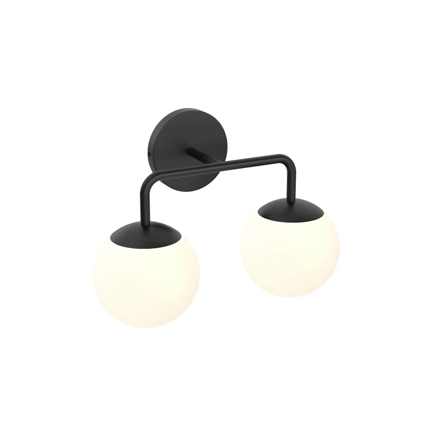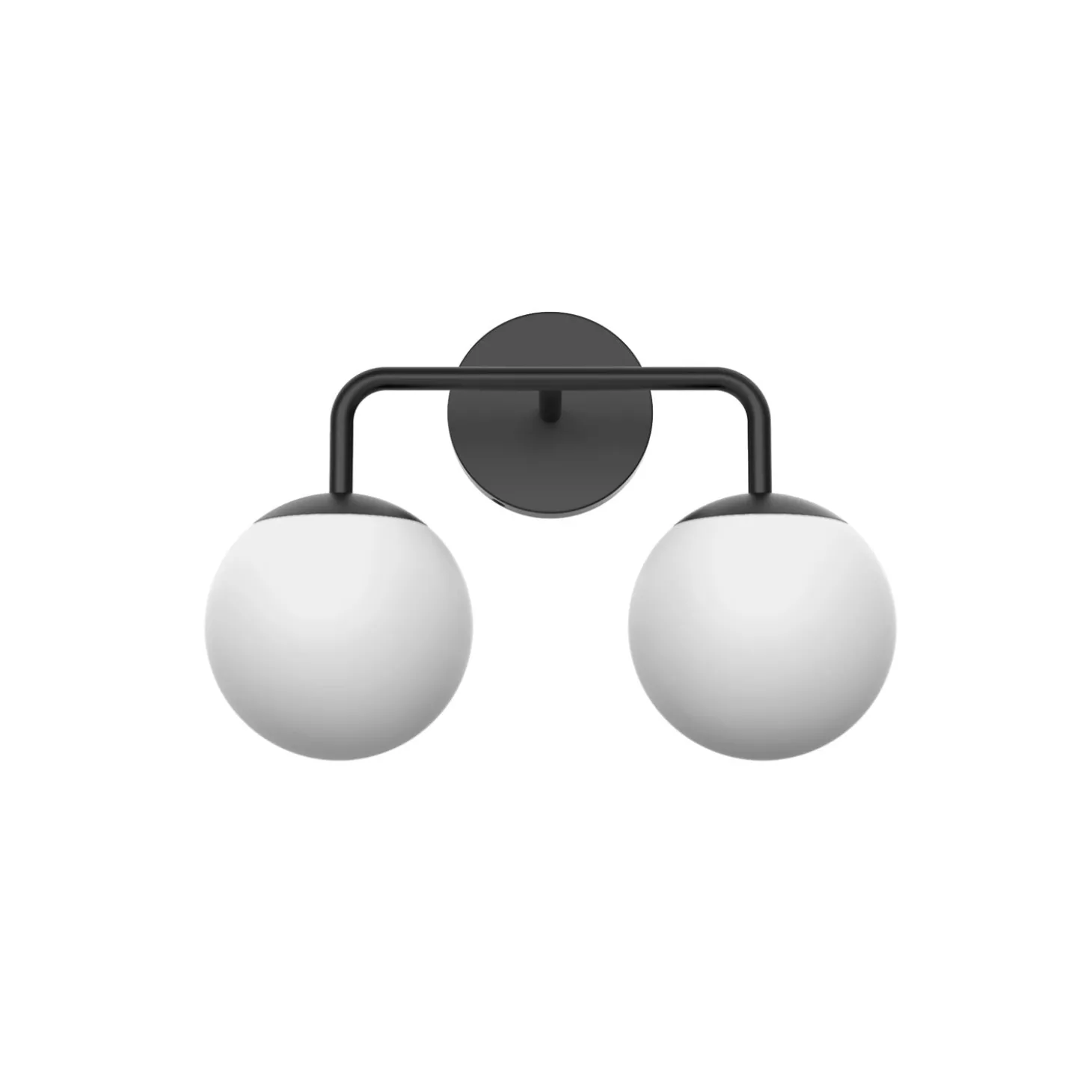 The Castell 2 Globe Vanity Light is a contemporary spin on a mid-century modern classic. Features two frosted glass globes crowned with a spun-metal cap and suspended by elegant, curved arms – all in a modern, dramatic matte black finish. Ideal in pairs; add ambient, yet direct light in a powder room or bathroom above a mirror.
