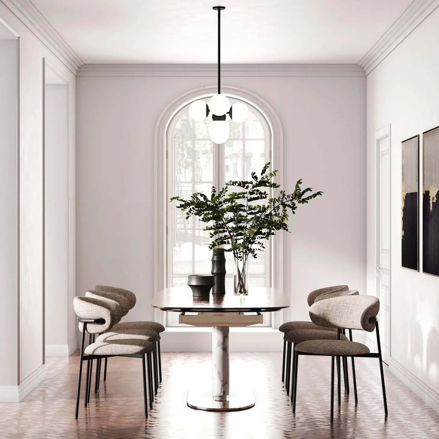 The Castell 6 Globe Pendant Light is a modern spin on a mid-century classic. Features six frosted glass globes with spun-metal caps suspended along a striking central bar. The fixture hangs from a compact circular canopy and matching down rods. Endlessly efficient, this LED fixture walks the line between ultra modern technology and retro-style. The 45″ long chandelier comes ready to install with six dimmable, high-lumen LED bulbs and a sloped ceiling adapter. The striking matte black finish is a showstopper, making this piece perfect in a prominent place above a dining room table or in a living room. This large fixture also works well as a chandelier or in place of multiple pendant lights over a big kitchen island.