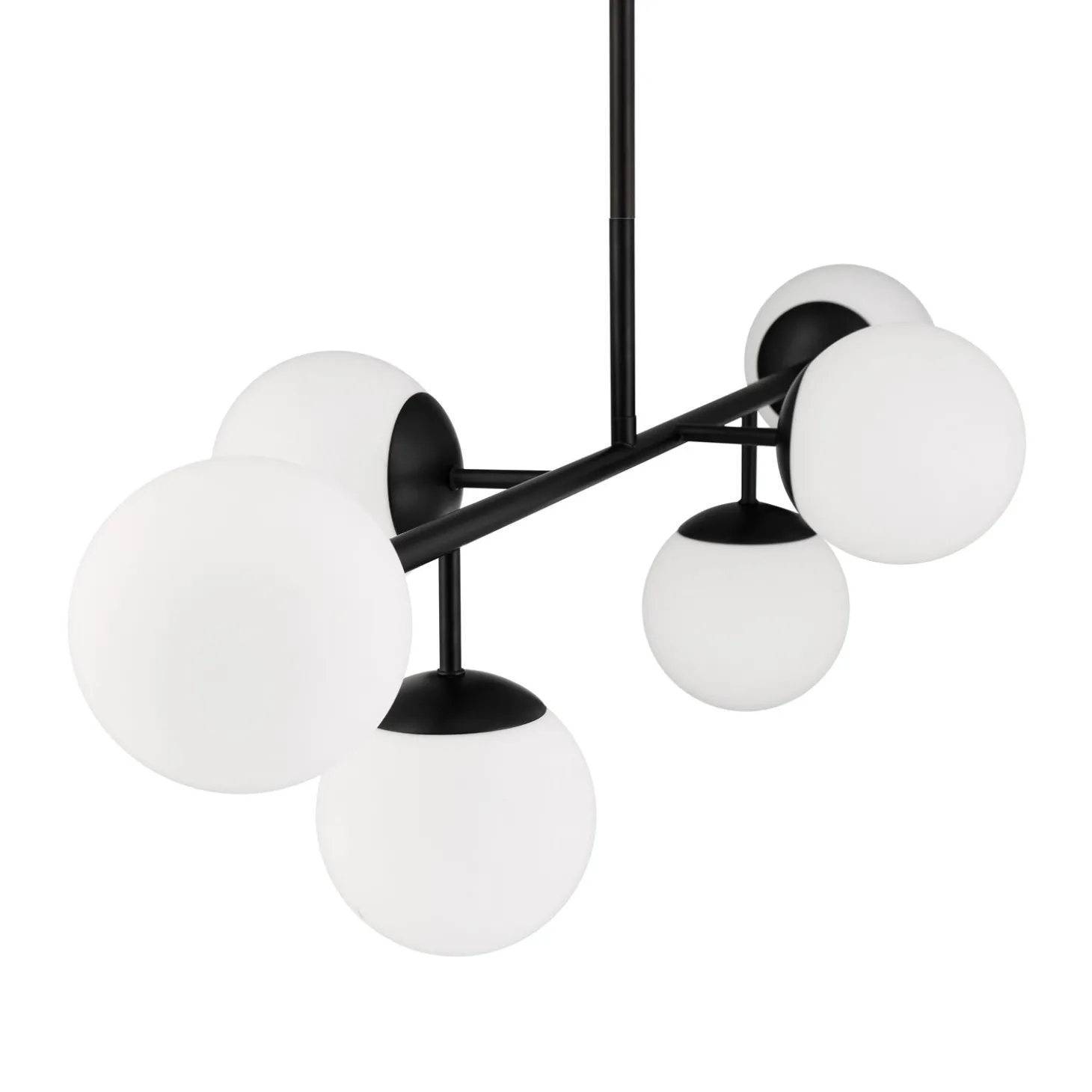 • Features six frosted white glass orbs topped with spun-metal, matte black caps, reaching out from a central bar and suspended by matching rods