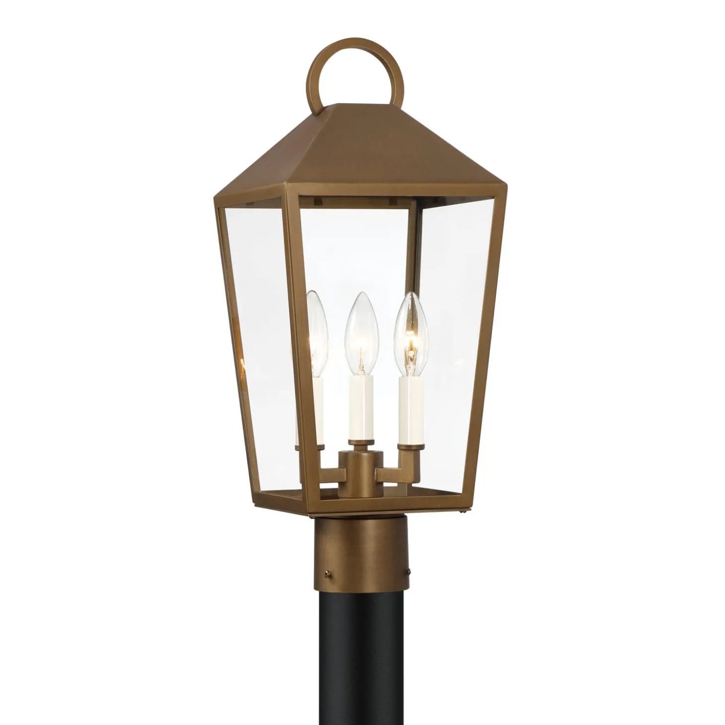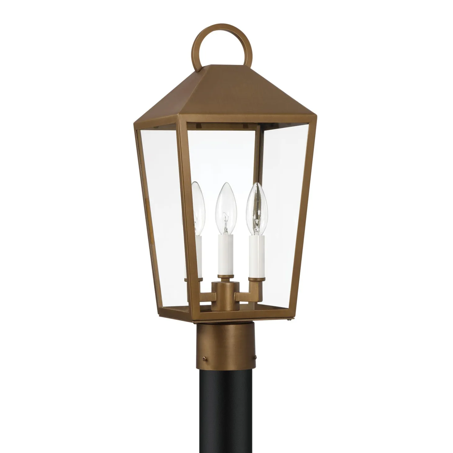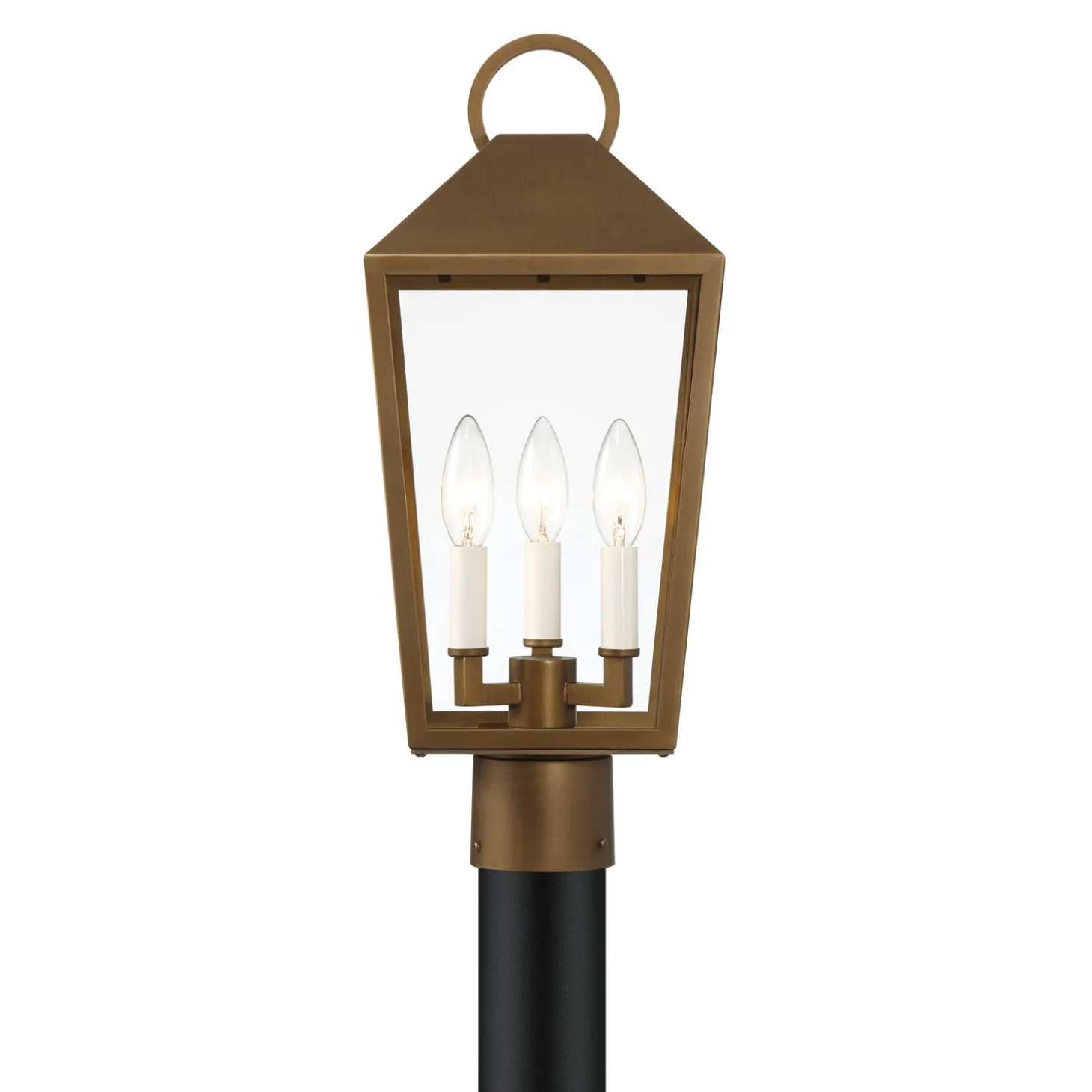 The Cole Outdoor Post Light is a timeless and classic lantern design with a modern sensibility. A slightly tapered silhouette reveals simple lines that seamlessly frame clear glass side panels and three candelabra style bulbs. The 19.25″ tall outdoor post light is topped with a weatherproof canopy that blends harmoniously with the frame and accentuates the arching ring detail. This sturdy outdoor light is designed to withstand the elements, complete with a burnished brass, powder-coated finish, and wet-rating. This outdoor light will add a charming appeal to any front yard, walkway, or outdoor living space. This versatile fixture can be mounted atop a round metal post; alternately, it can be mounted to other surfaces with a pier mount. Both mounting options are sold separately and come in matte black. This outdoor post light is part of the larger Cole Outdoor Lighting collection, including wall and hanging lights to complete your exterior lighting project.