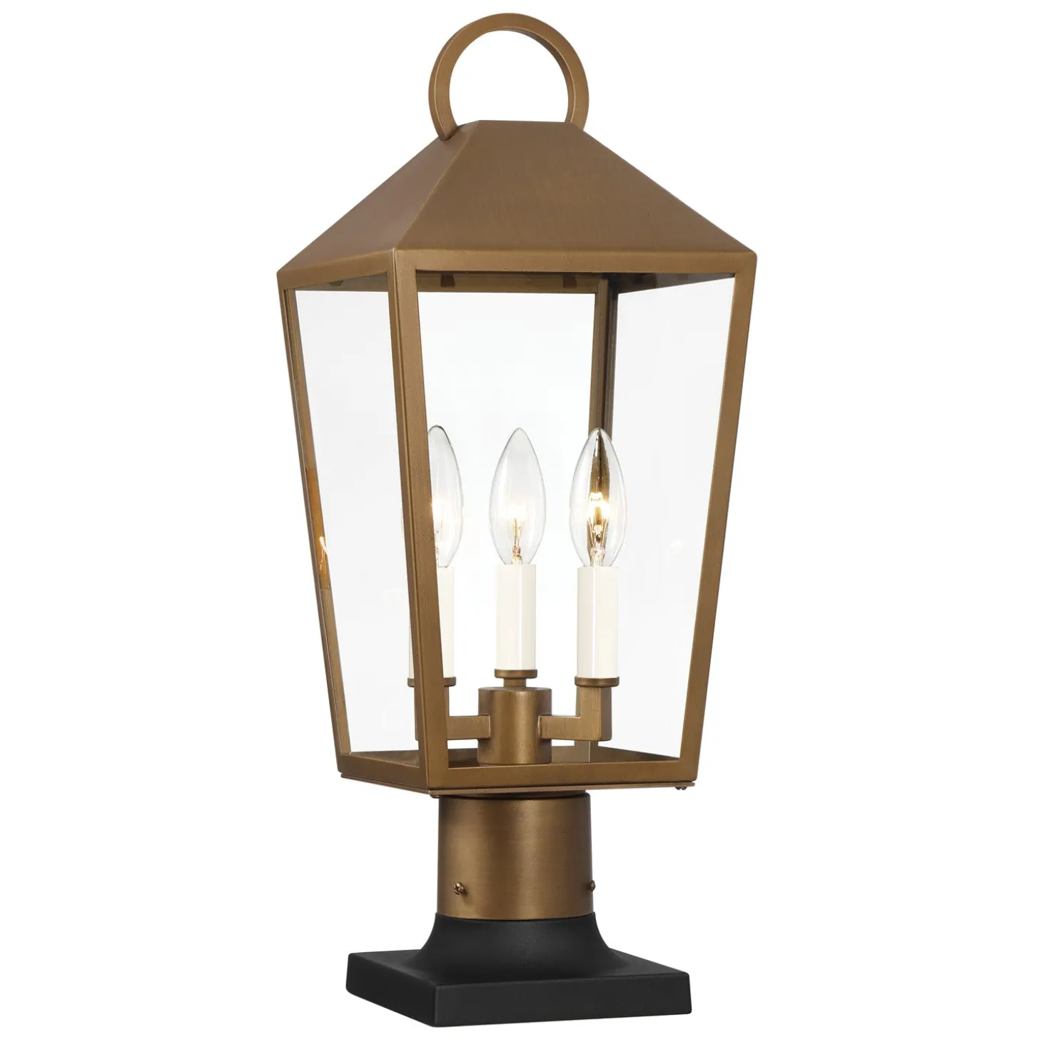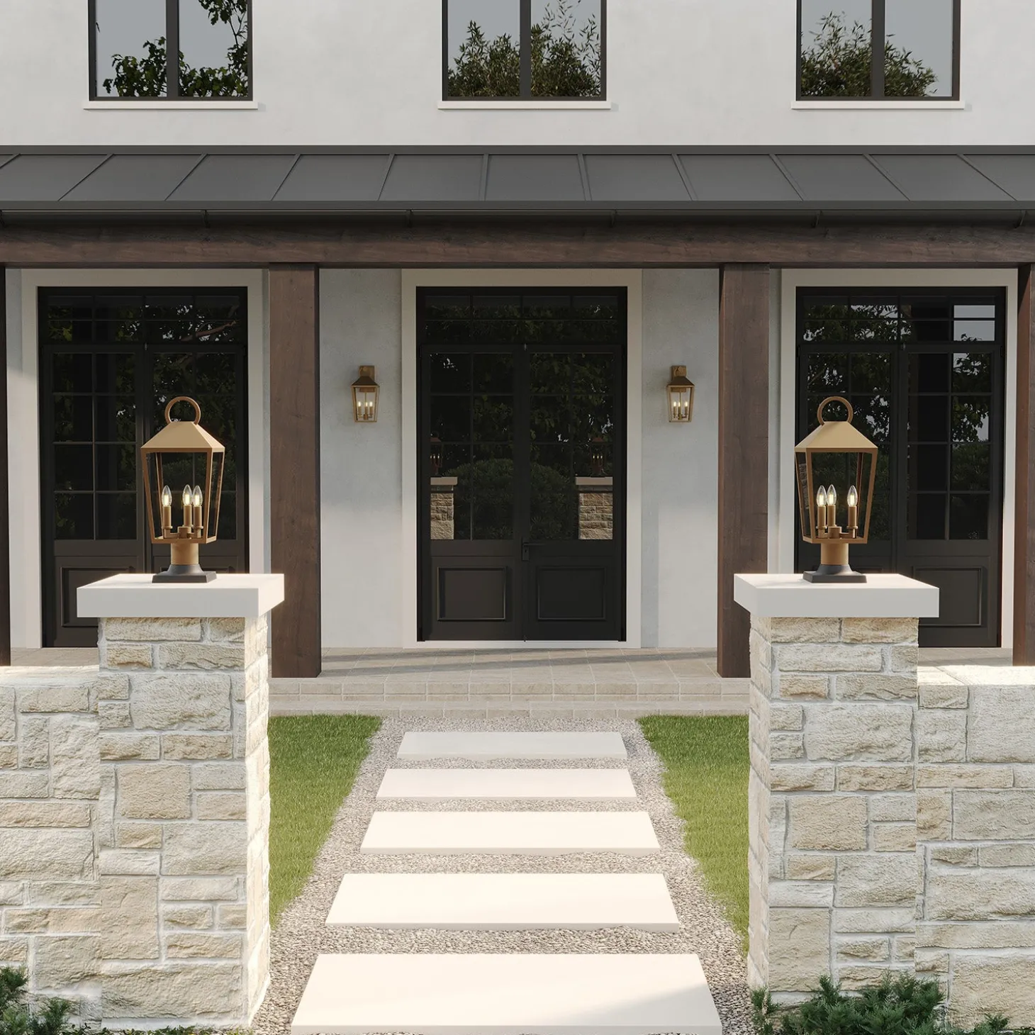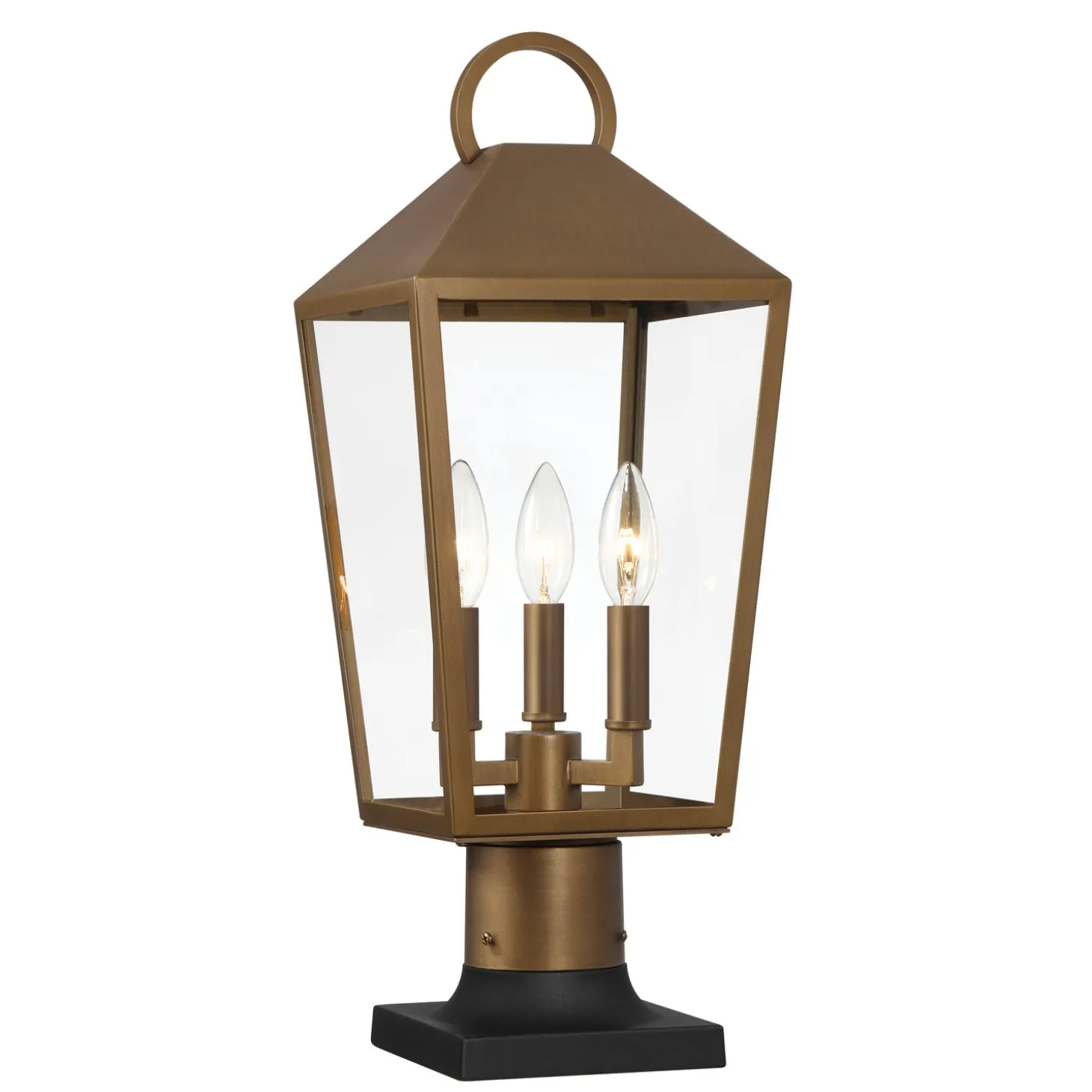 The Cole Outdoor Post Light is a timeless and classic lantern design with a modern sensibility. A slightly tapered silhouette reveals simple lines that seamlessly frame clear glass side panels and three candelabra style bulbs. The 19.25″ tall outdoor post light is topped with a weatherproof canopy that blends harmoniously with the frame and accentuates the arching ring detail. This sturdy outdoor light is designed to withstand the elements, complete with a burnished brass, powder-coated finish, and wet-rating. This outdoor light will add a charming appeal to any front yard, walkway, or outdoor living space. This versatile fixture can be mounted atop a round metal post; alternately, it can be mounted to other surfaces with a pier mount. Both mounting options are sold separately and come in matte black. This outdoor post light is part of the larger Cole Outdoor Lighting collection, including wall and hanging lights to complete your exterior lighting project.