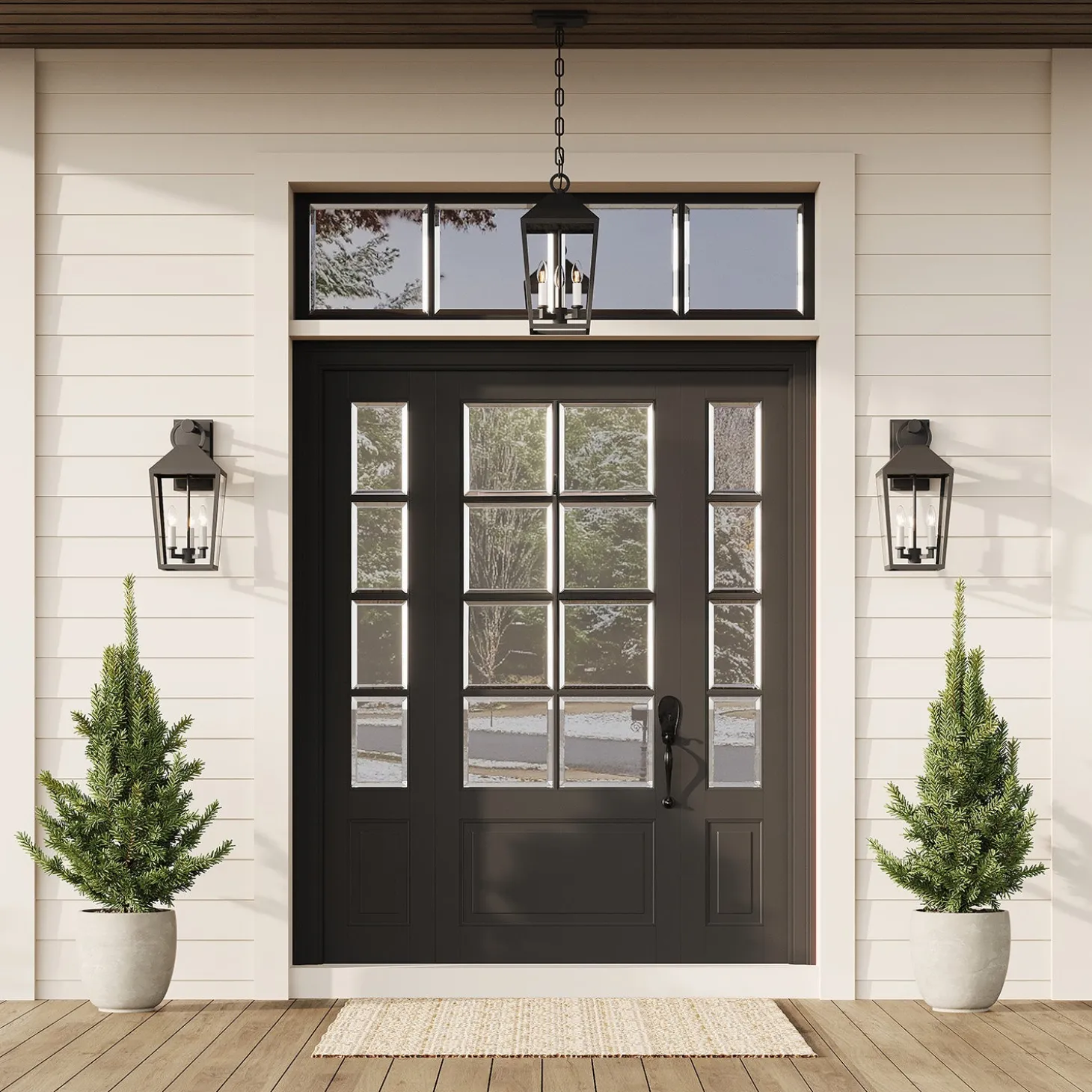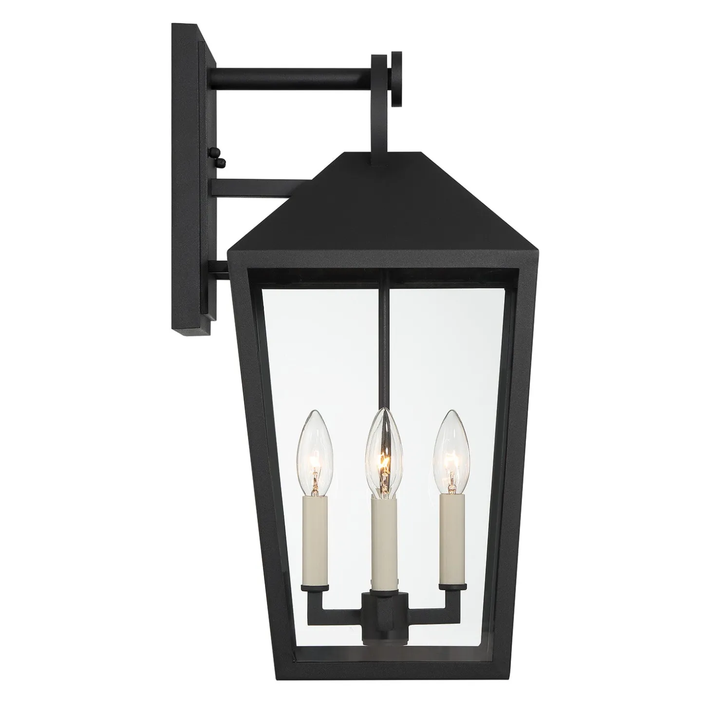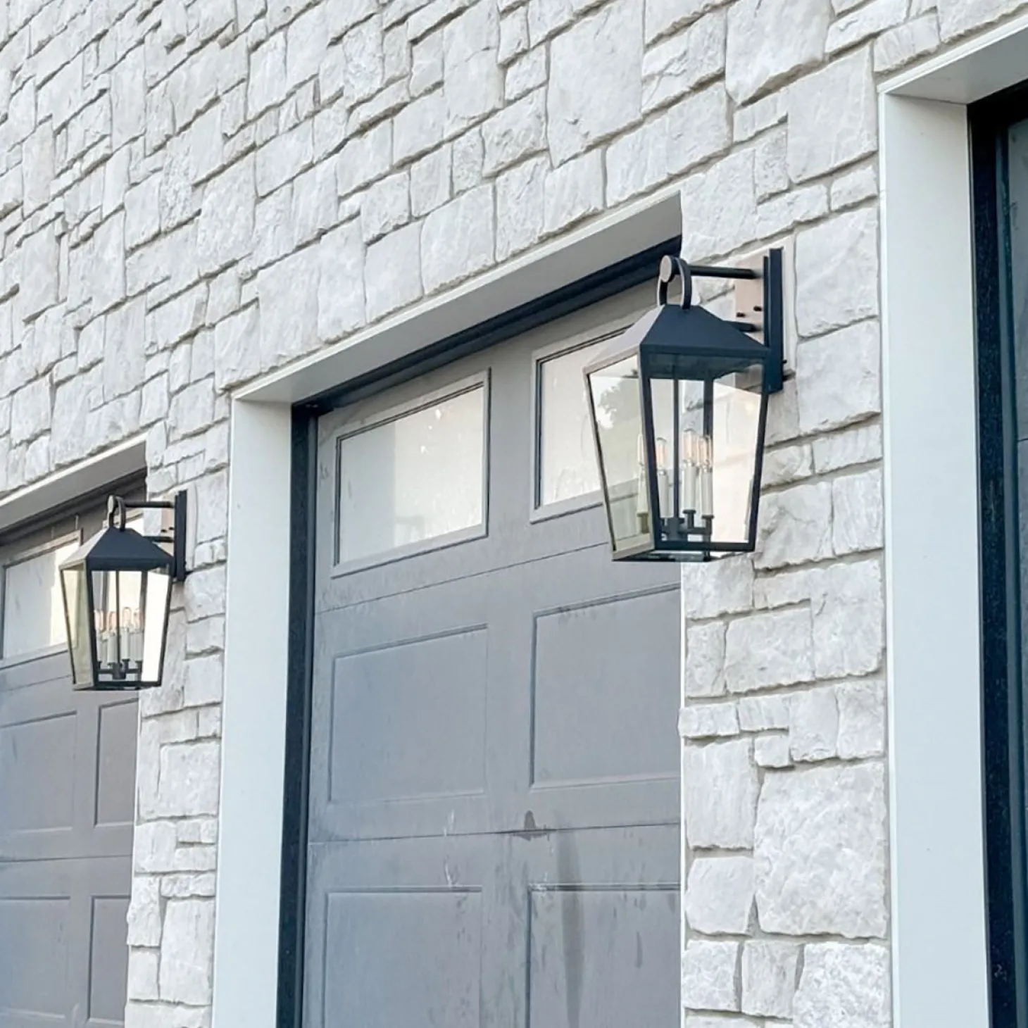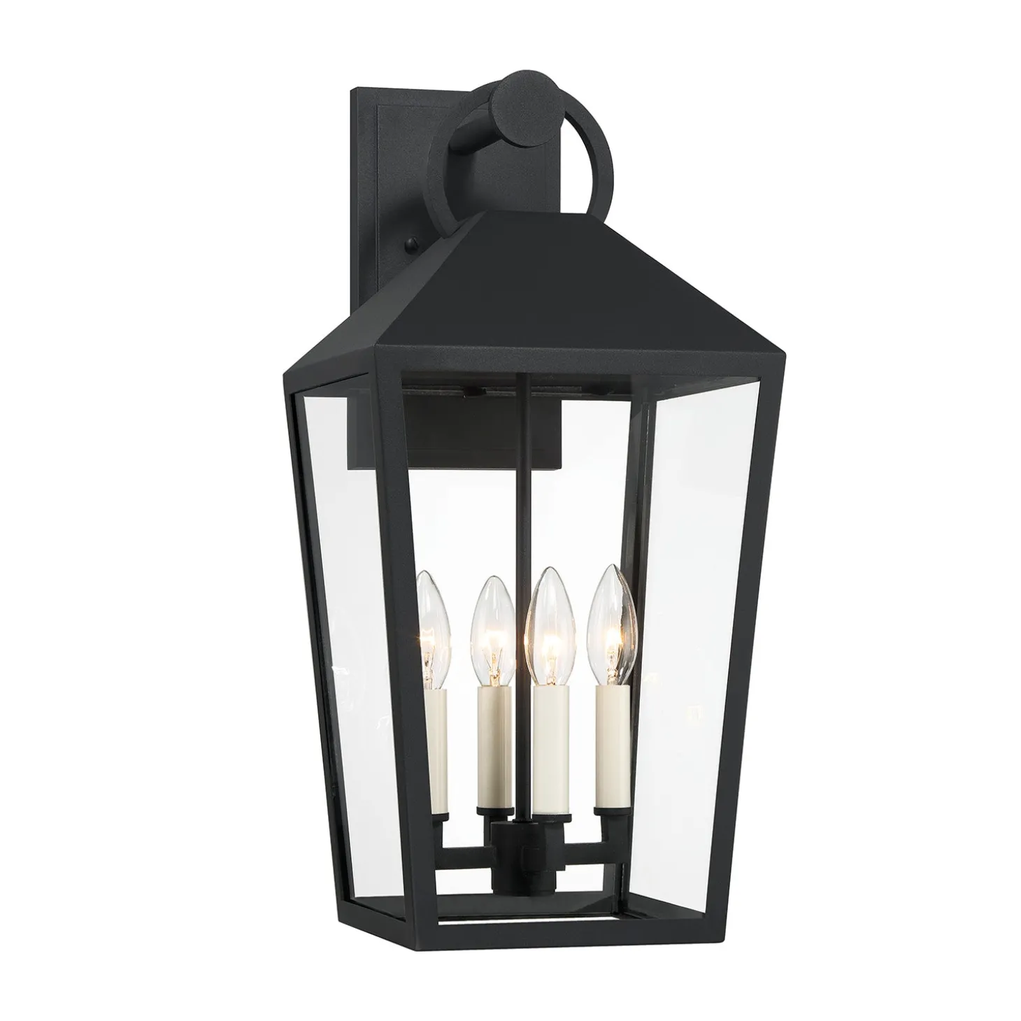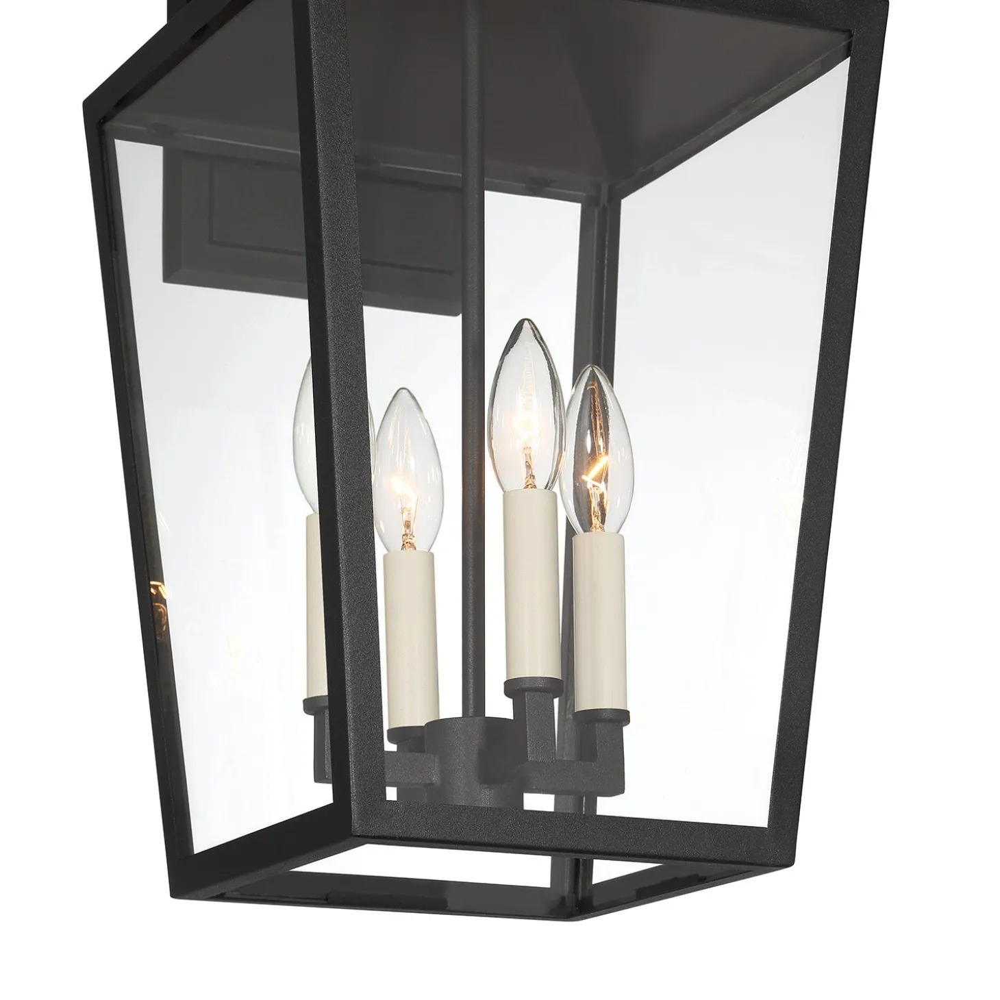 • Outdoor 21.5″ wall-mounted light features four candelabra bulbs set in a classic lantern style metal and glass fixture and finished in matte black