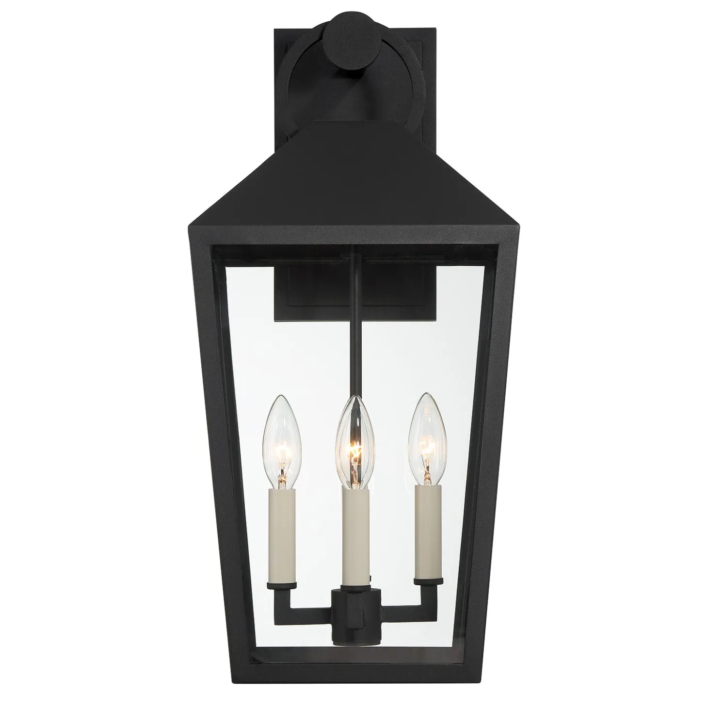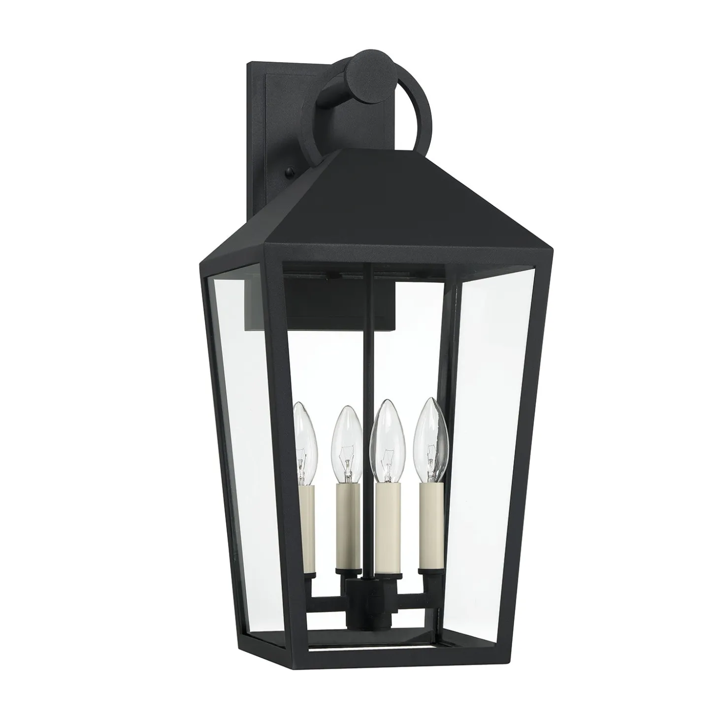 The Cole Outdoor Large 21.5″ Wall Light is a timeless and classic lantern design with a modern sensibility. A slightly tapered silhouette reveals simple lines that seamlessly frame clear glass side panels and four candelabra style bulbs, housed in cream-colored sleeves. This outdoor wall fixture is topped with a weatherproof canopy that blends harmoniously with the frame and accentuates the arching ring detail. This sturdy outdoor light is designed to withstand the elements complete with a matte black, powder-coated finish, and is wet-rated. Perfect for illuminating an entryway, lighting a patio, or in pairs flanking garage doors, this large outdoor wall light is part of the larger Cole Outdoor Lighting collection, including post and hanging lights to complete your exterior lighting project.