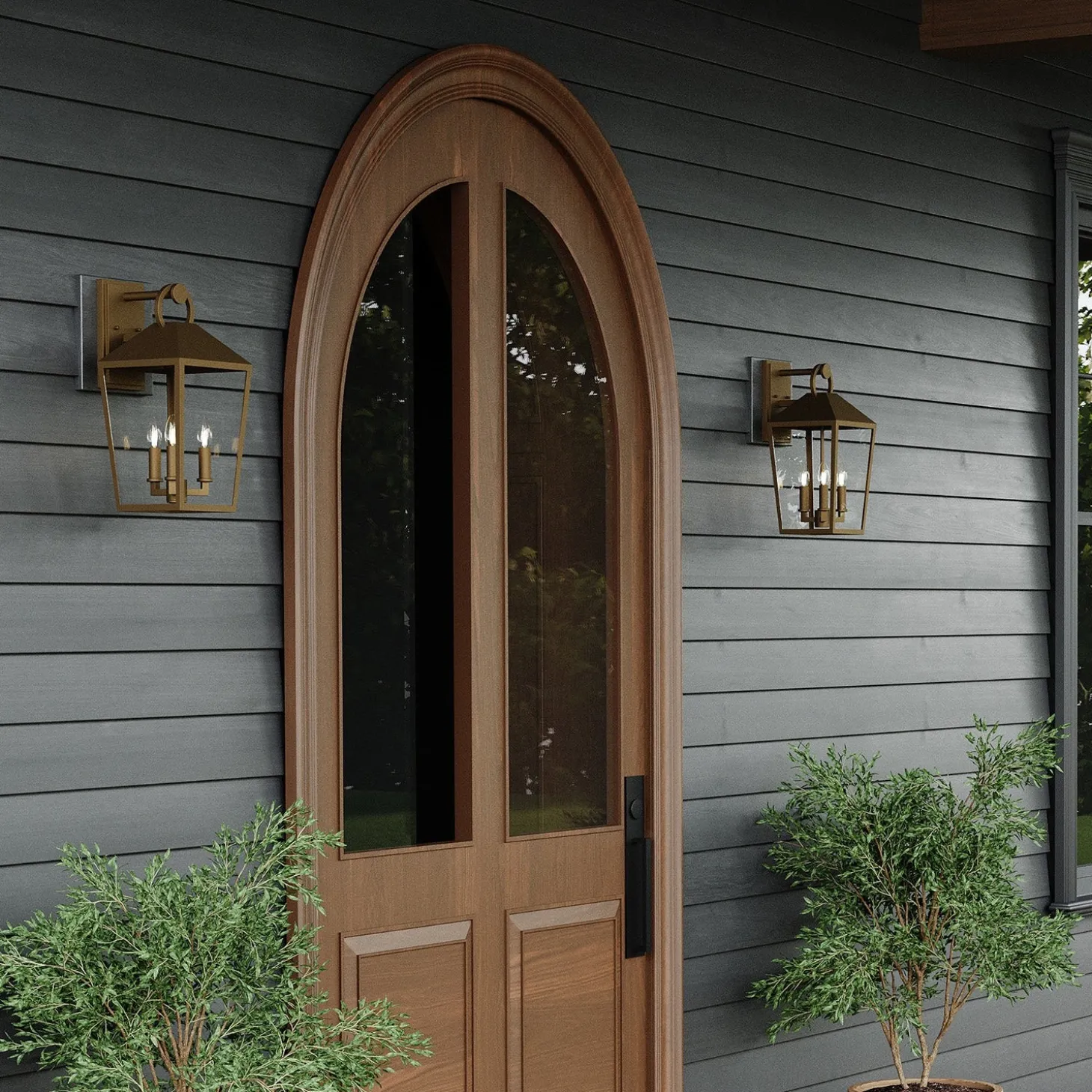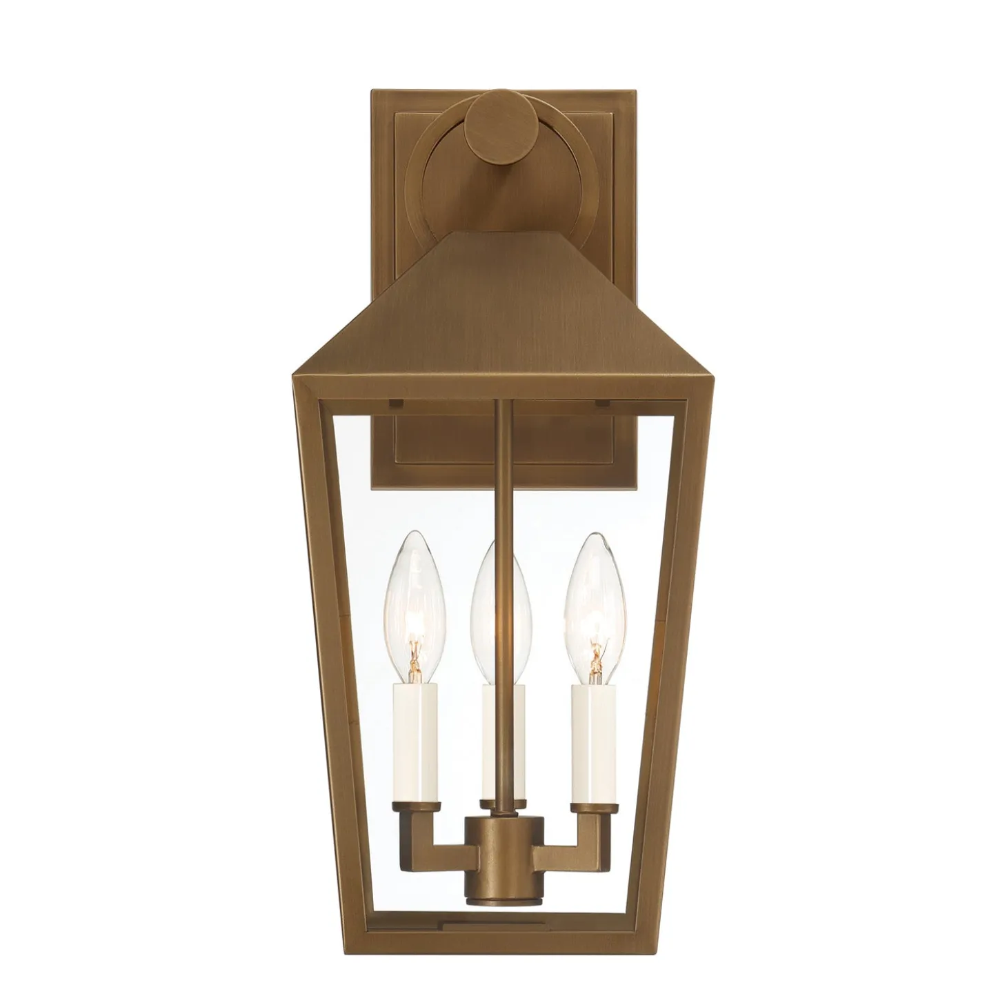 The Cole Outdoor Medium 17″ Wall Light is a timeless and classic lantern design with a modern sensibility. A slightly tapered silhouette reveals simple lines that seamlessly frame clear glass side panels and three candelabra style bulbs, housed in burnished brass or cream-colored sleeves (both included). This outdoor wall fixture is topped with a weatherproof canopy that blends harmoniously with the frame and accentuates the arching ring detail. This sturdy outdoor light is designed to withstand the elements complete with a burnished brass, powder-coated finish, and is wet-rated. Perfect for illuminating an entryway, lighting a patio, or in pairs flanking garage doors, this medium outdoor wall light is part of the larger Cole Outdoor Lighting collection, including post and hanging lights to complete your exterior lighting project.
